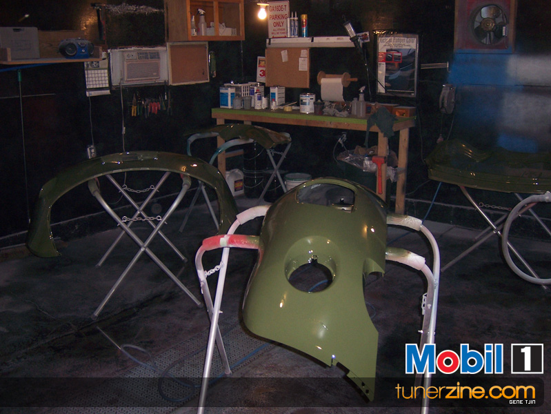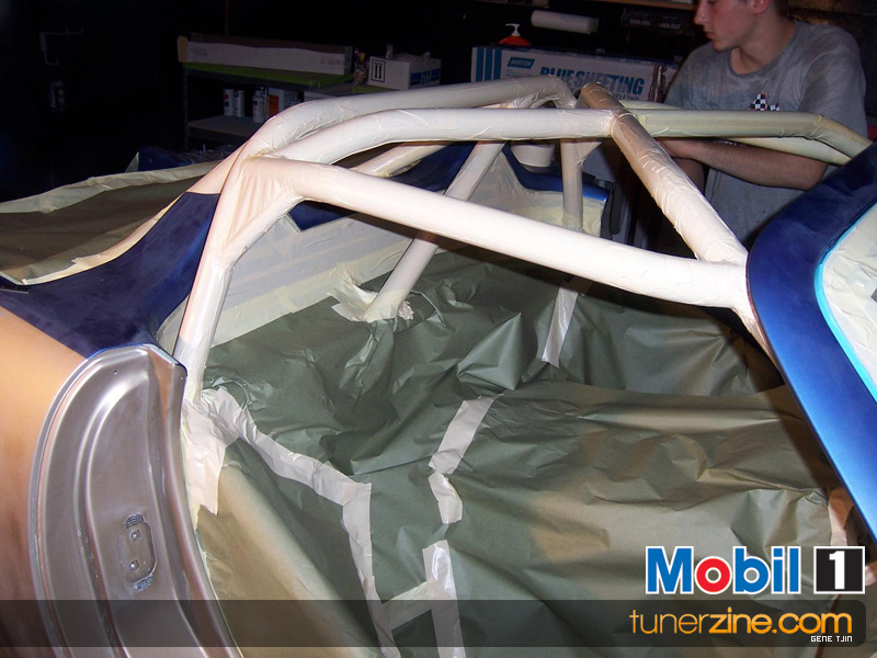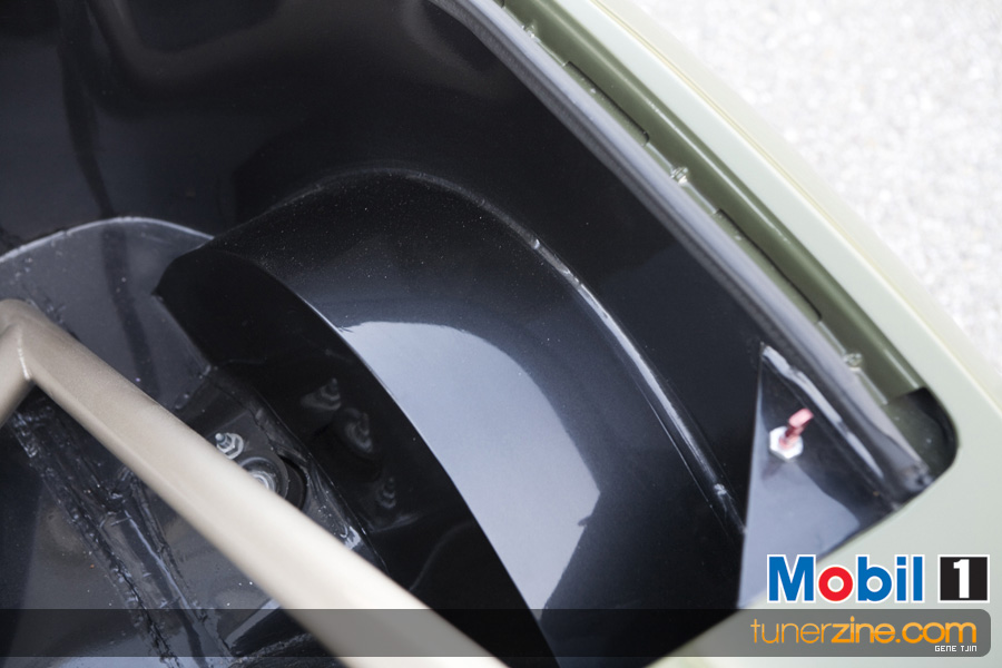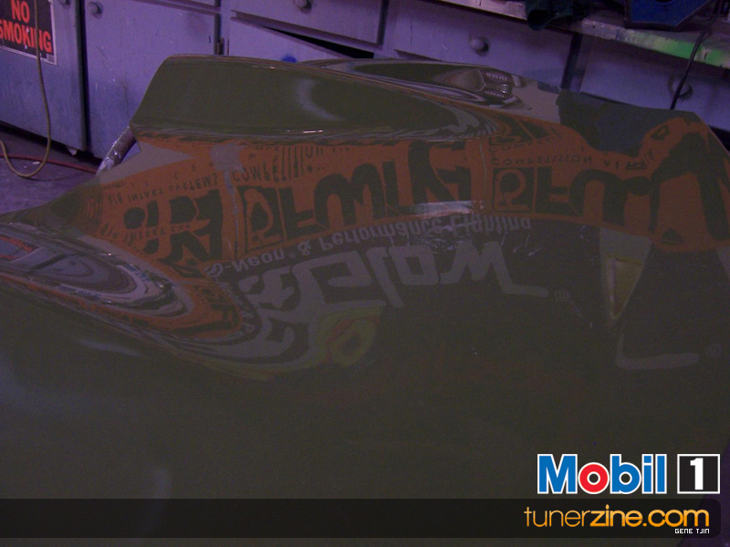Once all the metal fabrication was completed the Mobil 1 Solstice was dropped of at Autobody and Paint by Dlight. Before the three different colors of paint were sprayed onto the Solstice Dlight made sure that all the bodywork was up to par. The interior of the car is covered in a custom PPG gunmetal, the Unique roll cage is covered in a PPG champagne finish, and the body of the Solstice was covered in several layers of PPG Ninja Green paint. Before the car was cleared, world-renowned pin stripped Jeff Styles did his thing and laid down an insane black pin strip which covered the sides, hood, and deck lid of the Solstice.