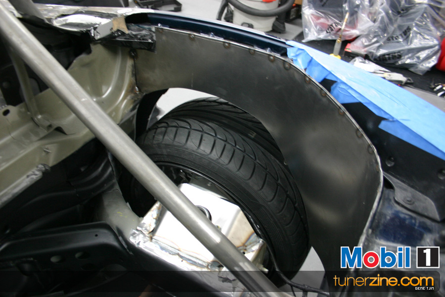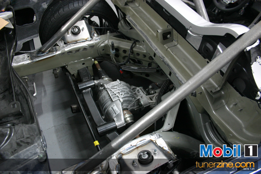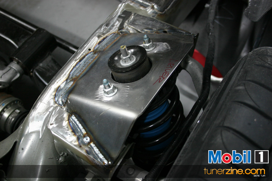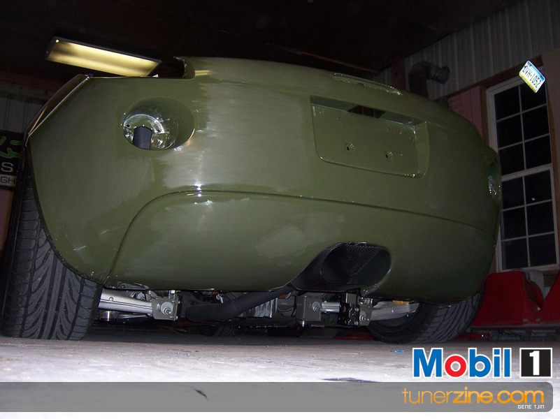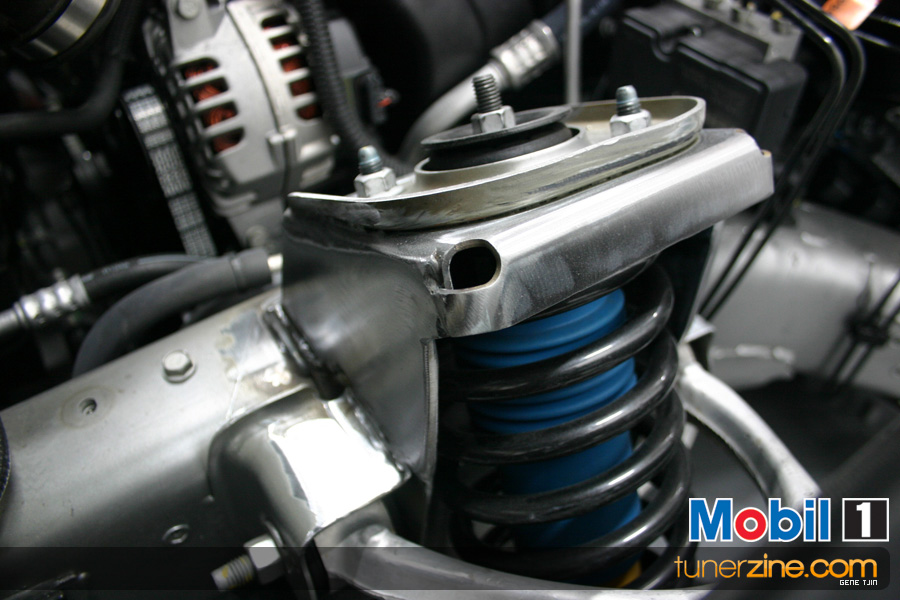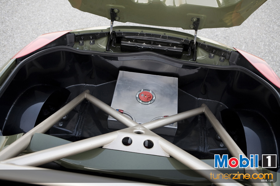As we stated earlier Unique was responsible for most of the build-up of the Mobil 1 Solstice. They started things off with the exterior by customizing the front bumper, side skirts, front fenders, and rear bumper. The front bumper and fenders feature custom black powder coated mesh grilles, while the rear bumper now accommodates a single triangular shaped exhaust tip. Other customized fabrication work includes the all-metal doors, window trim, a-pillar surroundings and the removal of the stock mirrors. These modifications were so well executed that most people don’t even notice the subtle changes, but we did and we wanted to make sure that we pointed them out to our readers. Unique was also responsible for the one-off rear deck lid and metal wing that the Mobil 1 Solstice now sports. If you are wondering why they had to customize the rear deck lid, look no further then the insane tubes that make up the signature Unique roll cage. Unique completely gutted the interior of the Mobil 1 Solstice, including the door panels, lower section of the dash and carpet. Once those stock parts were removed it was time for them to fabricate a one-off 6pt roll cage that flows nicely throughout the cockpit and rear section of the Solstice. The entire plastic rear section of the Solstice was completely cut out and replaced with 18-gauge metal. After the roll cage was completely welded in Unique then tackled the suspension of the Mobil 1 Solstice. They didn’t want to go the traditional route of adjustable coilovers, so instead they opted to raise the front and rear shock towers. The front shock towers were raised approximately 2.5″ and the rears 2″. Going this route was not only unheard of in the import scene, but it also allowed the Solstice to look slammed, but yet retains its drivability.