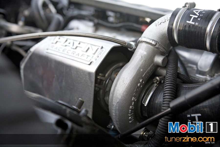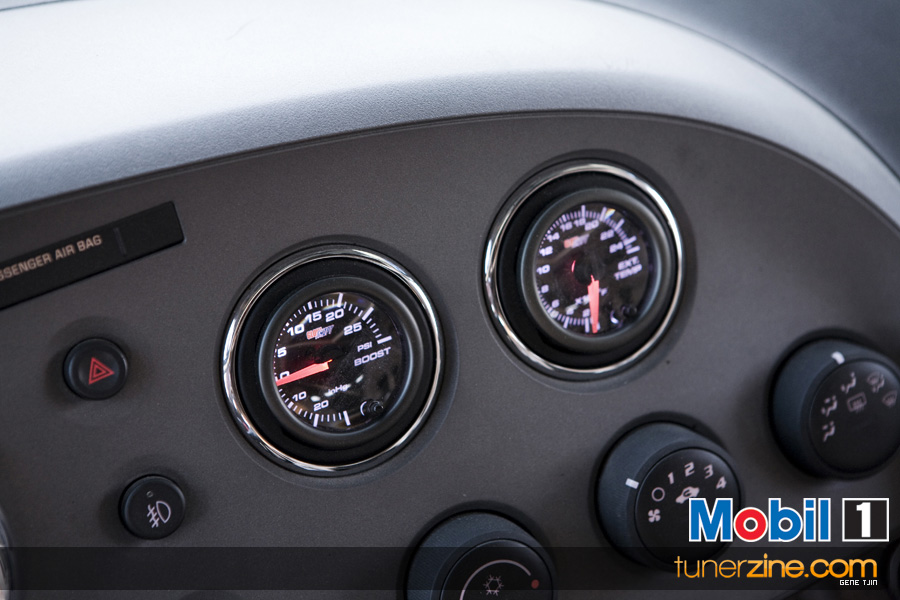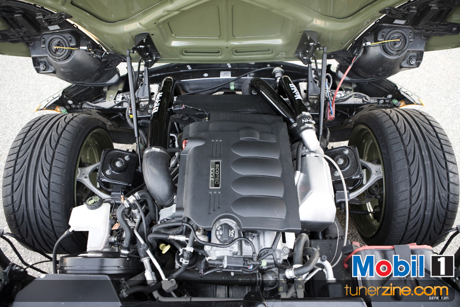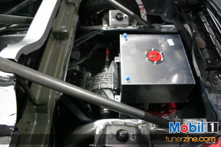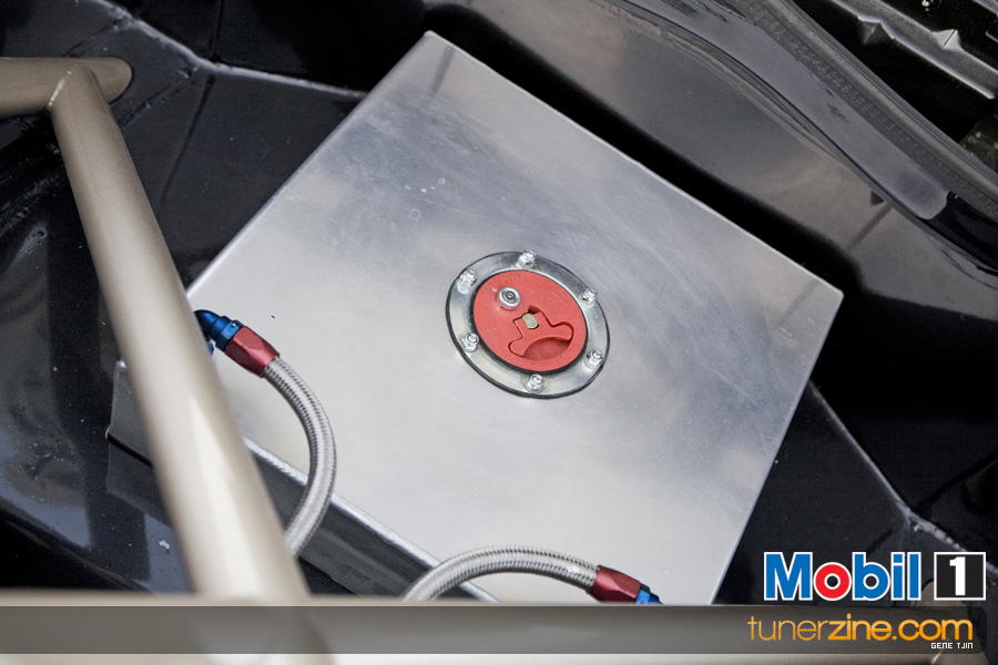 With the suspension and brakes installed, it was time to bolt on the HAHN turbo kit. The Mobil 1 Solstice came equipped with a 177hp stock 2.4L ECOTECH motor. Even though the car was decently quick, the guys wanted some more bang for the buck, and that is where HANH Racecraft came in. The HAHN turbo kit came with all the goodies, and the installation was straight forward and to the point (check out page xxx for a complete guide to installing a HAHN turbo kit on your Solstice). The HAHN turbo kit is matched up with a Magnaflow exhaust, and together they brought the Mobil 1 horsepower numbers up from 177 to 284. Before they tested the car on the dyno and took it out for a spin the guys from Unique swapped out the old oil in favor of new Mobil 1 synthetic oil. These guys were adamant on telling us that Mobil 1 technology maximizes performance and gives advanced protection against heat and stress, and that is why they use nothing but Mobil 1 in all their projects. Rounding off the performance goodies is a custom fuel-set featuring a Walbro 255 fuel pump, and 10-gallon fuel cell.