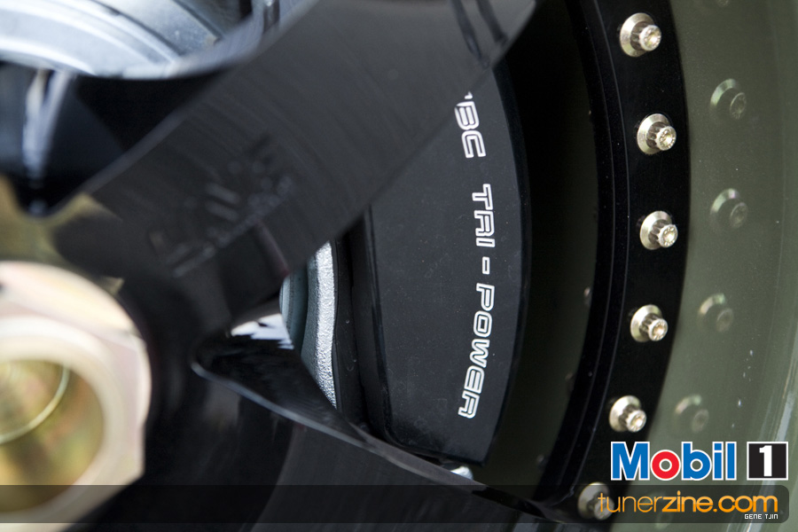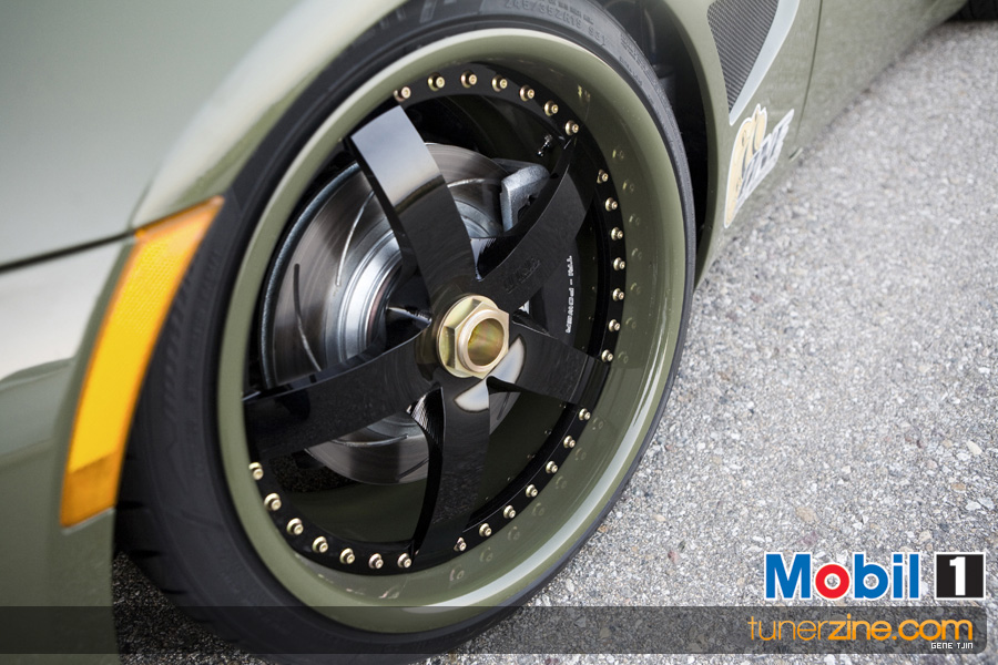 What makes this Mobil 1 Solstice project even more special is that it is the first car to be released to the public featuring the highly anticipated One Lug Wheels. The One Lug wheel set-up that you see on this Pontiac Solstice is not some custom set-up but it is a application that is now readily available to the automotive market. The gorgeous 5-spoke design wheels that are featured on the Mobil 1 Solstice are 19×8.5″ in the front and 19×11.5″ in the rear. They are matched up with 245/40-19″ and 275/35-19″ Falken tires. The 5-spoke centers of the One Lug Wheels were powder coated gloss black, while the lips are painted green to match the cars body. The One Lug center hub, lug nuts, and bolts were finished in their signature gold finish to add a fresh and aggressive look of these One Lug Wheels.