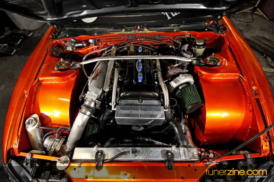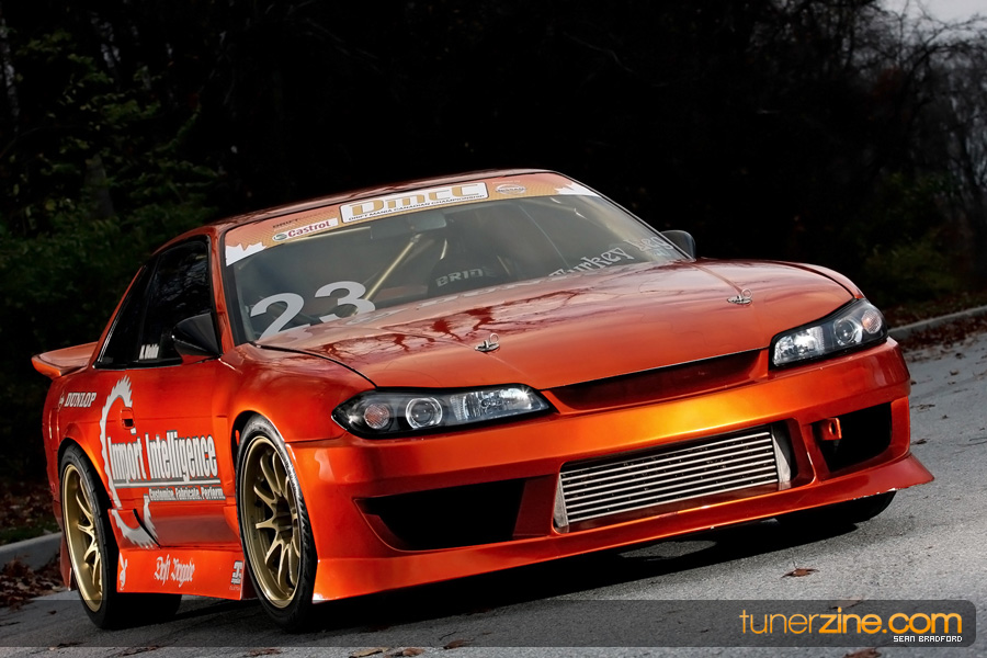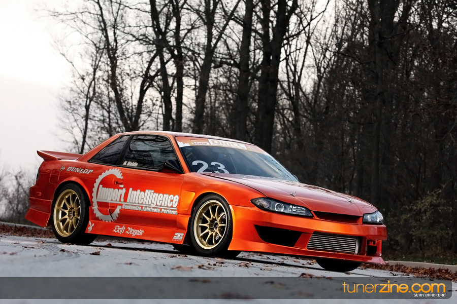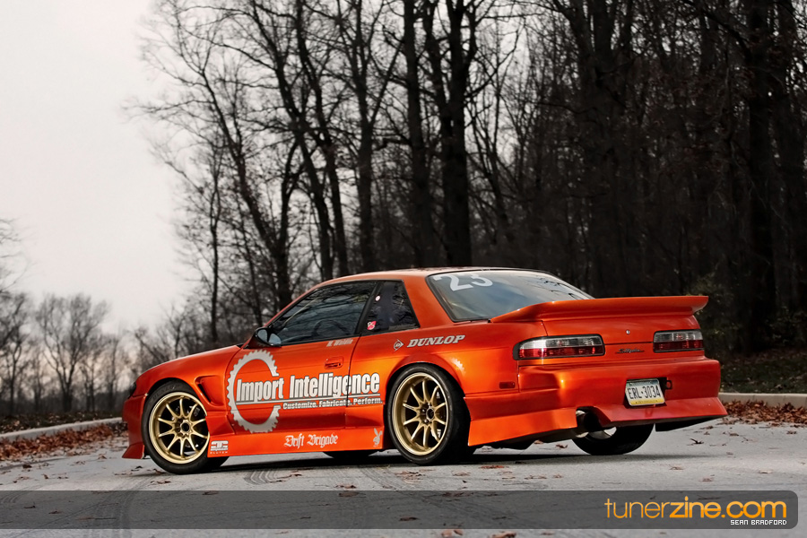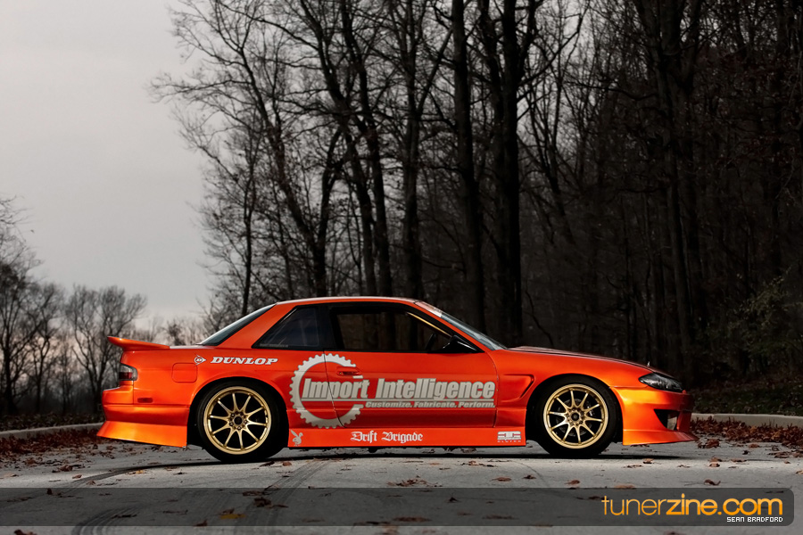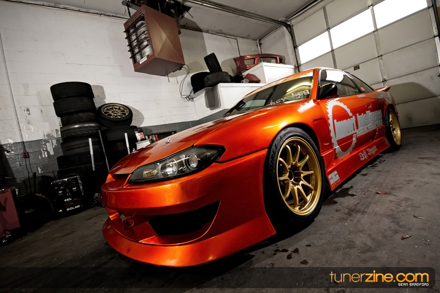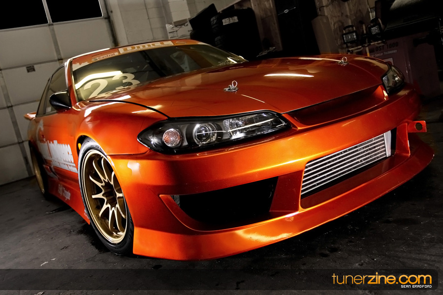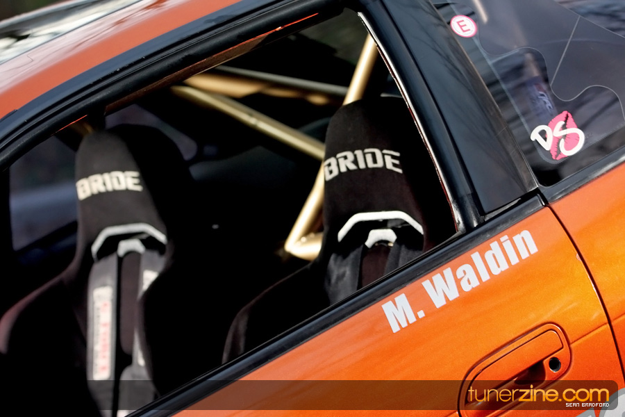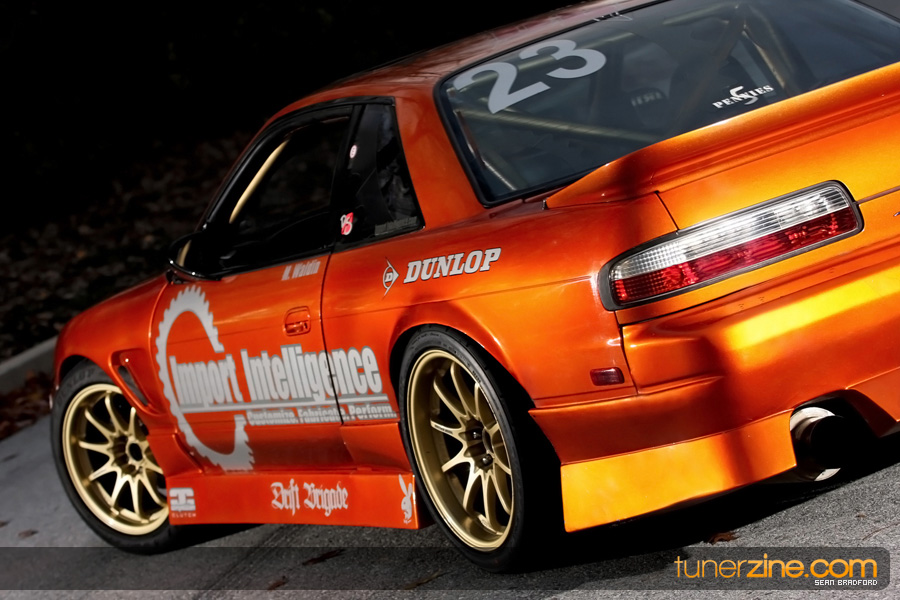 7 years ago, Matt Waldin purchased an S13 not knowing anything about it. But the second there were some organized drift events, he was hooked. Fast forward to present day and Waldin now owns and operates Import Intelligence, making a name for himself and his company out on the drifting scene. His S13 has come a long way too from the stock form that Waldin picked it up as. It’s now seen with a gorgeous S15 front end conversion by Origin Lab with a full Stylish body kit to accent the already attractive lines. Finishing off the exterior though is a beautiful House of Kolor Orange Kandy paint job that really makes this S13.5 scream on and off the track. It’s hard not to notice Waldin’s car as it gracefully swings itself sideways at events nationwide. A painted carbon fiber hood frees up some weight while a Bomex Drift spoiler adds a little more in the aerostyling department.
