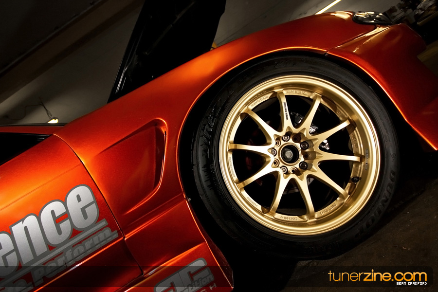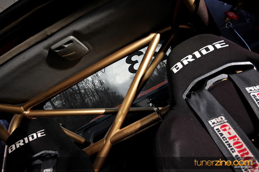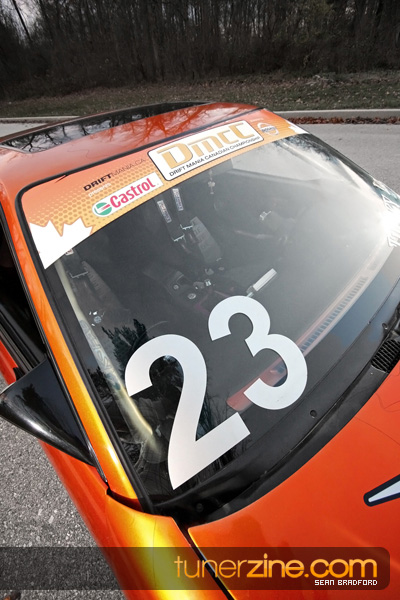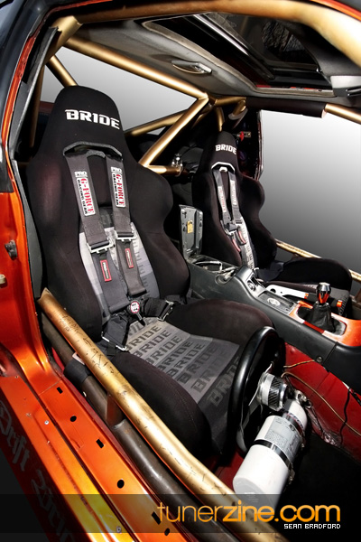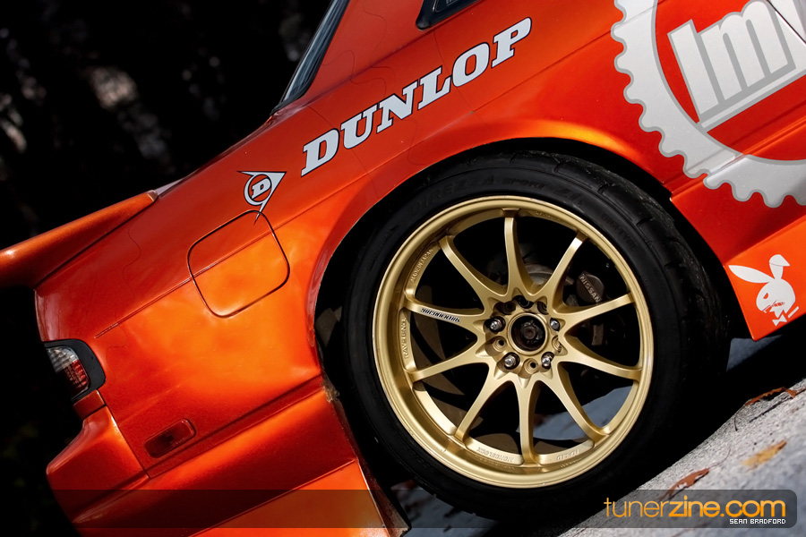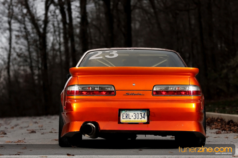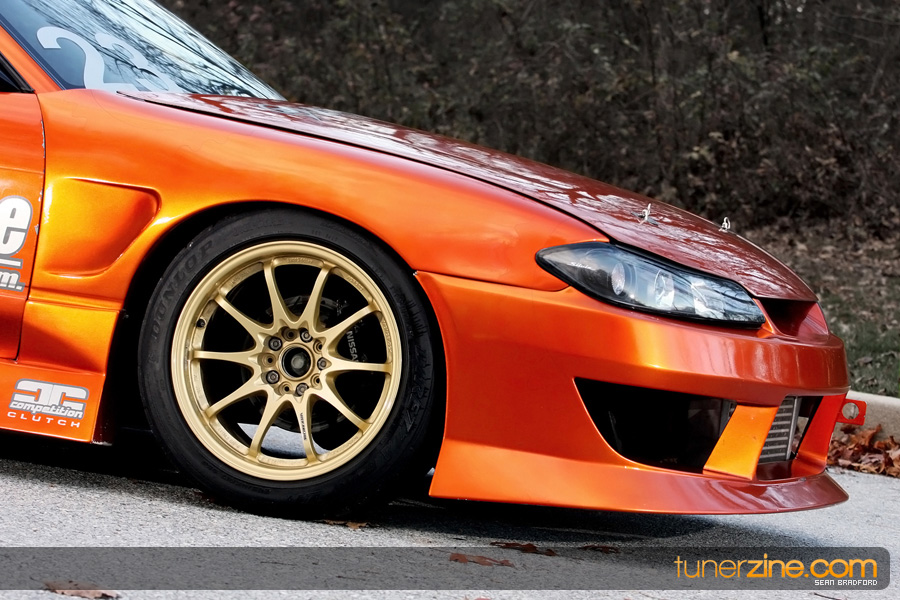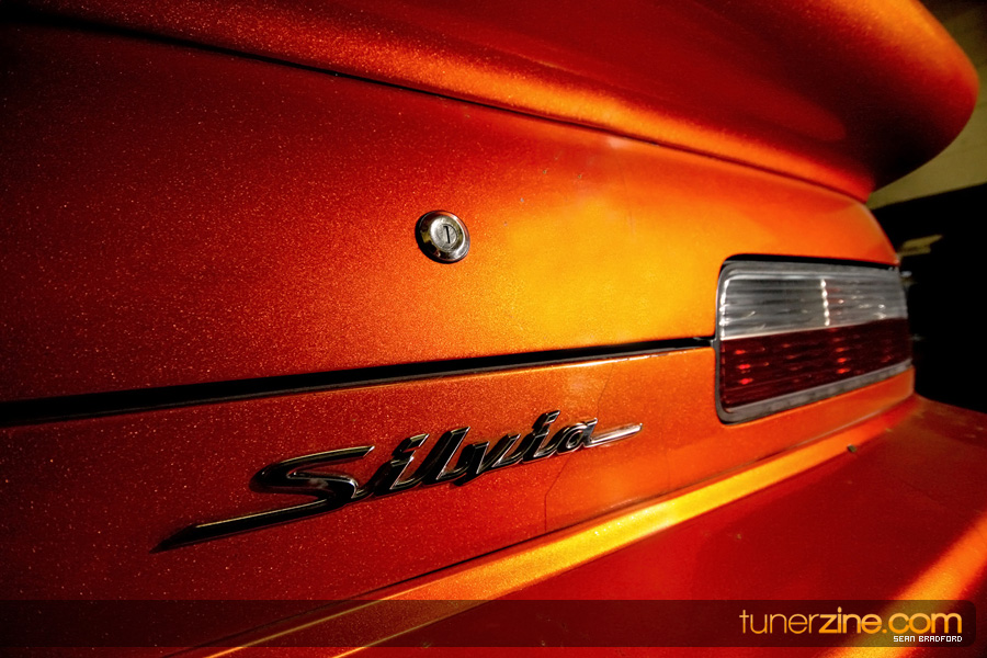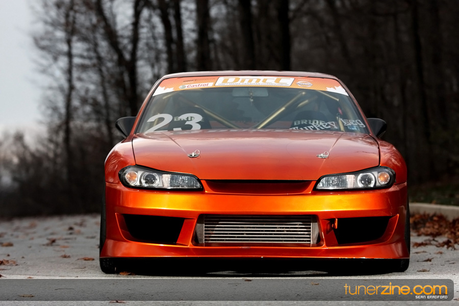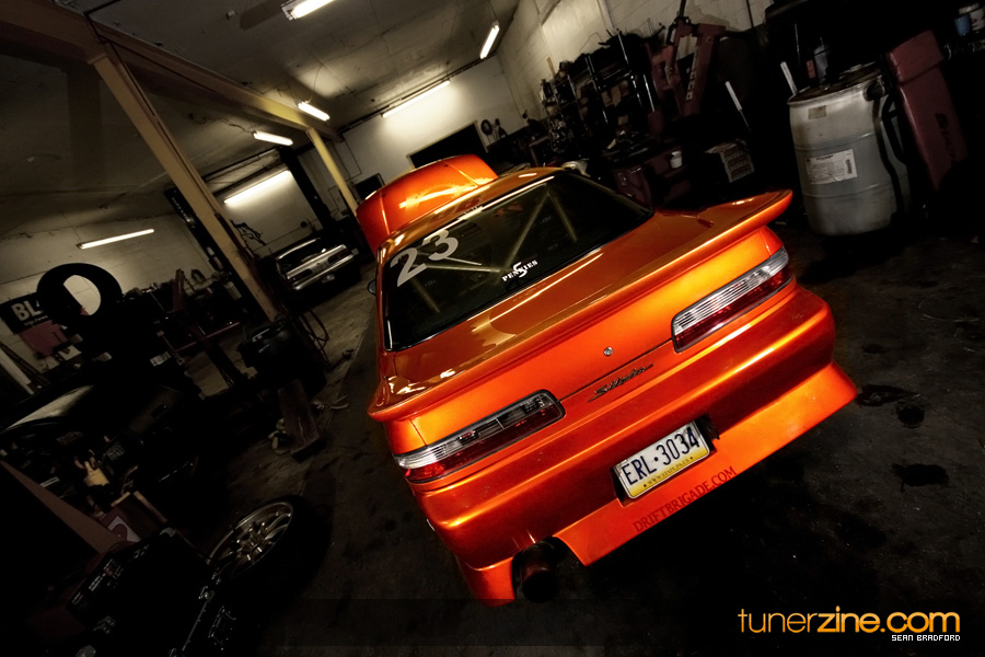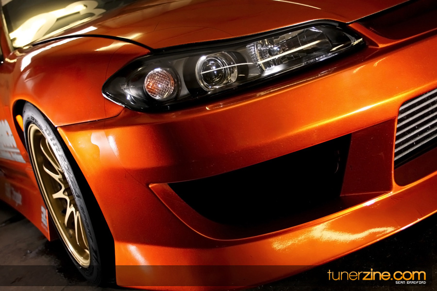 7 years ago, Matt Waldin purchased an S13 not knowing anything about it. But the second there were some organized drift events, he was hooked. Fast forward to present day and Waldin now owns and operates Import Intelligence, making a name for himself and his company out on the drifting scene. His S13 has come a long way too from the stock form that Waldin picked it up as. It’s now seen with a gorgeous S15 front end conversion by Origin Lab with a full Stylish body kit to accent the already attractive lines. Finishing off the exterior though is a beautiful House of Kolor Orange Kandy paint job that really makes this S13.5 scream on and off the track. It’s hard not to notice Waldin’s car as it gracefully swings itself sideways at events nationwide. A painted carbon fiber hood frees up some weight while a Bomex Drift spoiler adds a little more in the aerostyling department.