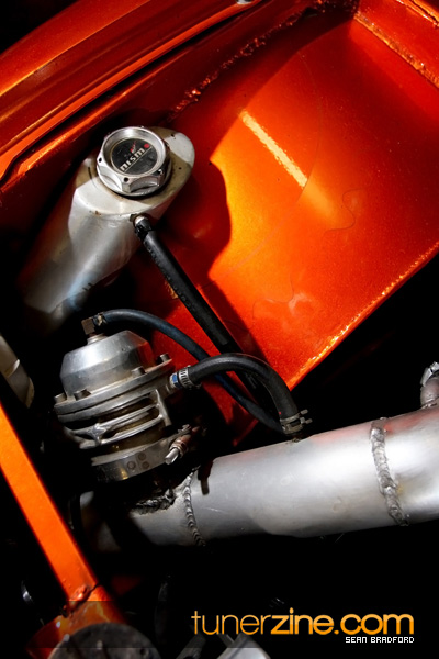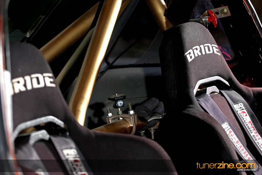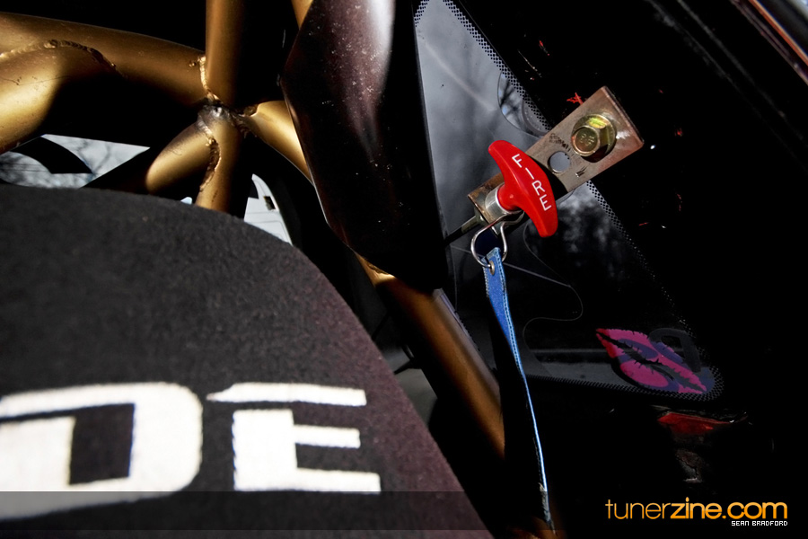 Under the hood is where all the beauty happens though. A typical SR20DET swap has been tossed in with all the bells and whistles imaginable. Full-Race comes into play with their GT3071 top moutn turbo setup fully equipped with twin scroll setup. Forged rods along with a set of S15 pistons, HKS camshafts and BC valve springs make up the internals on the engine. Helping pump out 434whp on pump gas is a GReddy intercooler, Koyo radiator, Walbro fuel pump, JGY Customs fuel rail and MSD 72# fuel injectors. Turbo goods include a Turbonetics Godzilla blow-off valve and TiAL 44mm external wastegate. Out the rear is the ever popular A’PEXi N1 exhaust system. A Haltech E-11 engine management helps keep this SR tuned the way Waldin needs it to tear up the strip.