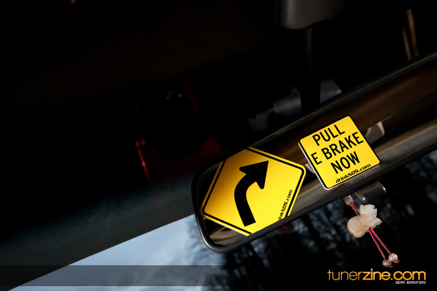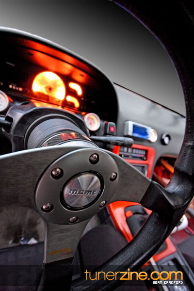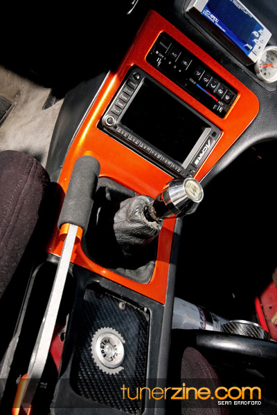Up front is a set of 17×9-inch Volk Racing CE28N wheels in a contrasting gold finish. Back in the rear are wider and larger 18×9.5-inch CE28Ns. Waldin’s rubber of choice are currently Dunlops with 275/35/18 in the rear and 245/45/17 in the front. In the interior, Import Intelligence shows off what they’re all about with their needle and gauges kit. An A’PEXi AVC-R boost controller along with Autometer’s boost, pyrometer and oil pressure gauges make up the electronics. Waldin also opted to move the start key to the center console and swapped out the stock e-brake for a K-Sport piece and the stock shift knob for a GReddy unit.