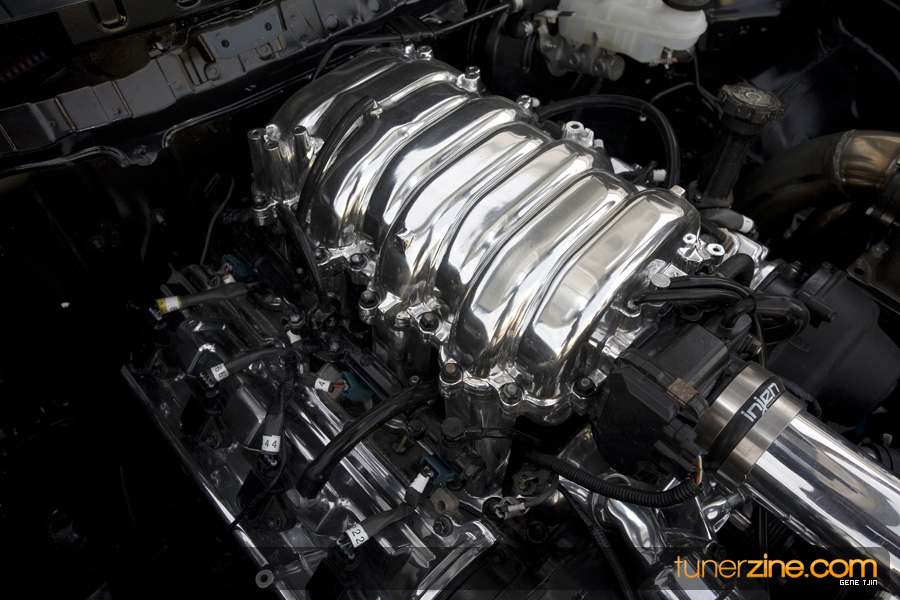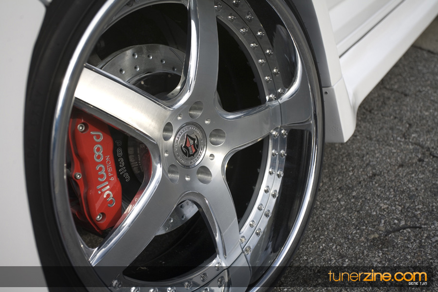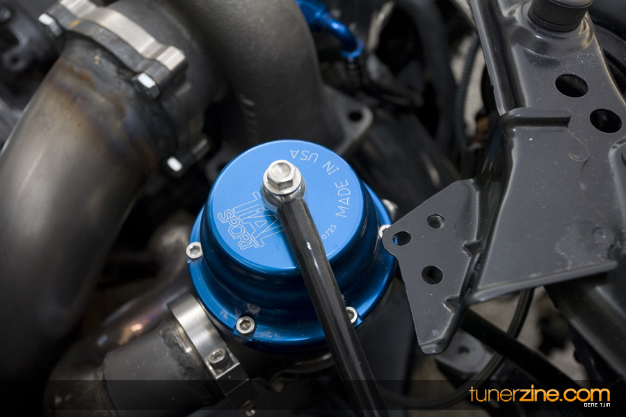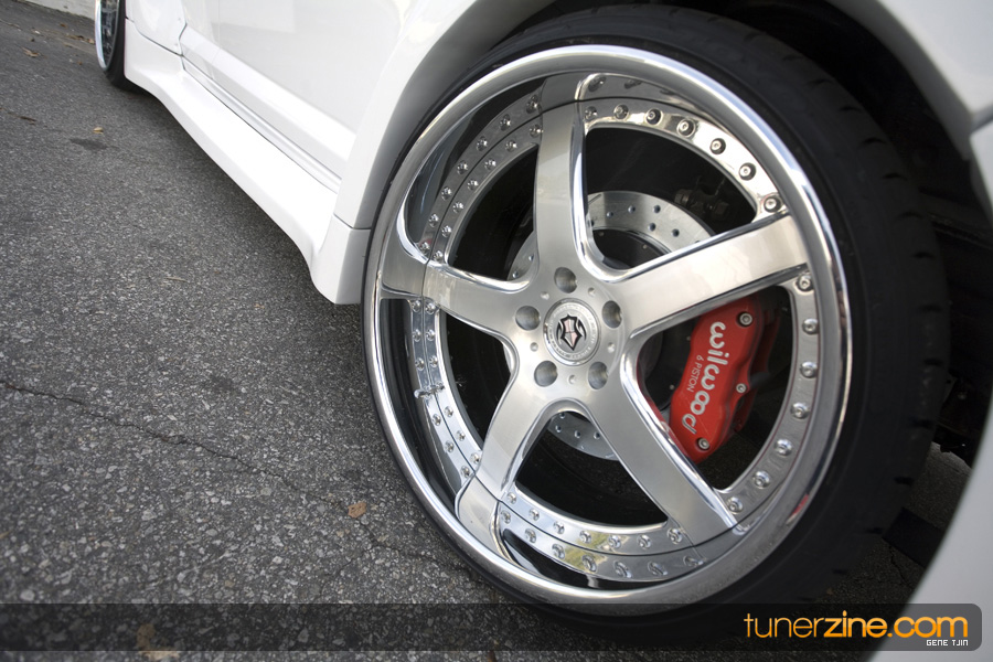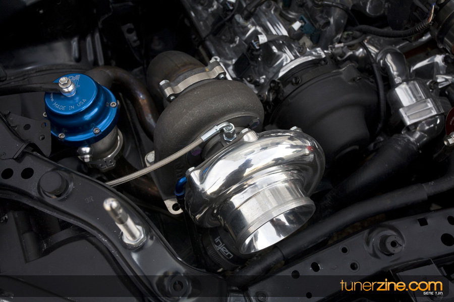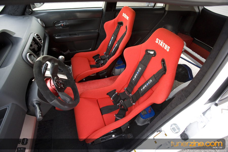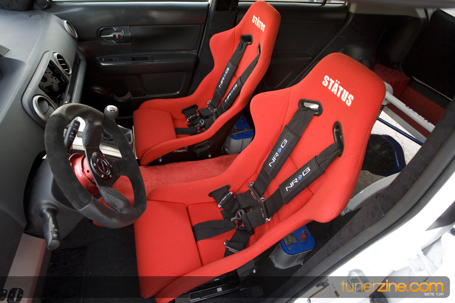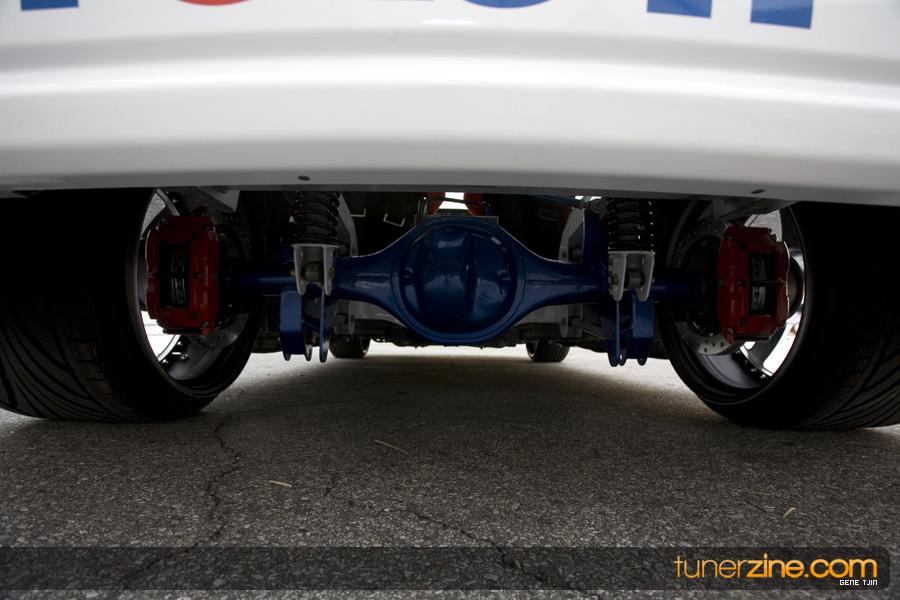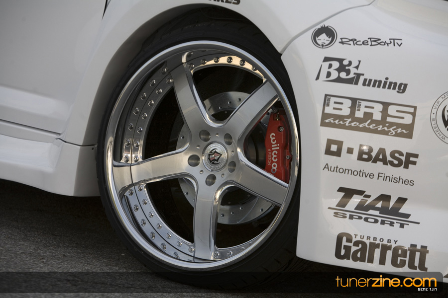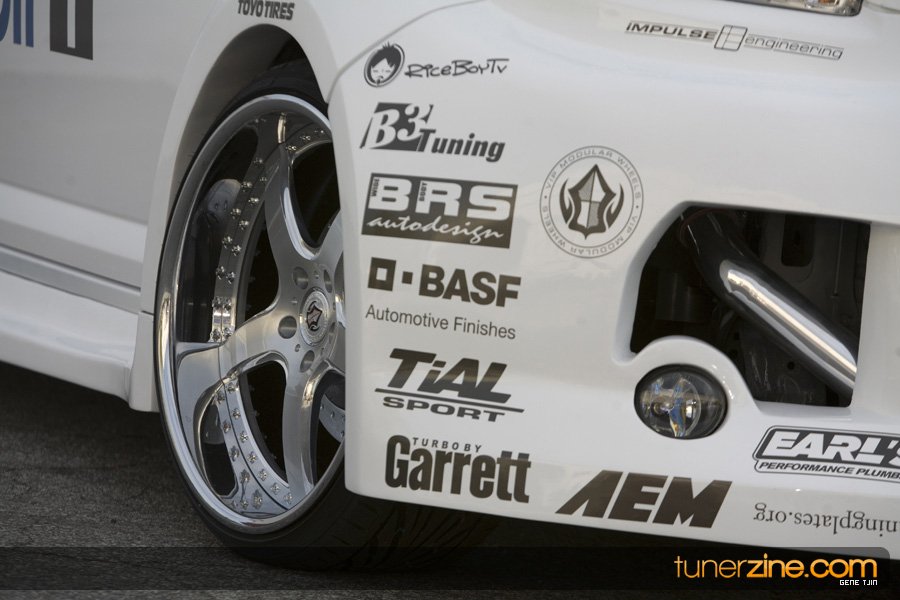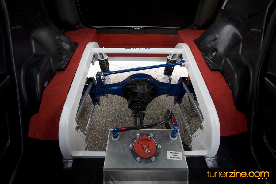 The interior of the project didn’t skip a beat either, with Status carbon fiber racing seats and a plethora of NRG goods. Their carbon quick release is attached to their steering wheel and their harnesses drape over the lightweight Status seats. Handling boost is World Electronics’ TBC-1 boost gauge, and a series of Autometer gauges can also be seen. Peeking towards the rear one will be quick to notice a full 4-link rear suspension setup with a custom fuel cell mount. Along with a custom 6-point roll cage, the chassis was also stitch welded for extra rigidity. Full car audio has been handled thanks to Brovox and a Sony head unit.