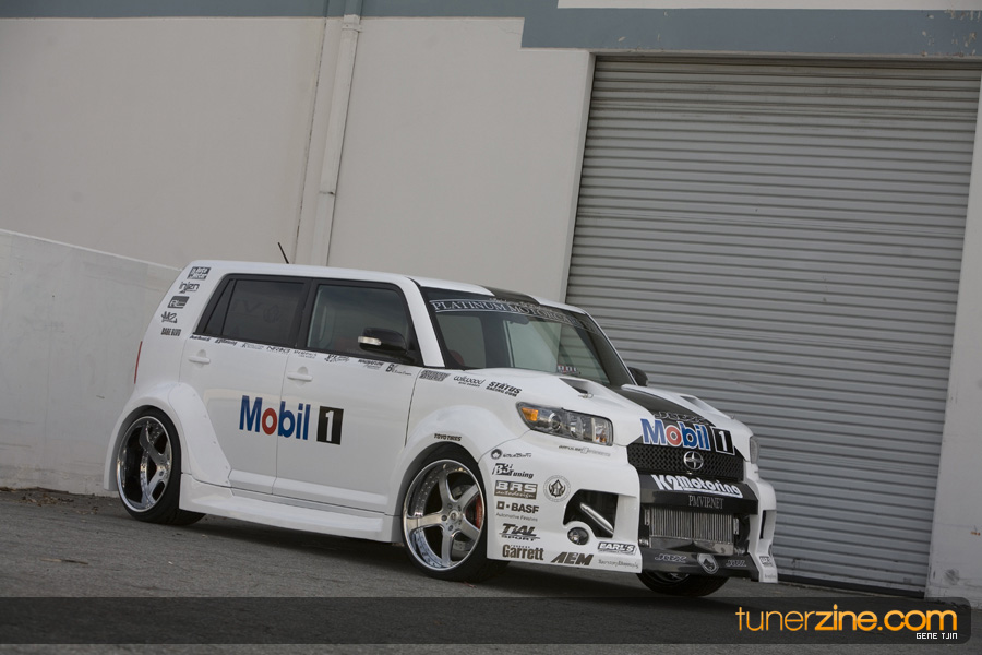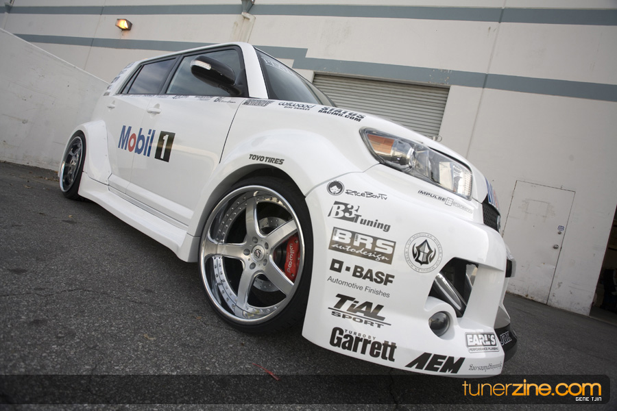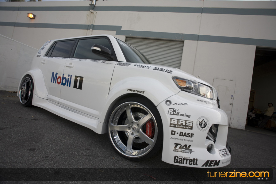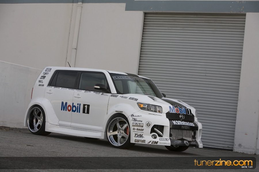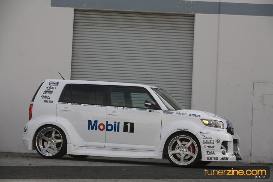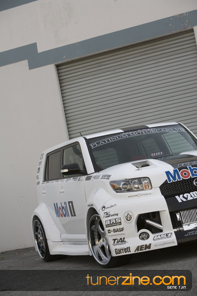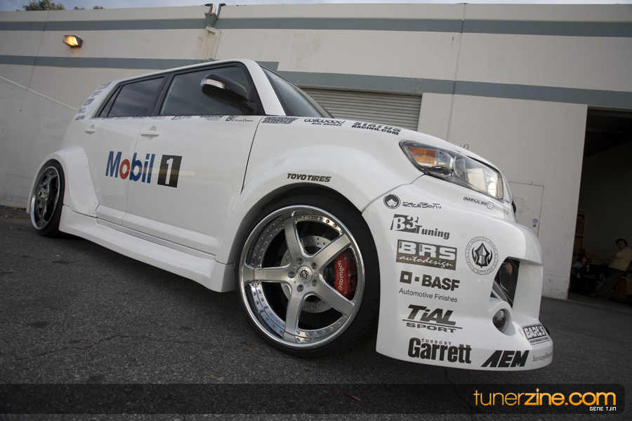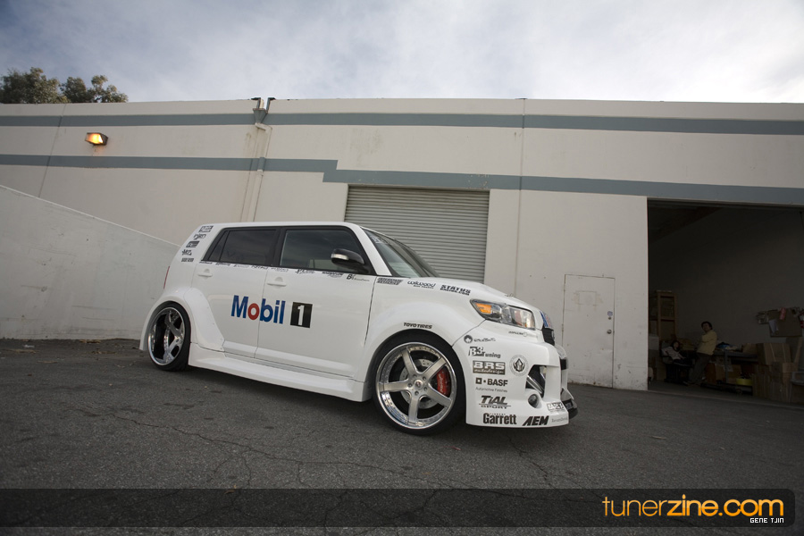While this was all going on, the minds were churning and the decision was made that a Toyota Tundra motor would find its way into the Scion xB’s engine bay. That’s right, a full RWD transformation would take place from this Scion’s much bigger brother, the Toyota Tundra. This would be the first real show car with a Tundra motor, and in months to follow many so called show car builders jumped on the Tundra bandwagon. So the swap was planned and executed flawlessly, but it wasn’t enough for the minds at Mobil 1. I mean, what good is showing off just a basic engine to prove Mobil 1’s exemplary performance? The motor received a complete overhaul with new ACL bearings, Calico coatings, a Brian Crower Stroker kit fully equipped with JE pistons and resleeved by Darton. The final motor was assembled by ERL and it was time to push over 600whp to it. On went a custom turbo kit with a Garrett GT35R turbo mounted on a Phoenix Turbo / Peak Boost manifold at the heart of it all. TiAL’s 44mm wastegate along with their 50mm blow off valve were a natural fit. Additional power is thrown at the motor with a Nitrous Express 100-shot. The entire fuel system has been completely overhauled as well with BDL goods: fuel filter, fuel rail, fuel pressure regulator. RC’s 1000cc injectors ensures this motor is built to last. Last second bolt-ons to complete the job was a Peak Boost intake manifold and BDL throttle body. The result? Well needless to say this is one mean xB ready to punish the pavement.