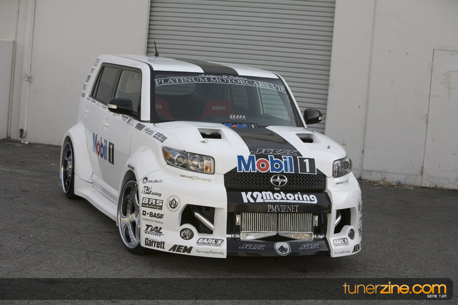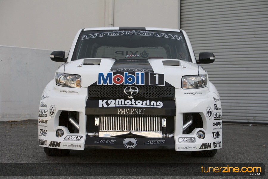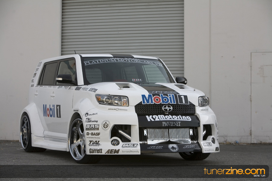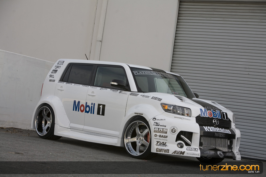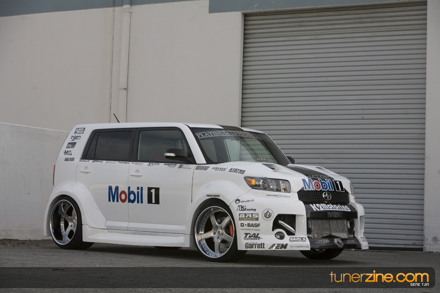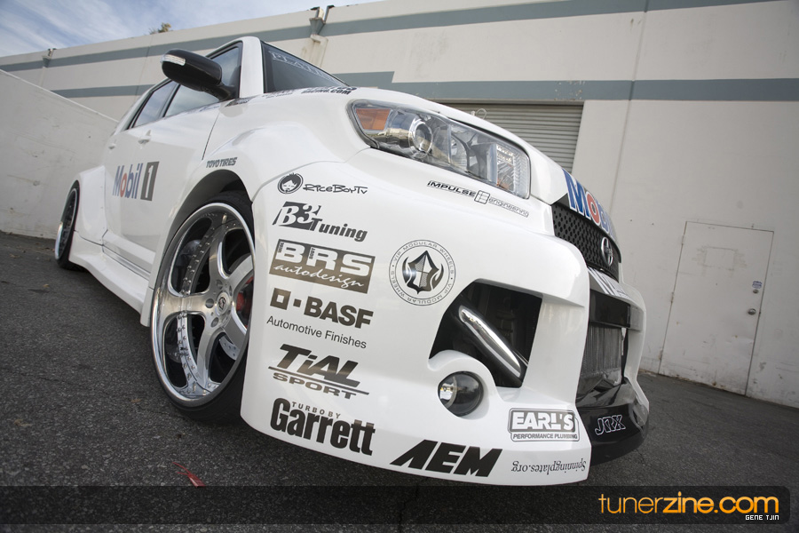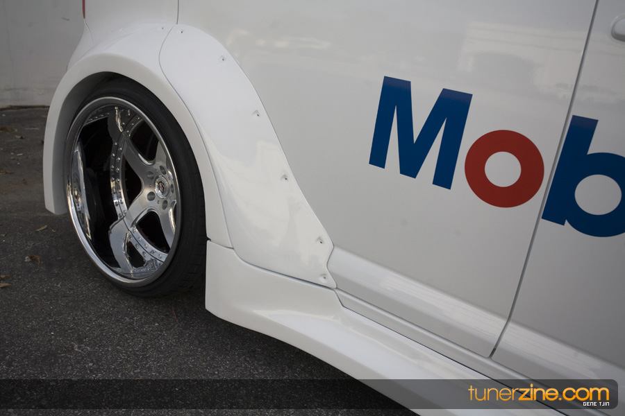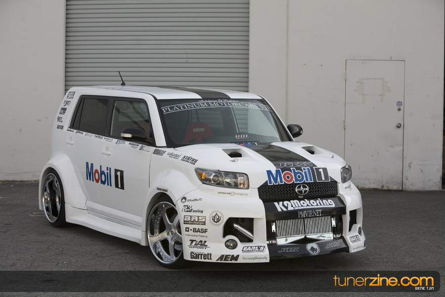 While this was all going on, the minds were churning and the decision was made that a Toyota Tundra motor would find its way into the Scion xB’s engine bay. That’s right, a full RWD transformation would take place from this Scion’s much bigger brother, the Toyota Tundra. This would be the first real show car with a Tundra motor, and in months to follow many so called show car builders jumped on the Tundra bandwagon. So the swap was planned and executed flawlessly, but it wasn’t enough for the minds at Mobil 1. I mean, what good is showing off just a basic engine to prove Mobil 1’s exemplary performance? The motor received a complete overhaul with new ACL bearings, Calico coatings, a Brian Crower Stroker kit fully equipped with JE pistons and resleeved by Darton. The final motor was assembled by ERL and it was time to push over 600whp to it. On went a custom turbo kit with a Garrett GT35R turbo mounted on a Phoenix Turbo / Peak Boost manifold at the heart of it all. TiAL’s 44mm wastegate along with their 50mm blow off valve were a natural fit. Additional power is thrown at the motor with a Nitrous Express 100-shot. The entire fuel system has been completely overhauled as well with BDL goods: fuel filter, fuel rail, fuel pressure regulator. RC’s 1000cc injectors ensures this motor is built to last. Last second bolt-ons to complete the job was a Peak Boost intake manifold and BDL throttle body. The result? Well needless to say this is one mean xB ready to punish the pavement.
