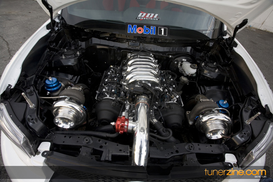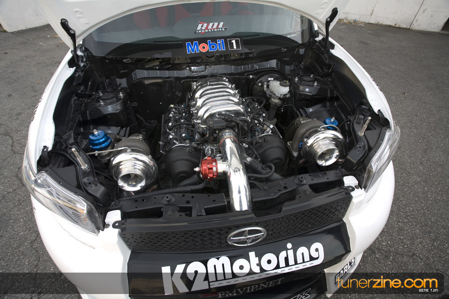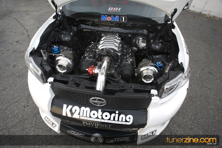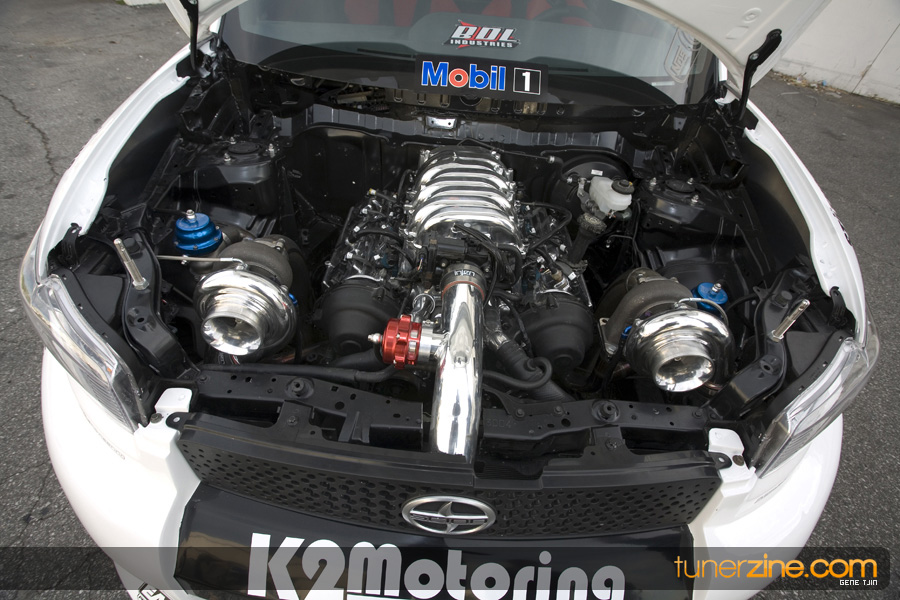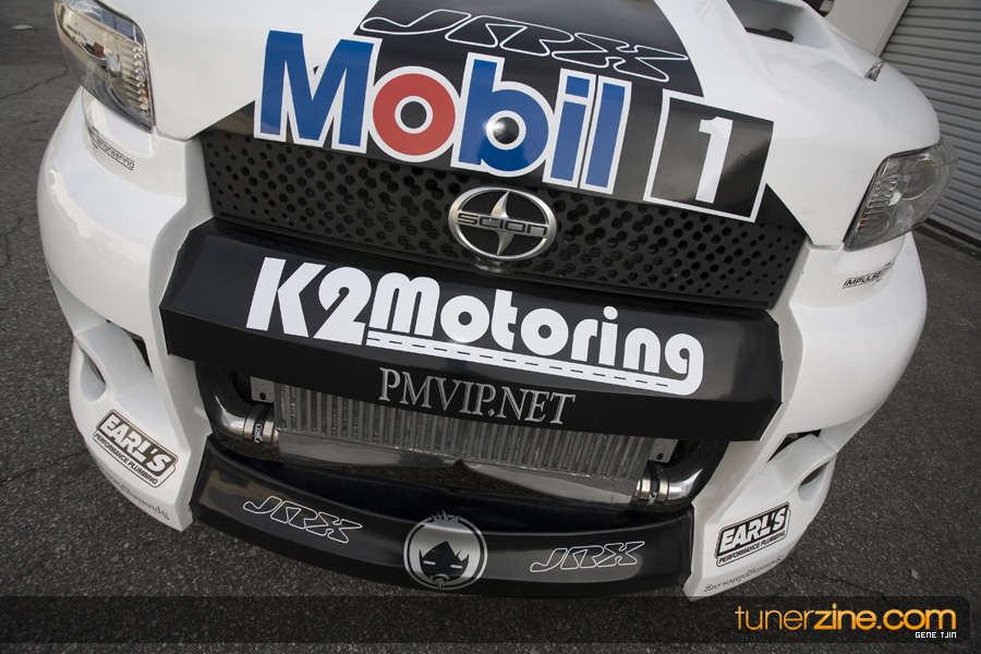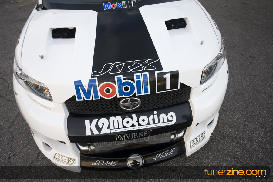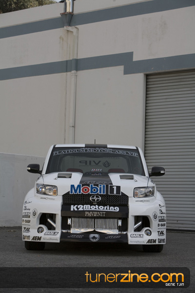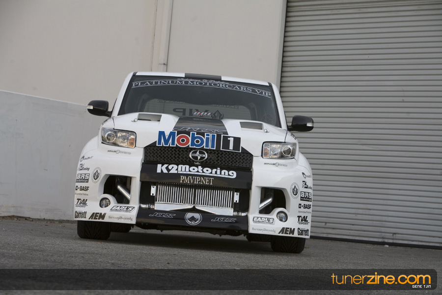While this was all going on, the minds were churning and the decision was made that a Toyota Tundra motor would find its way into the Scion xB’s engine bay. That’s right, a full RWD transformation would take place from this Scion’s much bigger brother, the Toyota Tundra. This would be the first real show car with a Tundra motor, and in months to follow many so called show car builders jumped on the Tundra bandwagon. So the swap was planned and executed flawlessly, but it wasn’t enough for the minds at Mobil 1. I mean, what good is showing off just a basic engine to prove Mobil 1’s exemplary performance? The motor received a complete overhaul with new ACL bearings, Calico coatings, a Brian Crower Stroker kit fully equipped with JE pistons and resleeved by Darton. The final motor was assembled by ERL and it was time to push over 600whp to it. On went a custom turbo kit with a Garrett GT35R turbo mounted on a Phoenix Turbo / Peak Boost manifold at the heart of it all. TiAL’s 44mm wastegate along with their 50mm blow off valve were a natural fit. Additional power is thrown at the motor with a Nitrous Express 100-shot. The entire fuel system has been completely overhauled as well with BDL goods: fuel filter, fuel rail, fuel pressure regulator. RC’s 1000cc injectors ensures this motor is built to last. Last second bolt-ons to complete the job was a Peak Boost intake manifold and BDL throttle body. The result? Well needless to say this is one mean xB ready to punish the pavement.