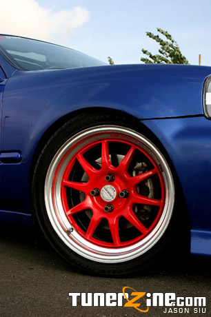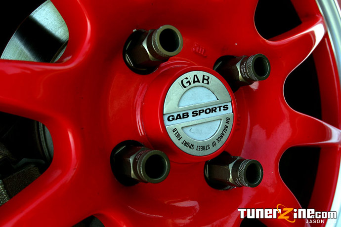 Now back to being a wheel whore, Mouse had gone through many many sets of wheels before sitting on the ones he’s comfortable with now. 16×7″ genuine GAB Sports Rims adorn each four corners of the car, in a lovely and contrasting shade of red. Sporting a +38 offset, the GAB wheels sit slightly closer to the fender than the typical +42 offset wheels that most Honda applications take. Making sure the rims are securely fastened to the Power Slot slotted rotors are Buddy Club Racing extended lug nuts.