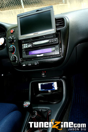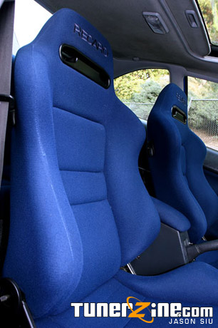 Taking a seat inside Mouse’s Si, the car is definitely a complete daily driver package as his in car electronics don’t lack at all. However, with the daily drive comes comfortable seats. Recaro SRD seats can be seen in the driver and passenger side in a lovely matching shade of Avus Blue. The rear seats were also upholstered to match the front Recaro’s, along with the front and rear door panels, and his arm rest. All the interior reupholstering was done courtesy of Apollo Interiors in Alhambra, California. A few more JDM goodies can be seen in the interior, including a Spoon Sports black duracon shift knob, JDM Civic Type-R shift boot, air vent w/ pocket and lightly decorating the gauge cluster is the Civic Type-R Carbon Fiber overlay.