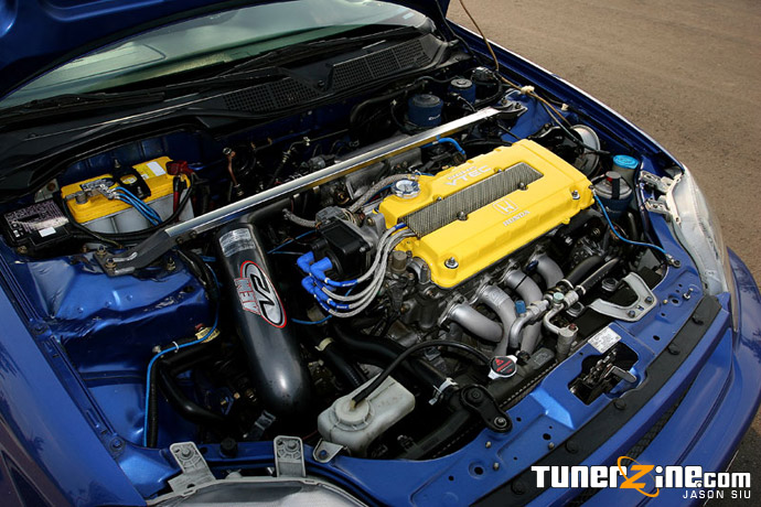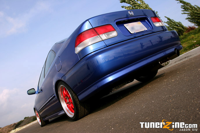 The powertrain setup is really not that shabby in Mouse’s Coupe, considering that the B18C5 powers the Type-R Integra just perfectly. On the exterior however, Mouse kept it clean and conservative, not even slightly hinting what’s underneath the hood. Again, sport’ing JDM, Mouse went with JDM Civic Type-R headlights, and JDM Civic SiR folding mirrors. The mirrors are actually a nice touch to the car, setting it slightly apart from the rest of the stock body Si’s out there. Up front, Mouse decided to install OEM foglights and in the rear the finishing touch was an OEM rear lip. Everything on the car was match painted to the smooth shade of Electron Blue Pearl.