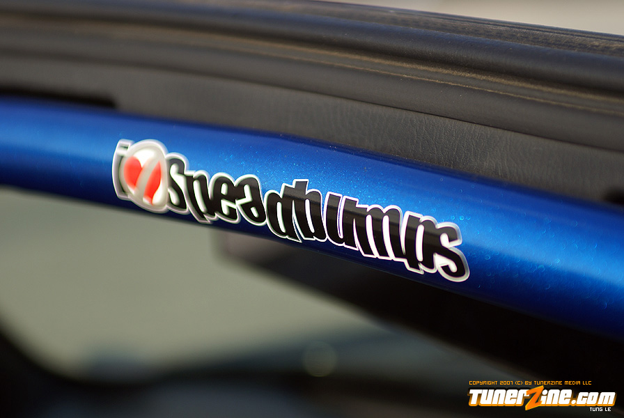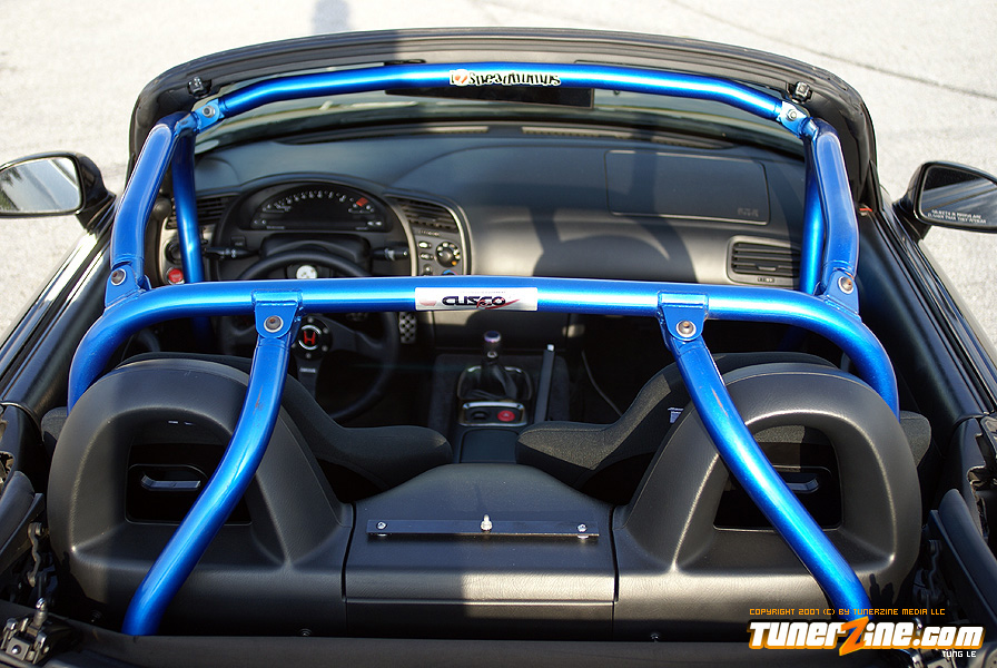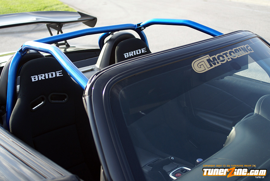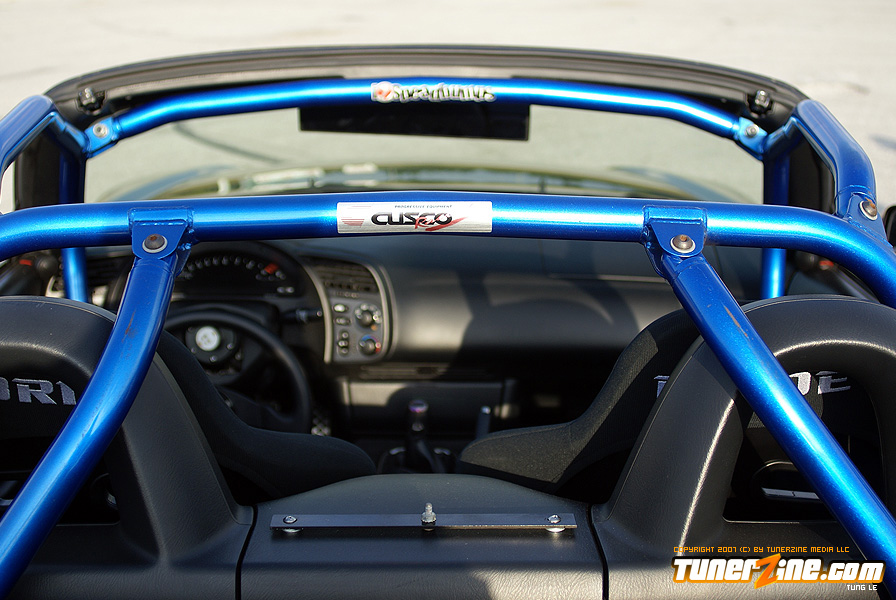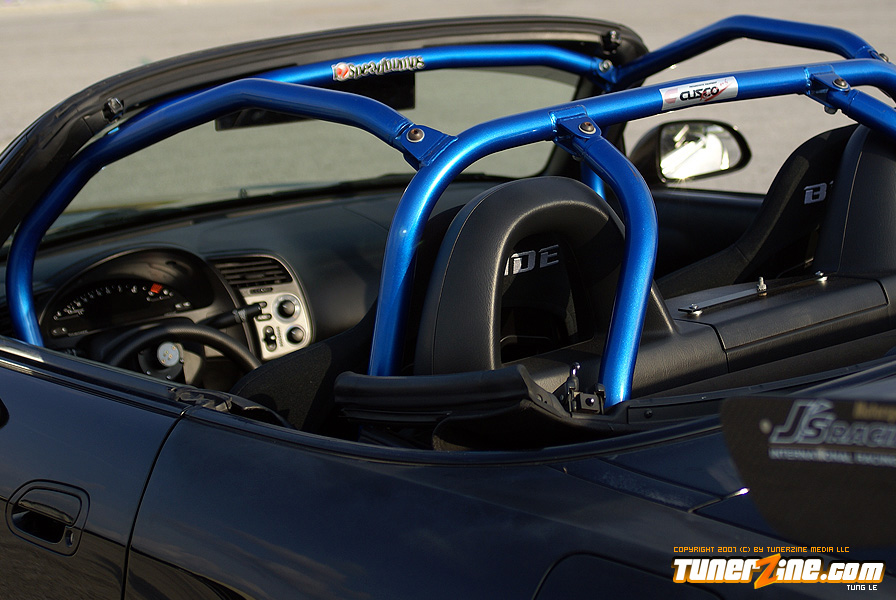 Now the styling doesn’t stop when you reach the exterior of this S. Pull off the hard top and you’ll find even more goodies on the inside. Your rear never moves in the Bride Zeta III seats. And the Momo Competition steering wheel makes controlling his ride fun and easy for Roger. You’ll even find another part from Spoon in the form of a shift knob that makes shifting gears a breeze. The tunes from the Alpine radio sound pretty good through the Boston speaker-tweeter setup. Now should Roger take a trip to the track, the 6-point roll cage will help keep him safe in case an accident occurs.