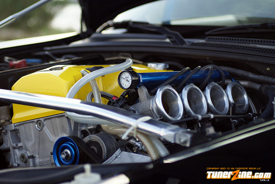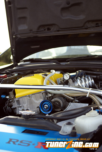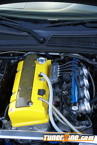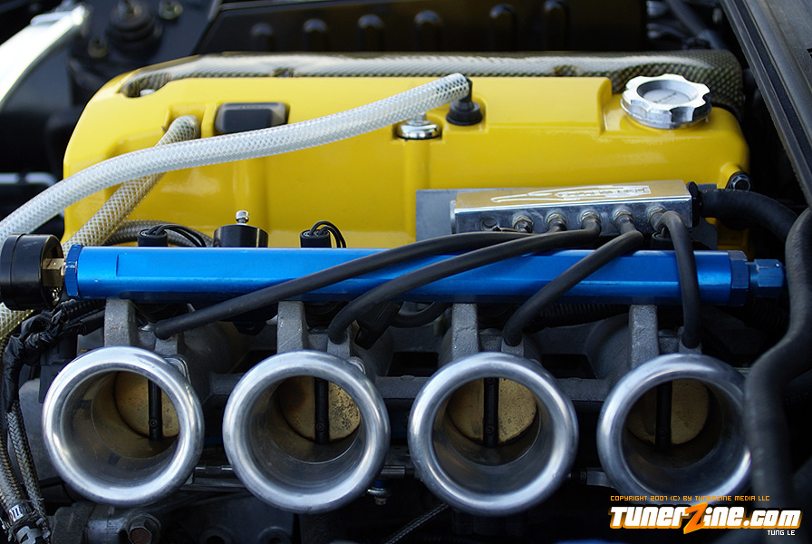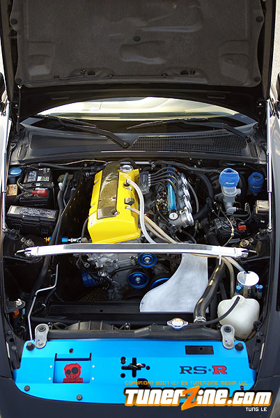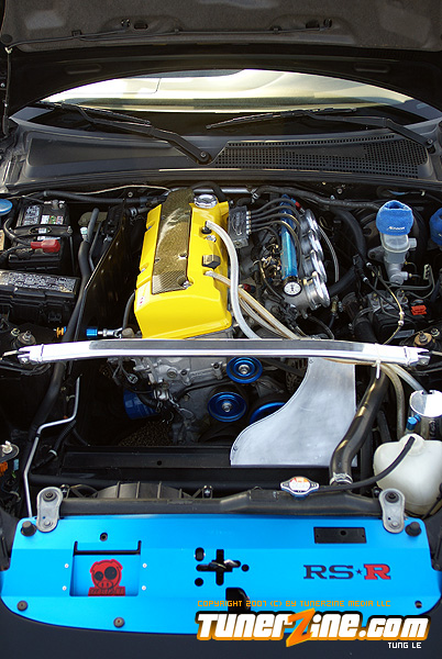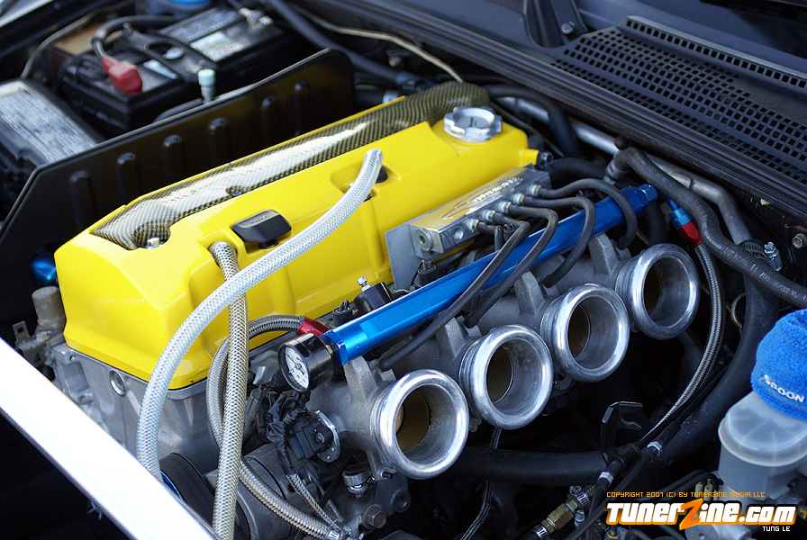 Of course, it isn’t just about looking good. I mean, why look good when you can’t go fast? But do you always have to do it with a turbocharger or supercharger? Well Roger doesn’t seem to think so. He’s built an all-motor S2k using parts from one of Honda’s main aftermarket providers. I’m talking about Spoon, a company that’s been making parts for just about every Honda available for quite a while. The headgasket, bright yellow valve cover, kevlar spark plug cover, torque dampner, front strut bar, and oil cap all come from Spoon. The headers, test pipe, dual exhaust set-up are courtesy of RSR. Roger’s also taken the opportunity to upgrade his fuel injectors to 440cc injectors.