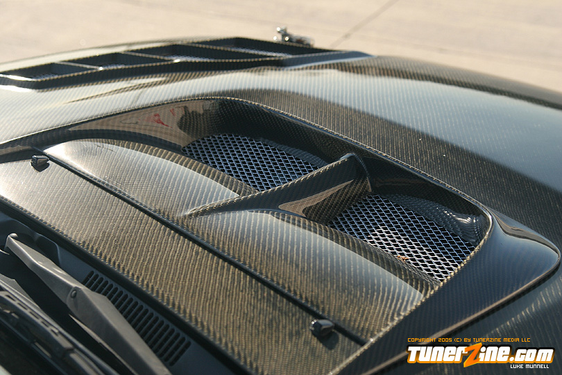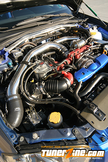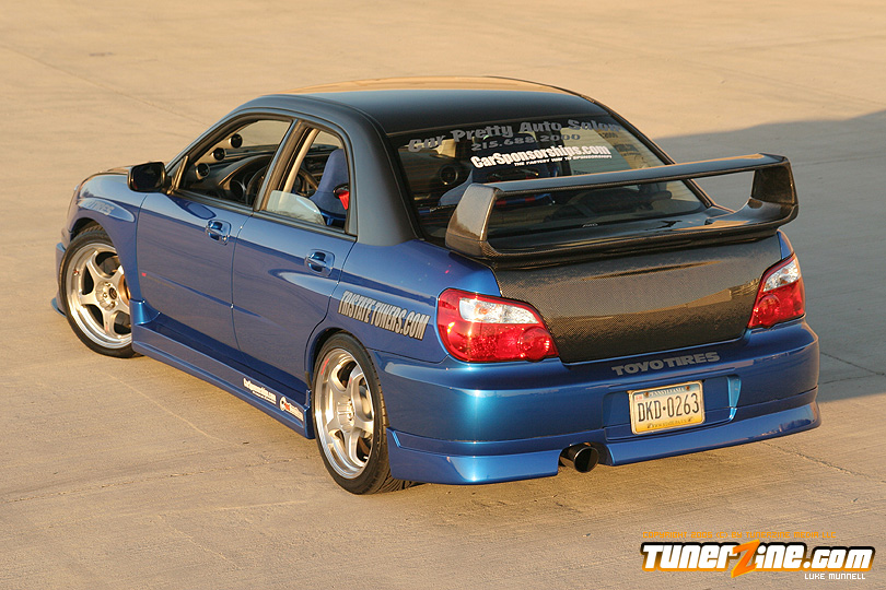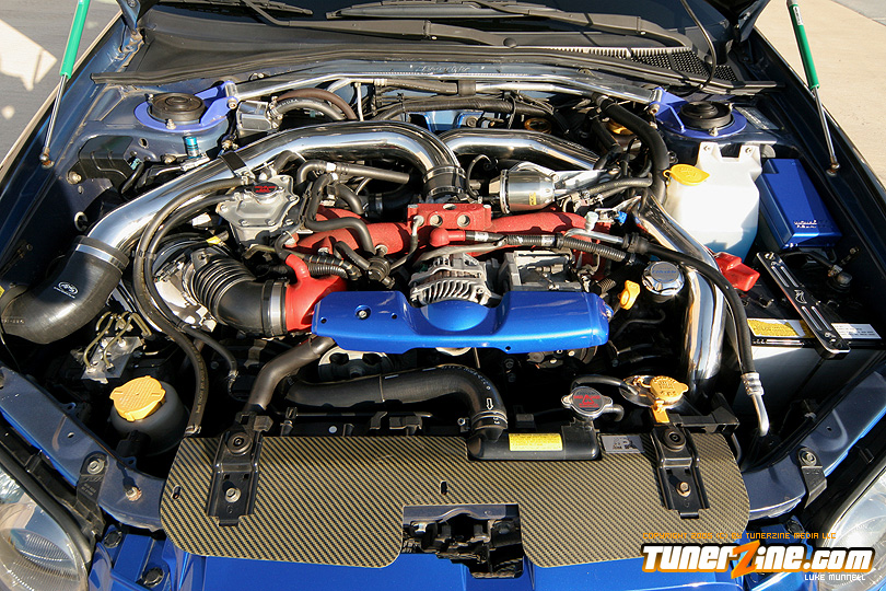 That wasn’t all the owner wanted however. Believing that the STi was fairly mild from the factory, he called upon the experts at Charge Speed to equip his STi with their ver.1 four piece body kit. A front lip, a pair of side skirts and a rear lip was first thrown on to accent the natural body lines of the car. Desiring some carbon fiber to offset the blue shade of the car, the owner then added a Buddy Club 2 carbon fiber splitter, Seibon carbon fiber hood, reverse hood scoop and trunk. If that wasn’t enough, a Carbon Creations STi replica wing was bolted onto the lightweight trunk replacement. Looking at the car from above, everything from the hood to the trunk had been replaced with a darker shade of carbon fiber, so the owner also had the roof painted a custom anthracite to help keep everything flowing.