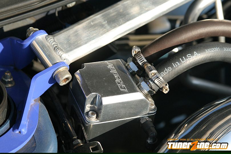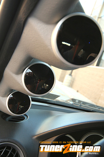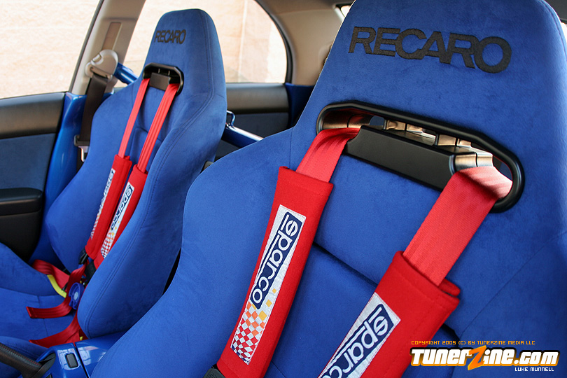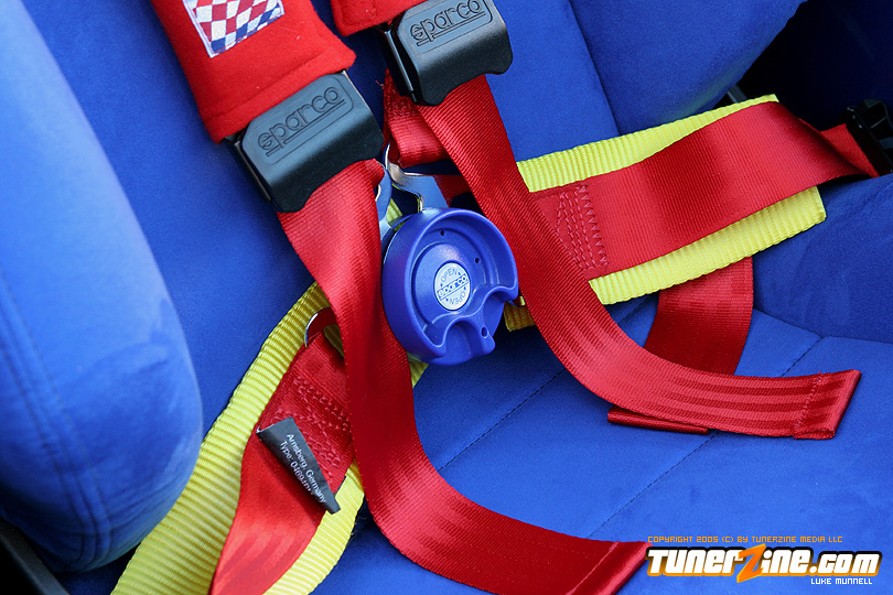 On the interior, plenty of in car electronics were installed to help the car in the show arena. While the car sits on 18×8.5 Racing Hart CPF-Tuners to garner attention to the exterior, the interior is adorned with several monitors and a pair of Recaro blue suede seats. Sparco harnesses along with a Sparco harness bar keeps both driver and passenger buckled in tightly while a series of gauges keeps everything updated in live.