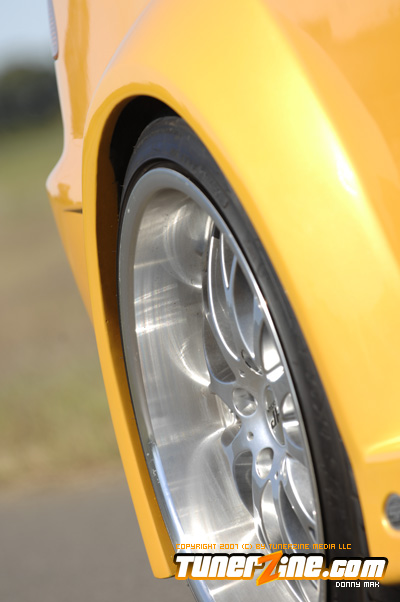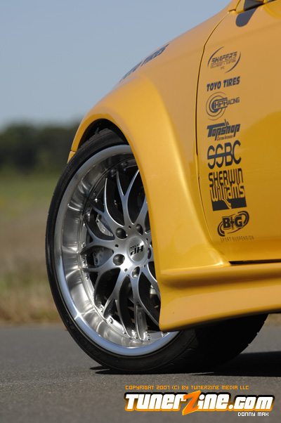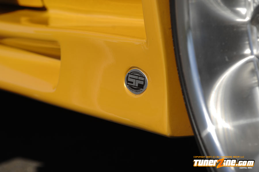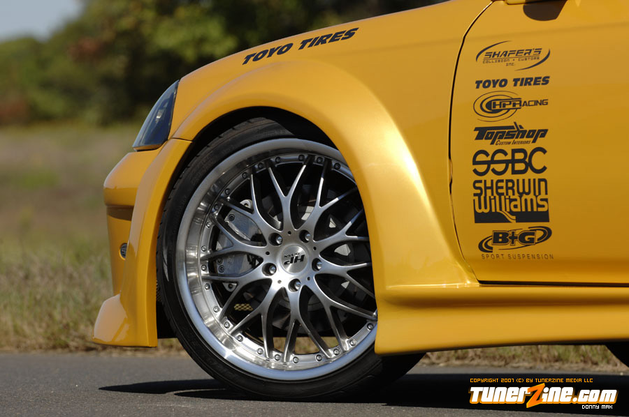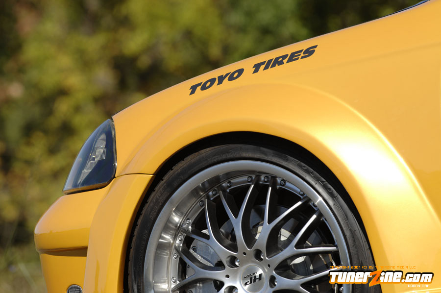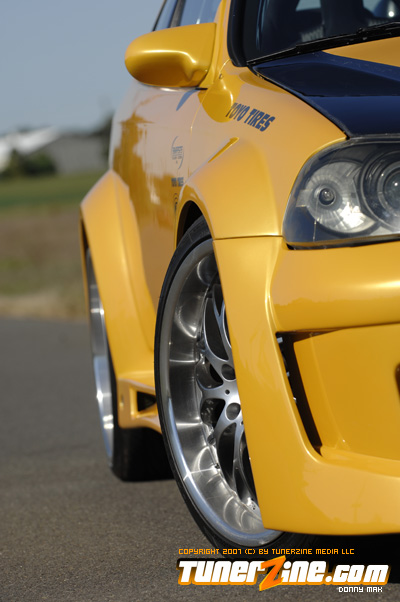 The exterior of the car sports a molded Strictly Foreign 12 piece wide body kit. Each fender has been flared as massive 5.5-inches utilizing two pieces per fender. The car is then matched up to a front and rear bumper combination and a pair of wicked side skirts. Custom mirrors and an OEM style carbon fiber hood accent the exterior some more. The car was then taken into the body shop where the new wide body kit and the rest of the car was repainted a custom Sherwin Williams Gold Lime Pearl finish. While the car was under the knife at the body shop, it received a treatment of shaved door handles and moldings. Black housing Angel Eye project headlights was thrown in and attention was turned elsewhere to complete the project.