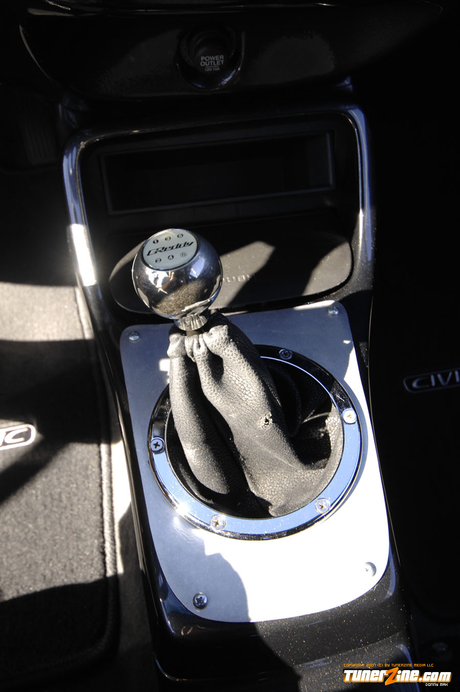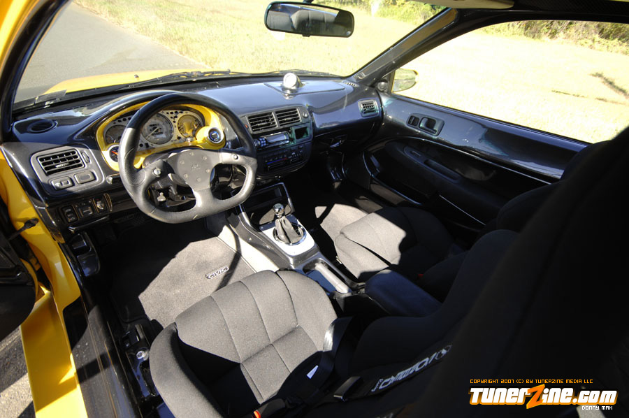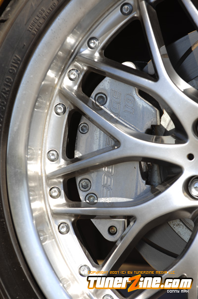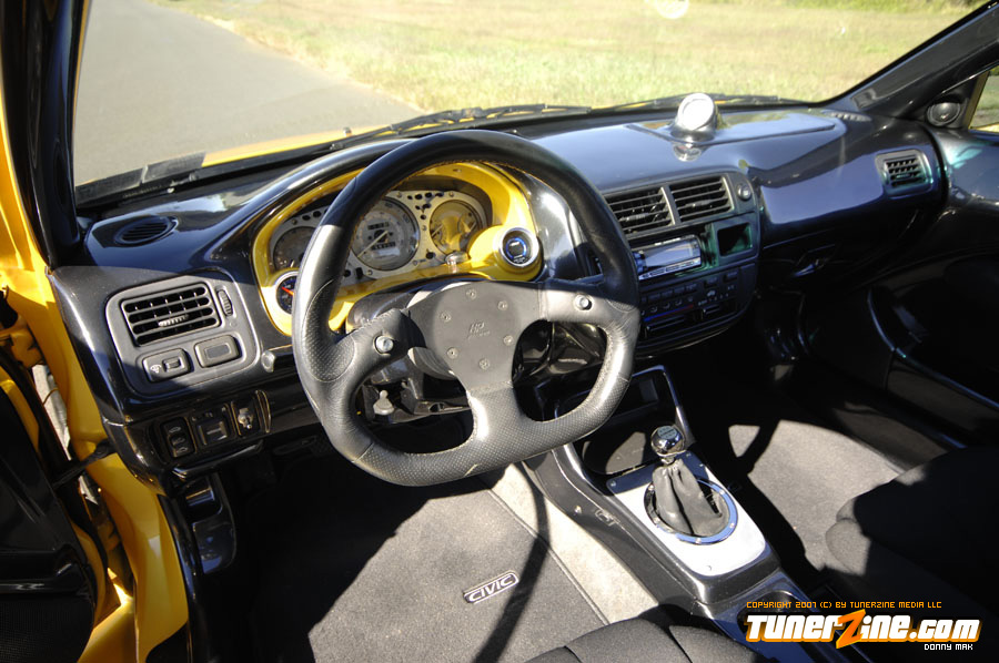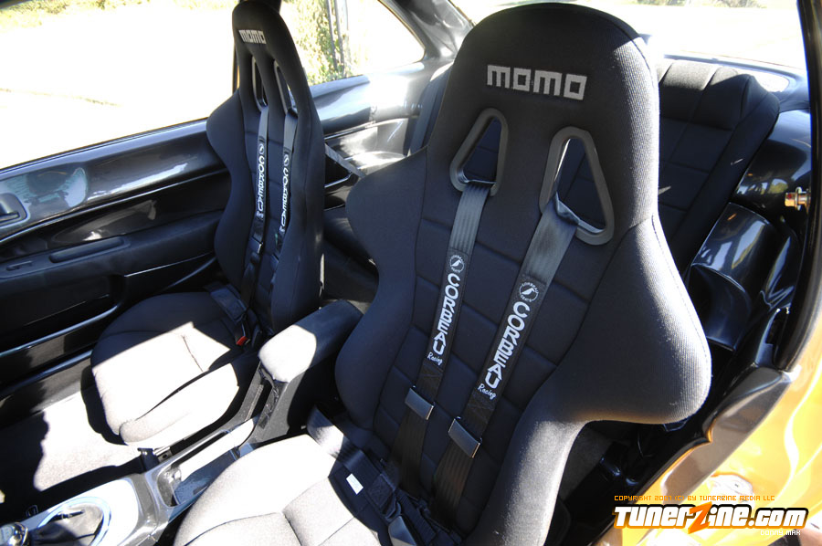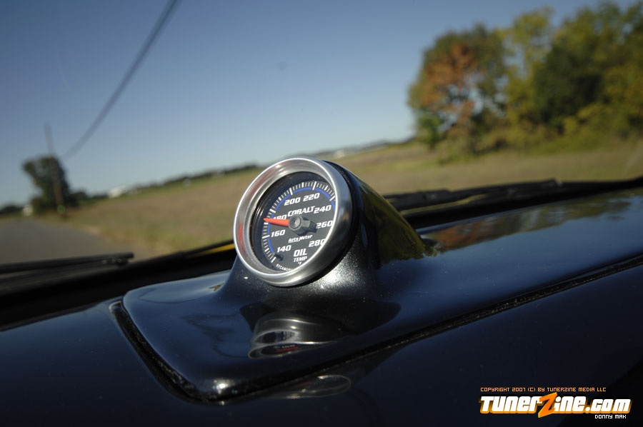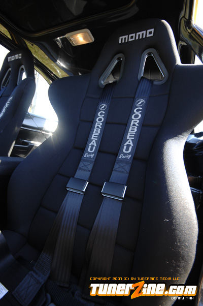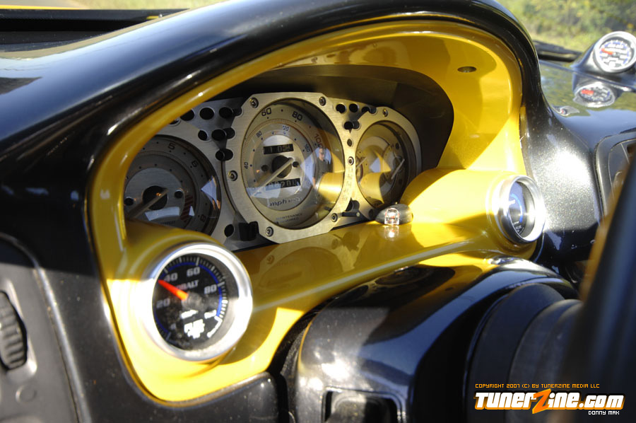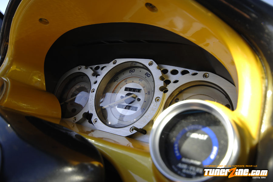 Under the hood things have been kept simple. An A’PEXi exhaust can be seen along with a cold air intake. Unorthodox Racing tossed in an oil cap and a Spoon Sports radiator cap can be seen. On the inside is what counts however. The entire interior has been resprayed a 2000 Lexus IS300 Charcoal Gray Metallic shade. Customization begins with a brushed aluminum shift boot plate, suede shift boot and arm rests and a custom fiberglass air bag cover with gauge pod. A Greddy shift knob takes center stage in the center console while a HP Racing steering wheel is priority on the driver side. AC Autotechnik S7 gauge faces and aluminum gauge bezel decks out the cluster while MOMO RS GT Racing seats give way to driver and passenger. A series of Autometer Cobalt gauges can also be seen.