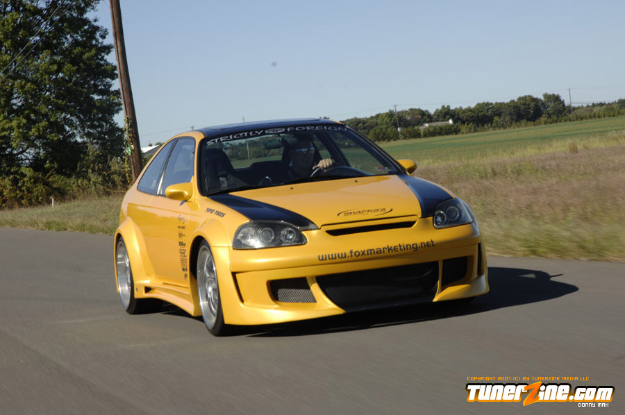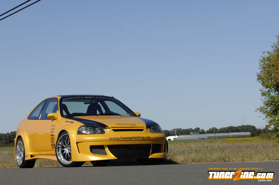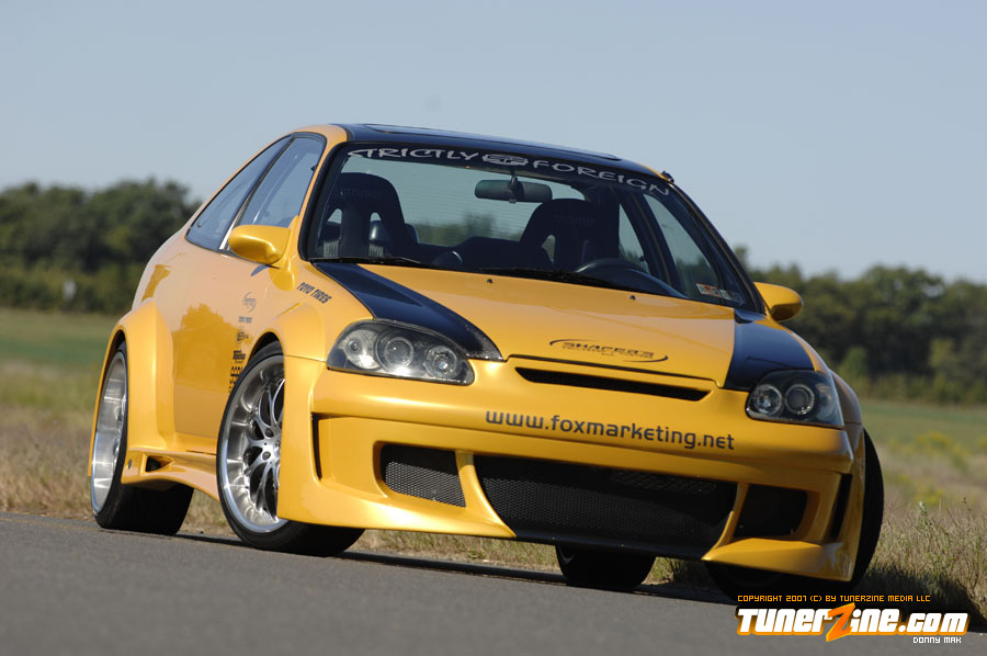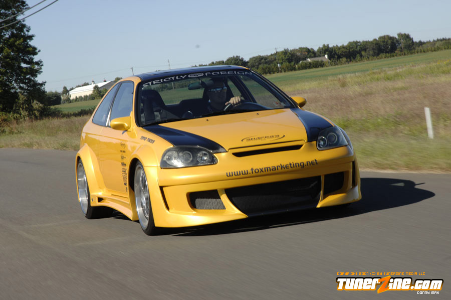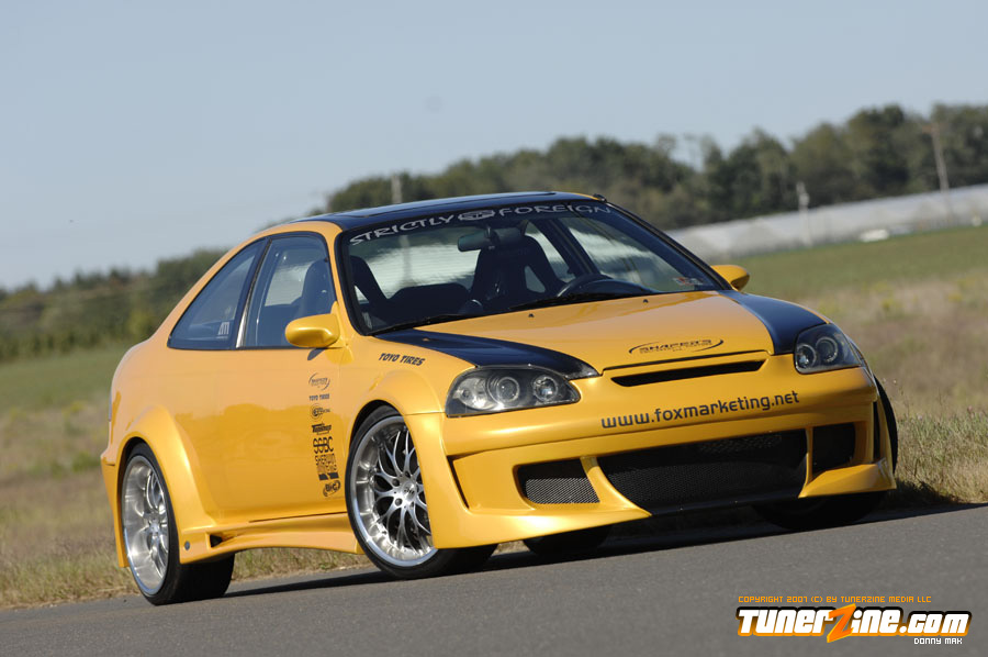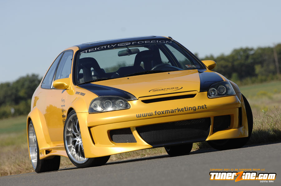Custom widebodied cars are the craze now. There’s no arguing or refuting that fact, just open up your eyes and you’ll see a widebody car! Fox Marketing put together this one of a kind Civic to show what can be done with a little creativity and going against the natural mold that all other Honda owners have been embracing the last few years. The exterior of this car is arguably one of a kind, that is, until the enthusiasts realize that this 12-piece wide body kit is actually available to the market.