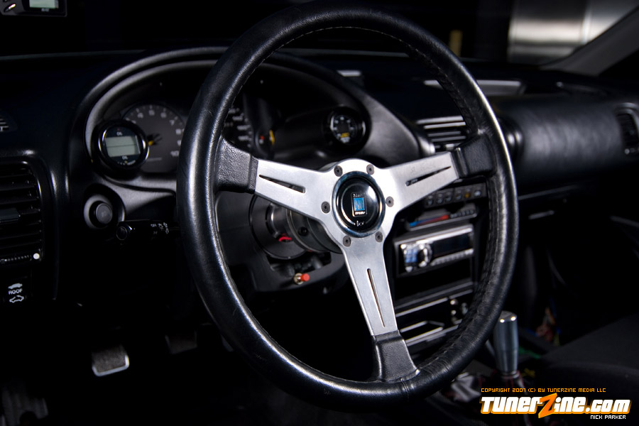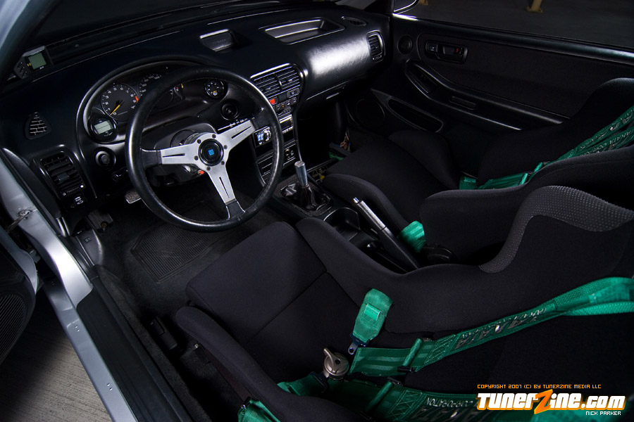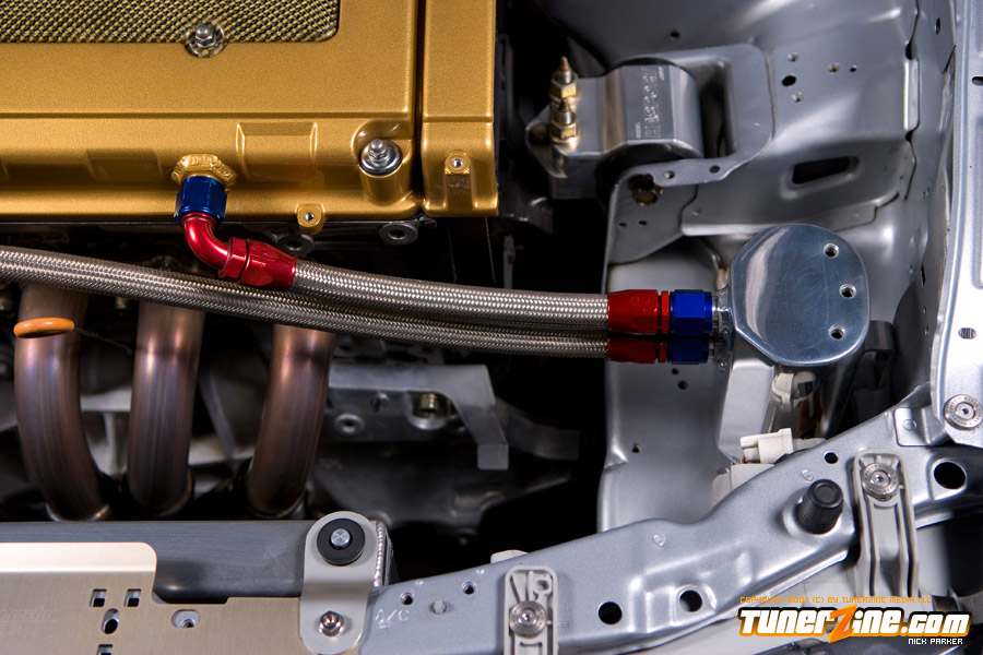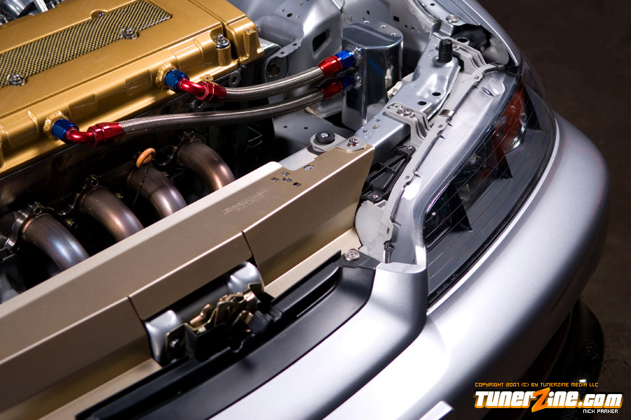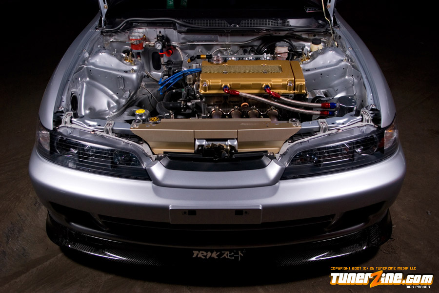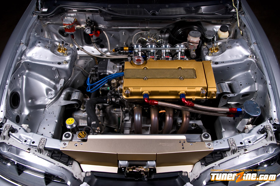 Bolt ons to the power plant include a Hytech custom header, SMSP straight pipe, KTeller custom 2.5″ exhaust piping and a Mugen Twin Loop muffler. Light décor include a Spoon Sports Kevlar plug cover and HKS D1 oil cap. Cooling is now handled with a full size C&R radiator along with a SPAL fan.