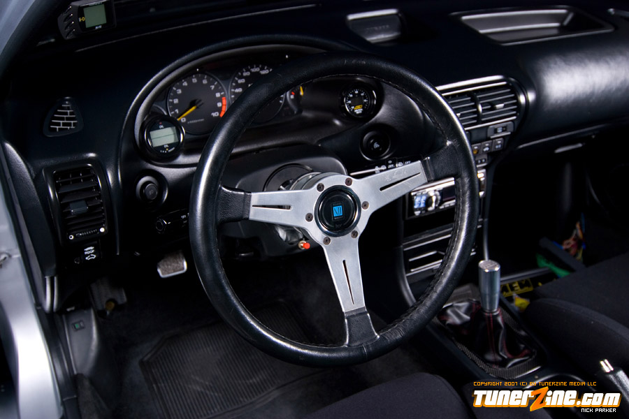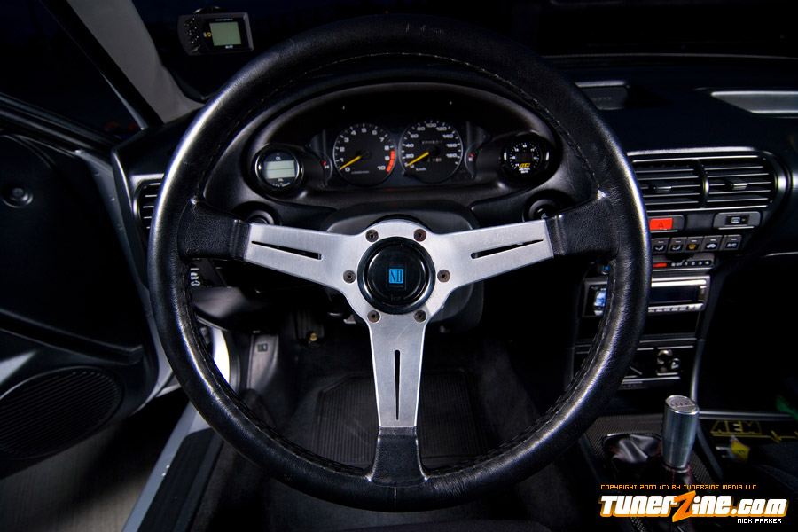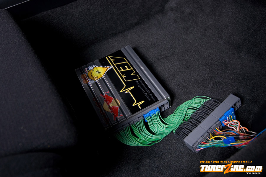 On the inside, the Integra’s clean theme continues. A pair of Recaro seats can be seen along with a stainless steel harness bar with Takata harnesses draping over. A Nardi classic steering wheel replaces the factory piece while a Feel’s shift knob is in grasp for the fortunate driver. Several pieces from the Integra’s JDM counterpart made its way into the interior as well, including the cluster, arm-rest killer, clock block, fog light switch, air bag tray, door panels, rear seat and shift boot. A set of Mugen pedals further reinforces the JDM goodness throughout the cabin. Lying on the passenger side we spotted an AEM EMS 30-1050 that Shawn Church used to tune the car to its 223whp claim.
