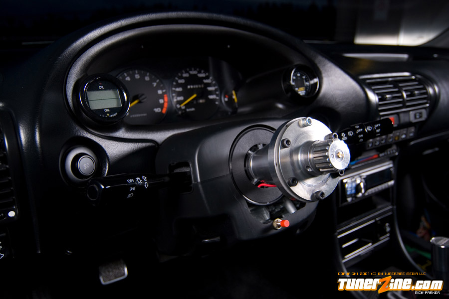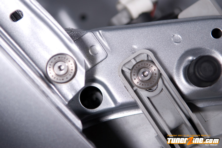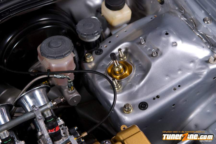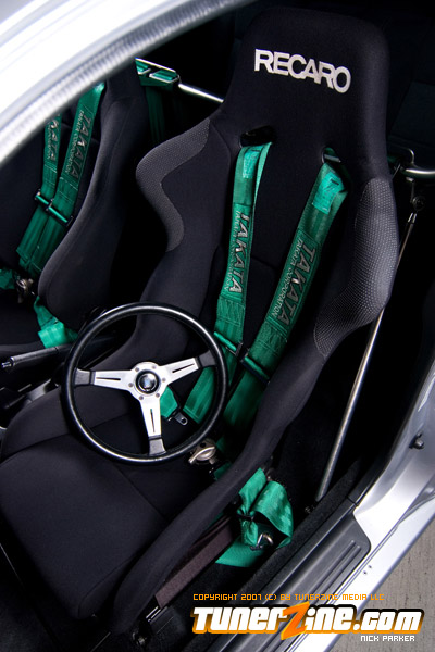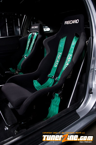 The car is now a handling machine thanks to a fine collection of suspension modifications. At the center of it all is a set of TEIN RE coilovers. Skunk2’s front upper control arms and Ingalls rear upper control arms allows for full camber adjustment, while A-sport fender braces and Function ITR control arms further beefs up the suspension. Comptech’s rear sway / tie bar combination has become the setup to have on any Honda / Acura vehicle. A custom trunk wall bar was added to further stiffen the chassis. On all four corners are a set of Power Slot rotors placed on a JDM Integra 5-lug conversion. Setting this car off is a set of 17×7.5″ BBS RGR wheels in silver, wrapped with Yokohama’s ES100 tires in a 205/40/17 form.