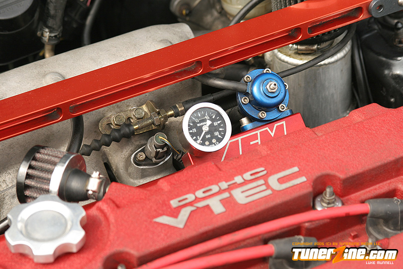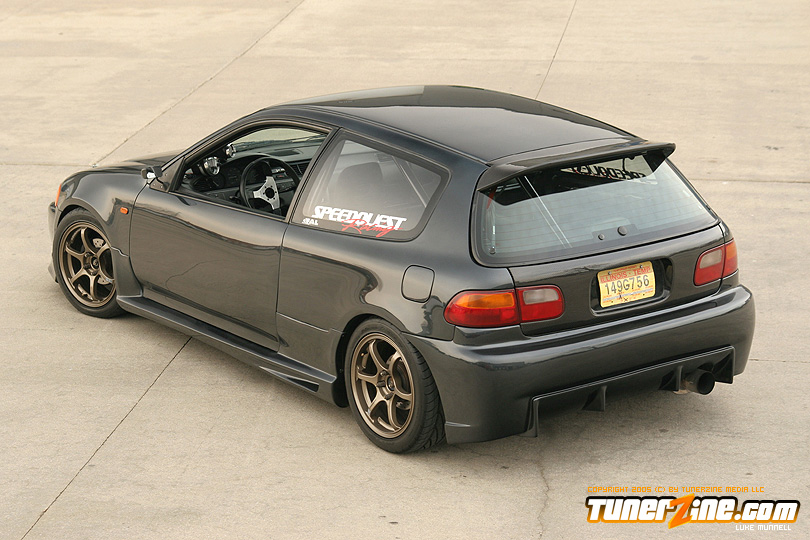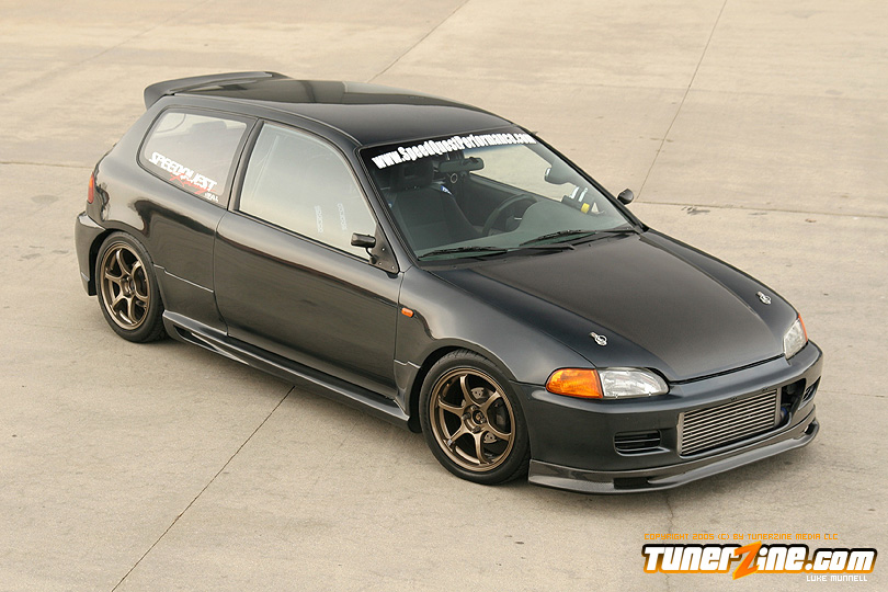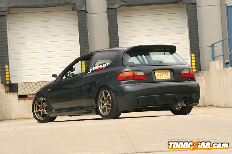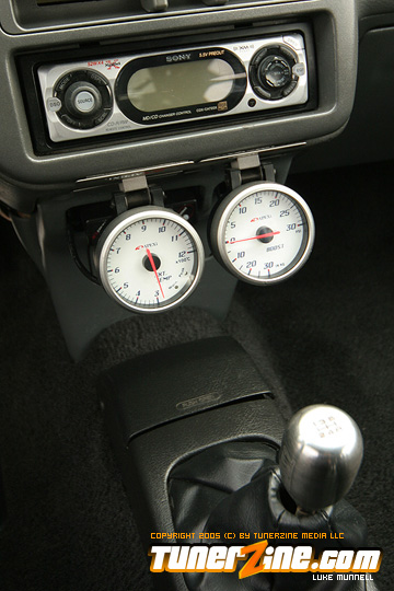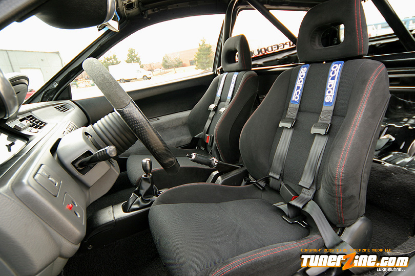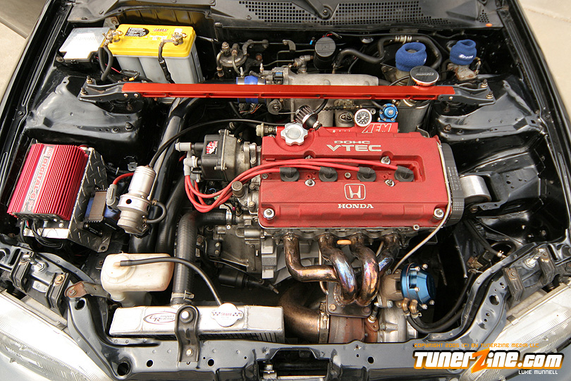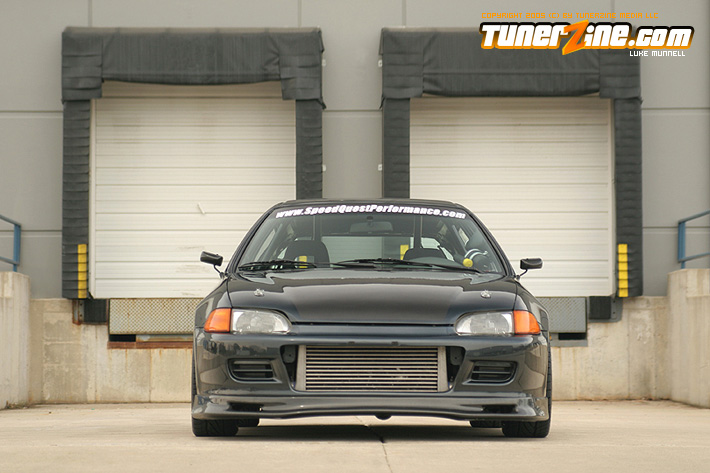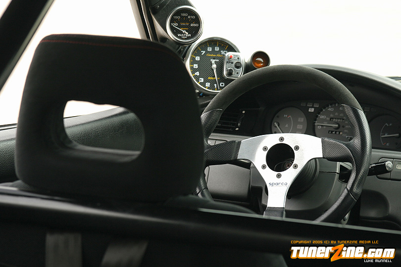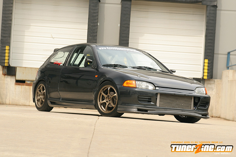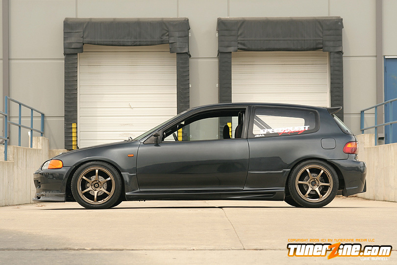 No issue of tunerZine is really complete without a nicely done turbocharged Honda. This month, Luke Munnell was fortunate enough to grab a hold of this beautifully done Black EG. With its massive GReddy front mount intercooler, it easily makes us aware that this is one Civic ready to roll. Popping the hood only releases all its glory as a fully built B-Series lurks in its bay. A custom T4 turbo manifold with a GT40 turbo provides the forced induction while a series of fuel modifications from AEM keeps everything properly fed. The bottom end of the block was built utilizing a set of Darton 84mm sleeves and CP 9:1 compression pistons. The head of the motor was also reworked with a port and polished along with all new Skunk2 valve train to handle the additional power produced by Crower’s cams. Getting the power to the ground is a Clutch Masters FX300 clutch kit and Driveshaft Shop’s stage 3 axles. Tuning the car is controlling boost is a Speed Pro stand alone ECU and A’PEXi AVC-R boost controller.