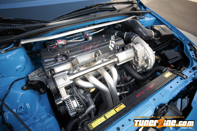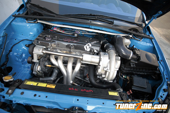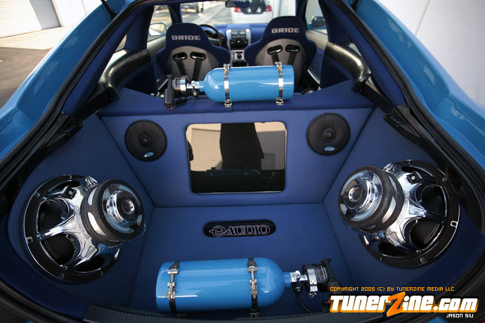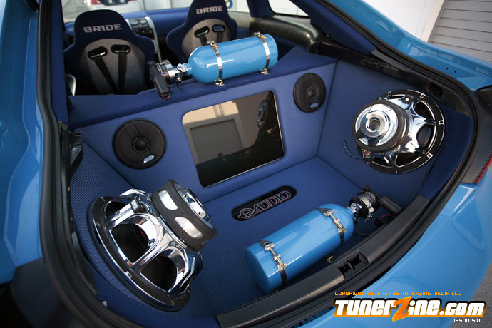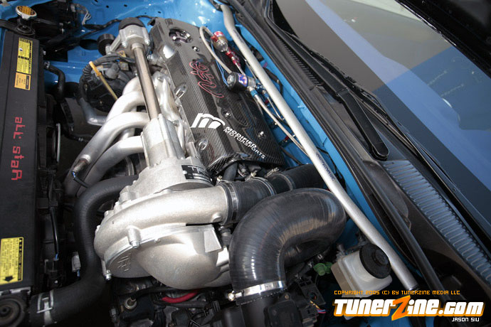 On the exterior, the car has been completely redone with a custom 8-piece wide body kit. The front and the rear have been widened 100mm and molded to match the body. When asked who made the custom body kit for him, all Neil could do was shed a tear and mention a poor little boy by the name of Fortune Shim-Quee: “He slaved away in the heat working with fiberglass for hours on end trying to make it perfect for us. We fed him from time to time, he’s a good boy.” Plenty of carbon fiber goods also adorn the exterior, including a hood and hatch. His wheel selection has changed from Veilside to HRE. His wife told us that the baller spec and ultra wide HRE wheels help make up for something he lacks. We didn’t want anymore information. Knowing that he stepped it up to 19×10.5-inches of pleasure in the front and 19×11-inches of pleasure in the rear was ample. Doused in a custom black center finish, the glossy multi-stepped lip of the HRE wheels arguably make the car what it is today. Wrap those with Falken FK451 rubber and maybe, just maybe, Neil has finally gotten something right.