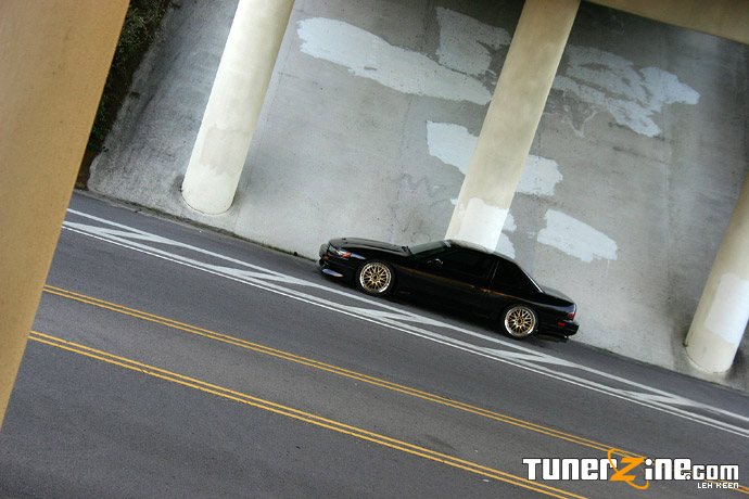 The suspension has been torn apart and redone with drifting and aggressive handling in mind. D2 coilovers allows for dampening and height adjustability while Suspension Technique sway bars gives the car the balance (or unbalance) it needs to go sideways. TEIN goodies are seen in the more delicate suspension components, from the TEIN tension rods to the TEIN tie rod and tie rod ends, this S13 coupe is ready to go. Last but not least, a Cusco front strut tower bar was installed to brace the chassis. Braking is also a necessity in drifting, as the stock front calipers were removed for the more popular Z32 (300zx) calipers. In the rear are newer model 240sx S14 calipers. Just enough to top off the S13 in its search for drifting harmony.