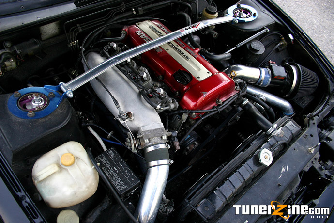 Now most of us are well aware that 240sx’s don’t pack a lot of punch from the factory – especially the older S13 models. Being that the SR20DET is the most popular swap out there, it’s easy to guess that this coupe has one as well. Equipped with a GReddy S13 VSPL front mount intercooler, the SR20DET has no problems keeping boost pressure under extreme temperatures. Producing the extra boost for the SR20DET comes from a GT25R turbo bolted onto an SS Auto Chrome exhaust manifold. A GReddy downpipe that leads through a custom test pipe and out an APEXi single N1 exhaust makes up the entire exhaust system. A GReddy oil pan takes place of the stock one, as the stock ones tend to get dented and cause oil pressure dilemmas. A Top Speed intake manifold along with a Z32 maf and K&N filter takes control of all the air that gets fed in. An HKS SSQV can be seen welded onto a custom hotpipe to expel surplus pressure when Keen does decide to lay off the loud pedal. Internally, the SR20DET has been fitted with Tomei Rocker Arm Stoppers and HKS cams, 264 intake and exhaust side.