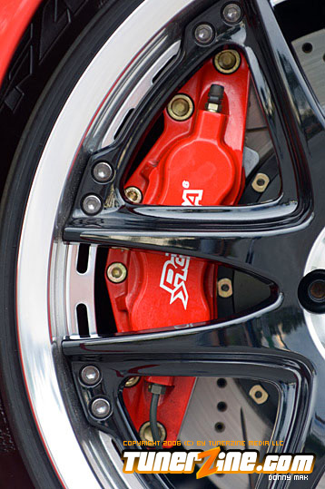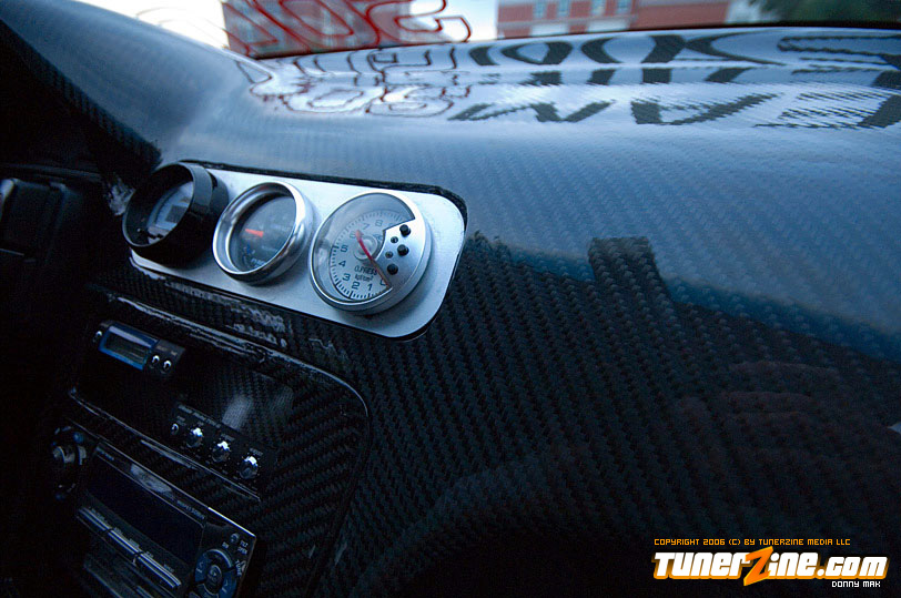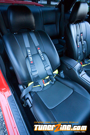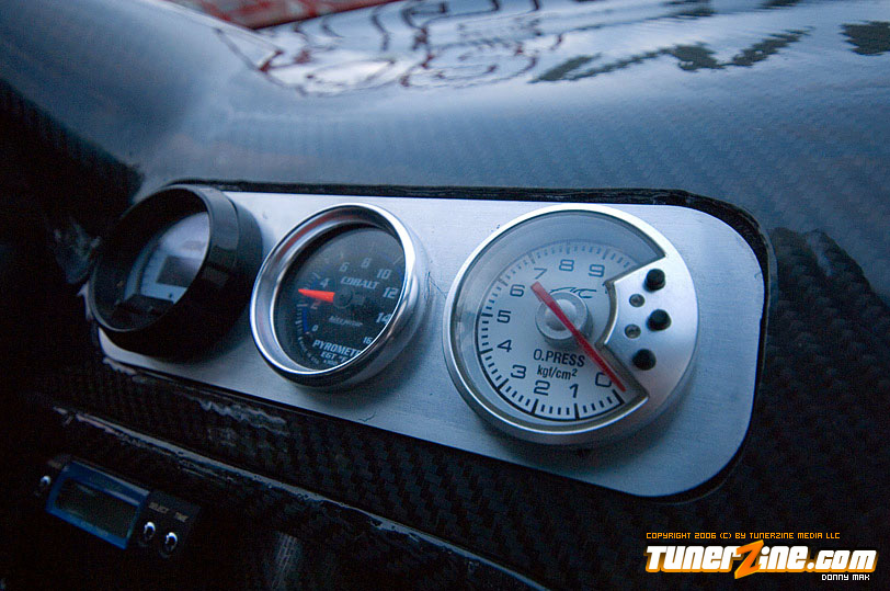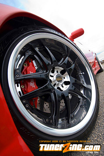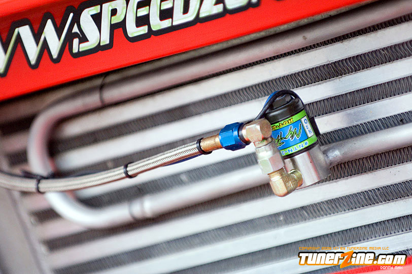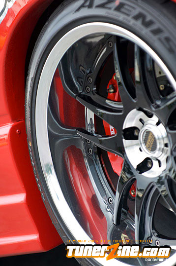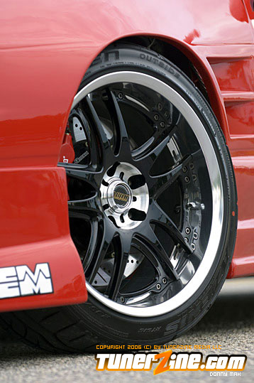 Speedzone decided to go with the Red Top SR20DET engine. But you might notice that the valve cover’s not really “red” anymore. (Just hope they don’t see any real flames under the hood. =0P) P.C.C. Racing Engines did a lot of the engine work, and boy did they do a fantastic job. Greddy received some love for their Greddy/Trust Catback system, Greddy intake manifold and Greddy intake and exhaust cam gears. Of course the transmission isn’t even stock – It’s straight from a TT 300ZX. In fact, I don’t think there’s anything under this hood that hasn’t been changed, cleaned up, or just completely done away with, even small details like the Takara JDM Stainless Oil and Water Line Kit.