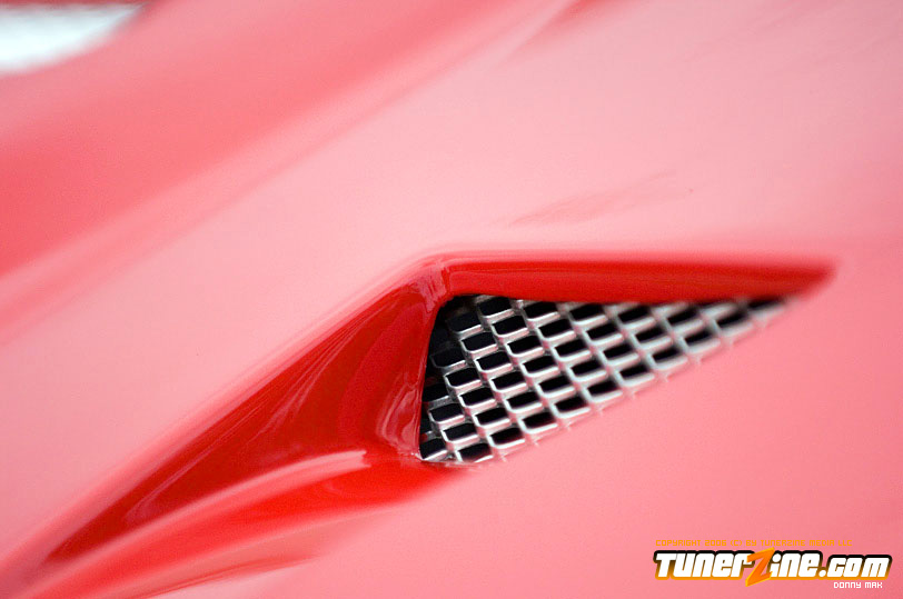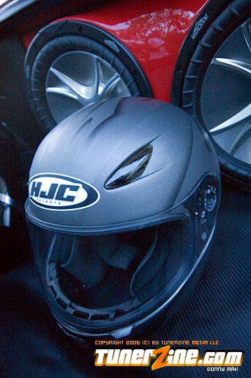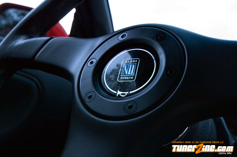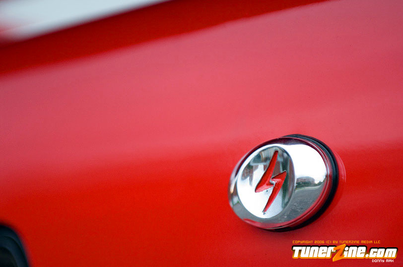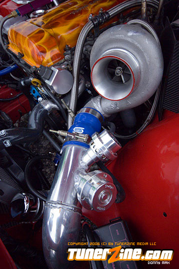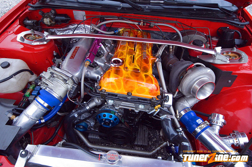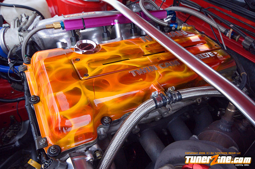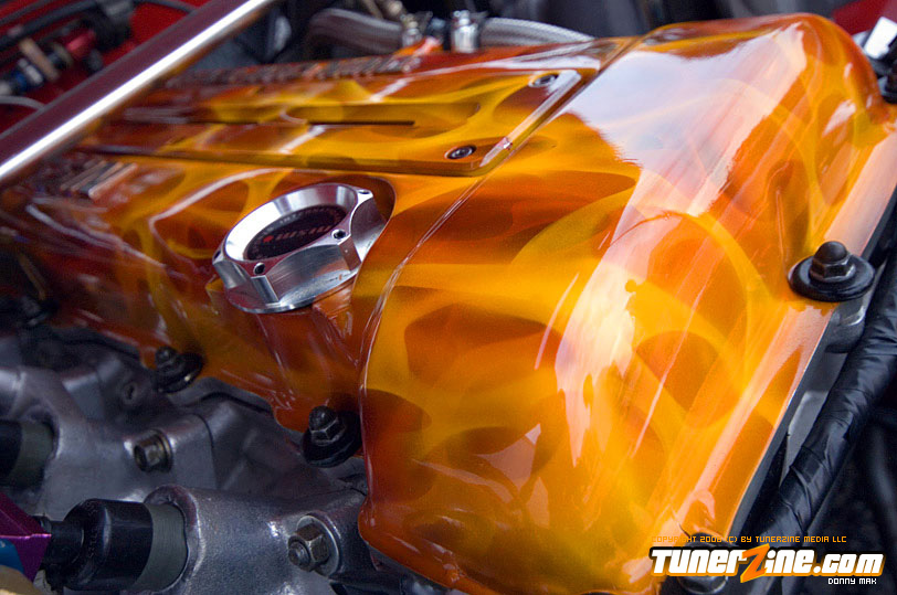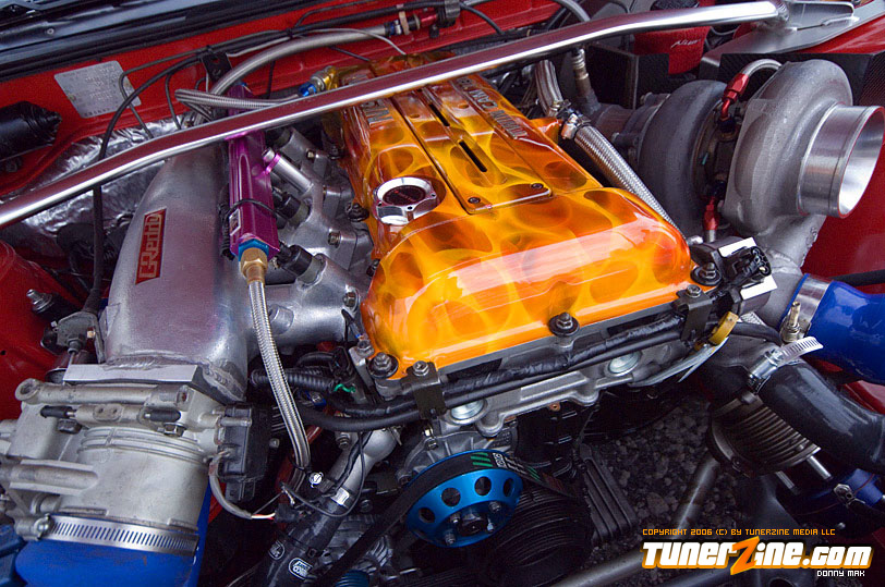 So let’s talk paint for just a minute. The paint color is Fresh Fire Pepper red. The car was painted by Papa’s Customs. The mirrors on the car were colored matched perfectly by Papa’s. The front of this car features a tight-fitting JDM Chargespeed hood and front bumper, which houses the Precision 900 intercooler, which cools boost provided by the GT35/40R Garrett turbo. Got all that? Good. The wheels definitely help set this car off. (I’ve always been a fan of black on red.) These Volk Racing GT-V wheels wrapped in Falken RT-615 rubbers are just pure sex. And of course the ride’s a tight on when you’re rollin’ on Tanabe front and rear sway bars. But this car is anything but a show car. So let’s pop the hood and really see what makes this beauty purr.