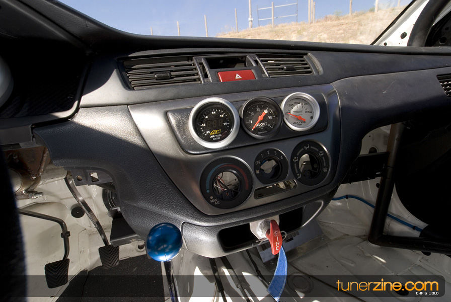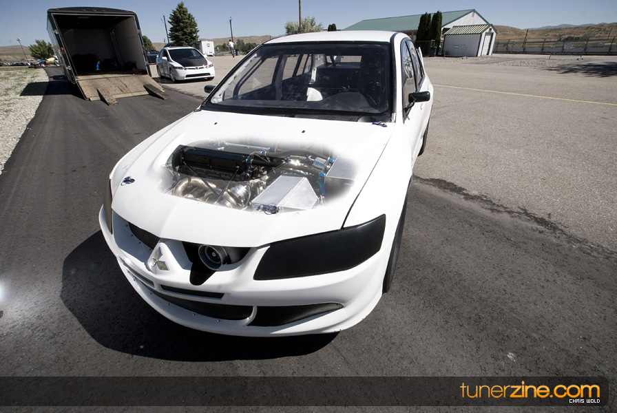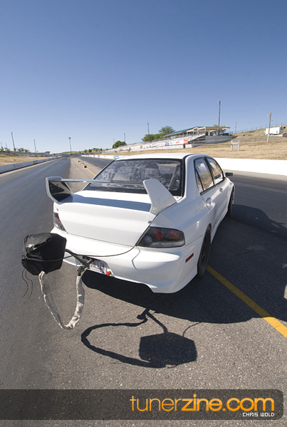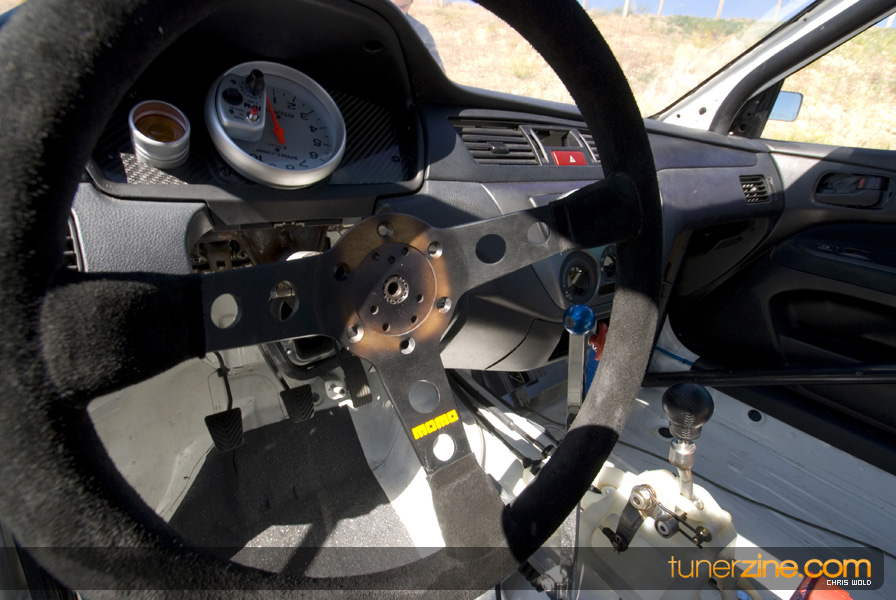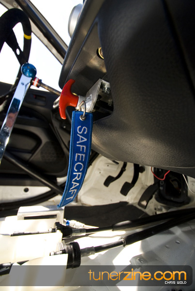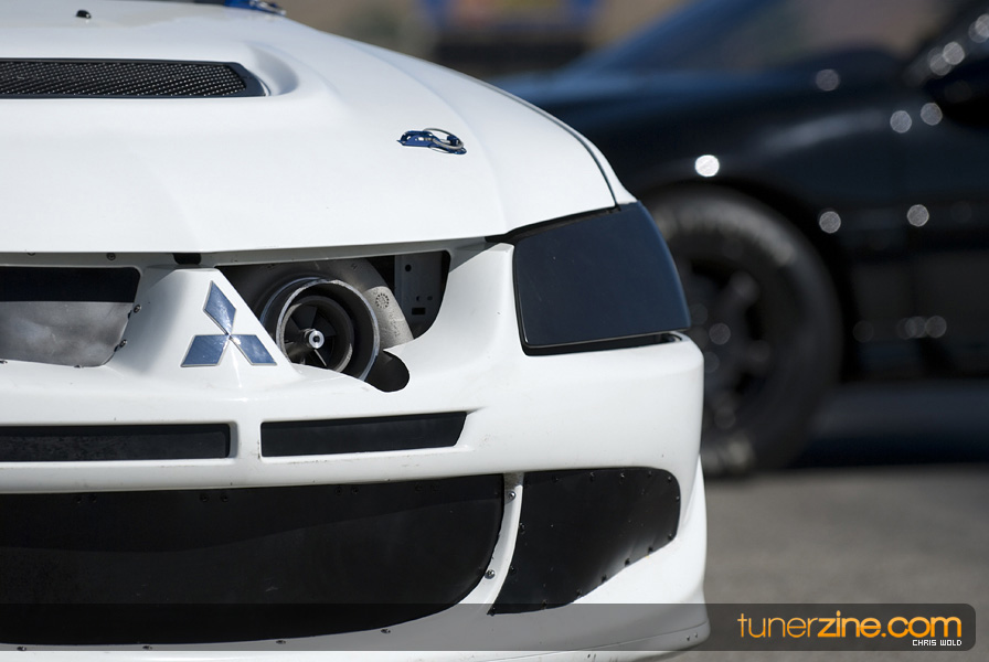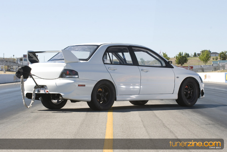 Another awesome part of this feature is the contrasting shades of both vehicles. Dan’s EVO 8 wears a light shade of white on the exterior accented with lightweight carbon fiber goods. The stock heavy doors and trunks have been scrapped for lightweight pieces from Seibon and VIS respectively. APR carbon fiber mirrors act as a finishing touch to an otherwise untouched interior. It’s not easy to overlook what the EVO was truly built for however. Curious viewers will instantly notice the AMS 10-point roll cage that has been certified to 8.50 quarter mile ticks. But even for those that can’t notice the cage, it’s hard to overlook the Stroud parachute out of the rear.