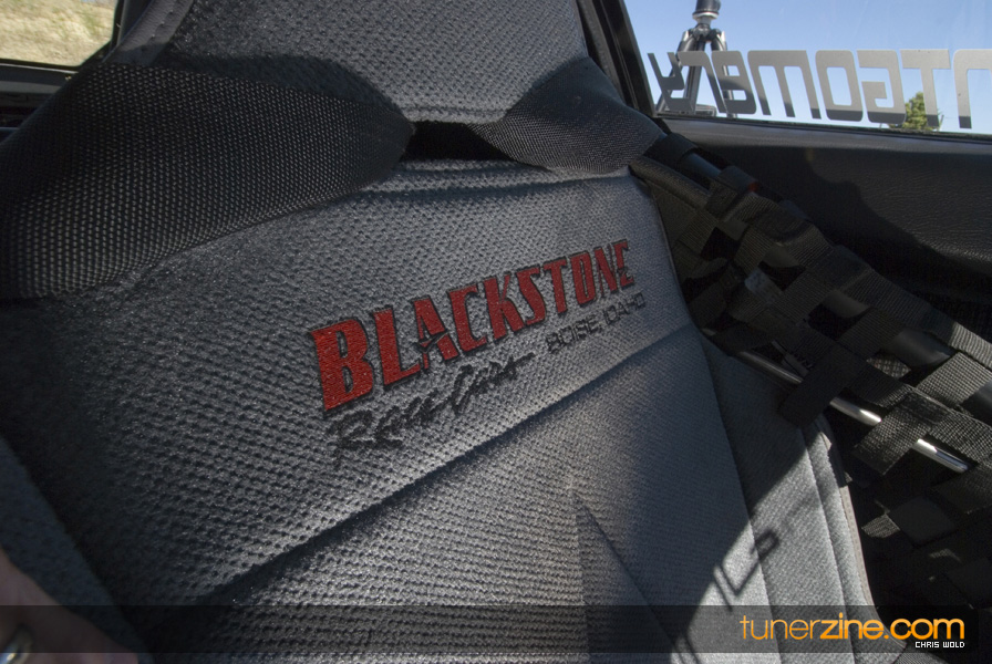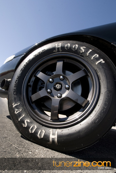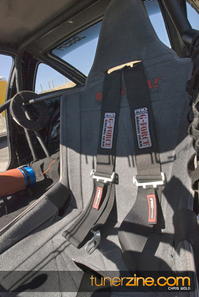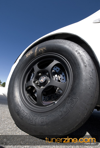 Little has been done to the exterior, but 16×7-inch Rota Grids are seen on all four corners wrapped with Hoosier Quick Time Pro DOT slicks in a 26×9.5×16 size. A Simpson parachute can be seen in the rear while the chassis has been reinforced with a NHRA certified 8-point roll cage. The suspension setup has been kept basic but fully functional with Ground Control coilovers and KYB AGX shocks.