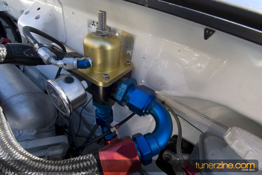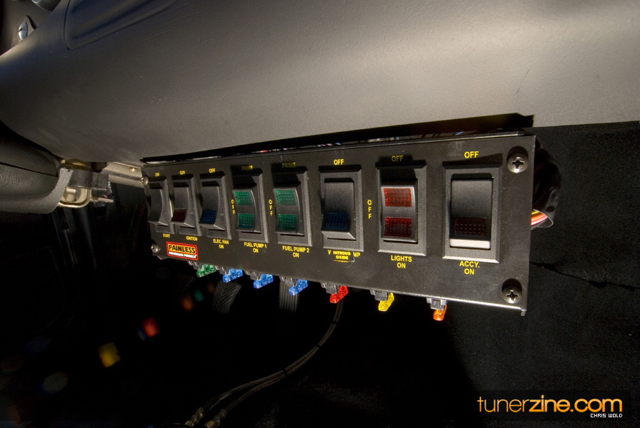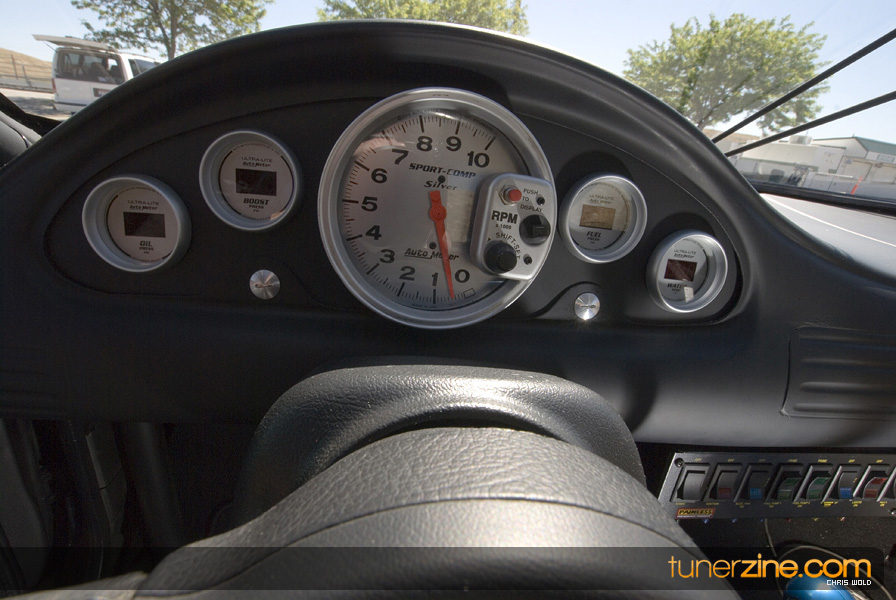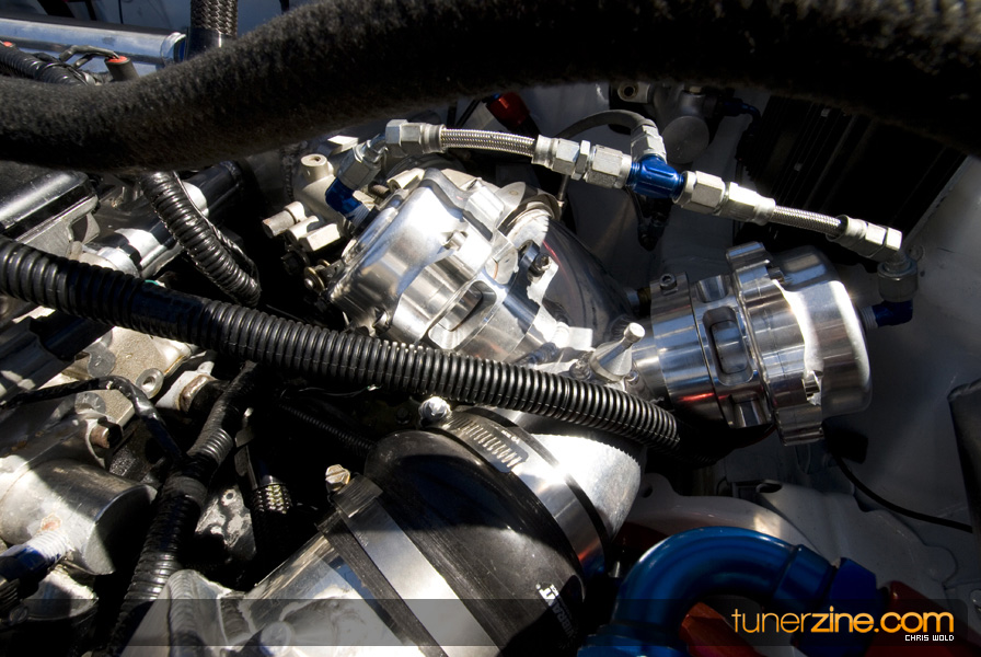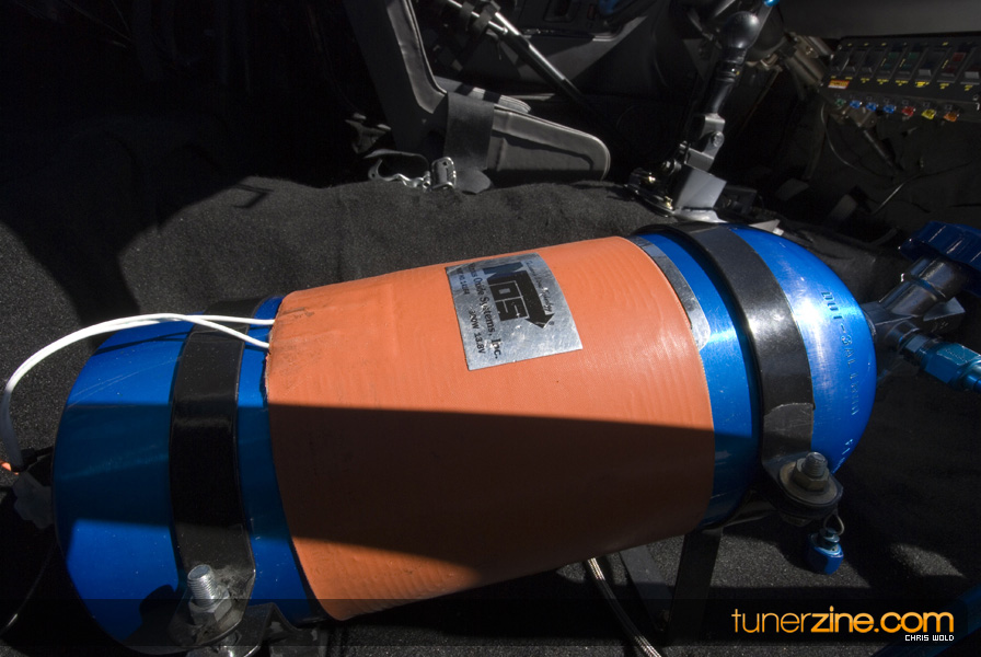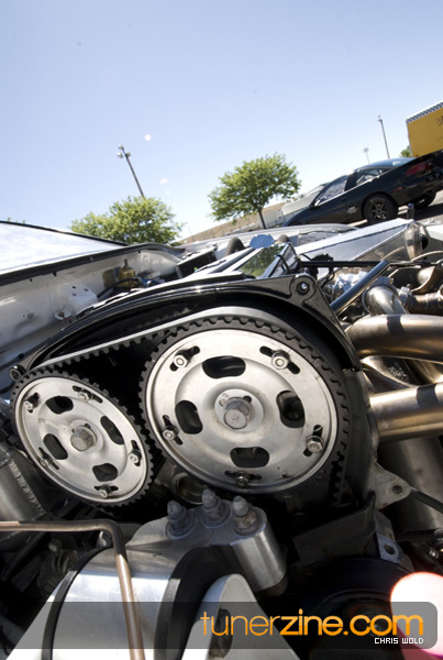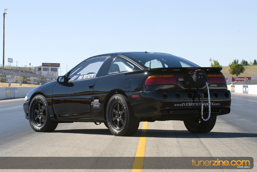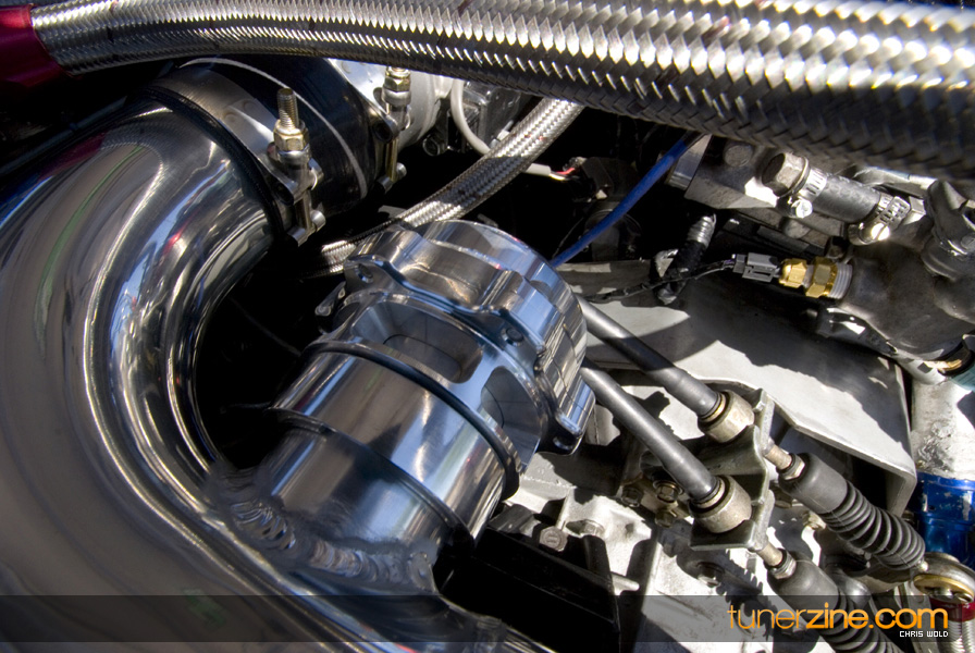 On the other lane of the track is Jake Montgomery’s pristine 1992 Eagle Talon. And by pristine we mean it’s a beauty to look at, but very few parts have been left untouched. Starting with the engine setup, this 4G63 has been tuned to blast down the quarter mile in a blazing 8.66 @ 165mph. Jake was also Battle of the Imports’ Pro Rookie of the Year in 2008. The 2.0L utilizes a stock crank, but has been rebuilt with Wiseco 1400HD pistons and R&R aluminum rods. FP cams along with Supertech valves and Kiggley valve springs are seen in the head. Jake also runs a GT4202 turbo that has been bolted on with a Shearer Fabrications top mount manifold. Additionally Jake takes advantage of a NOS 100 shot direct port system to help achieve his successful quarter mile times.