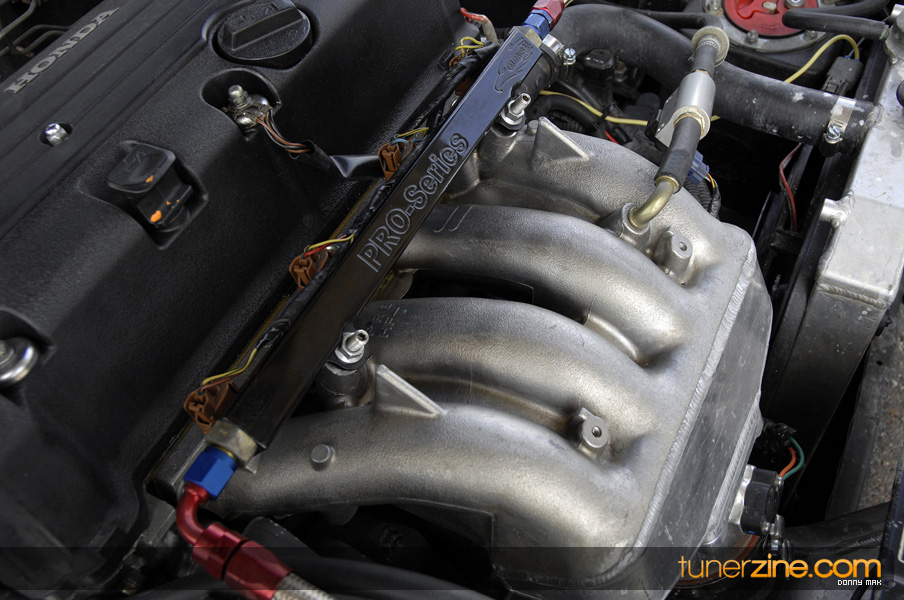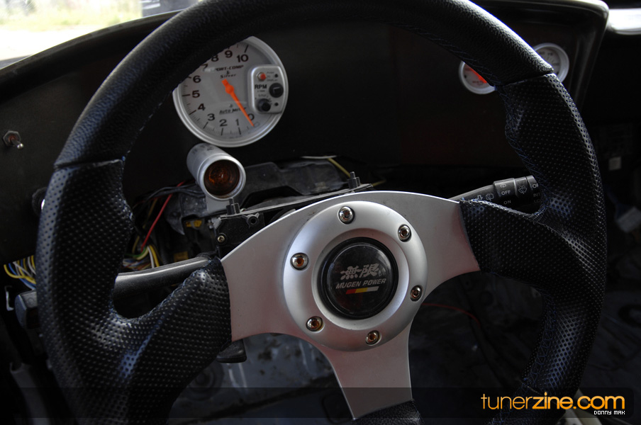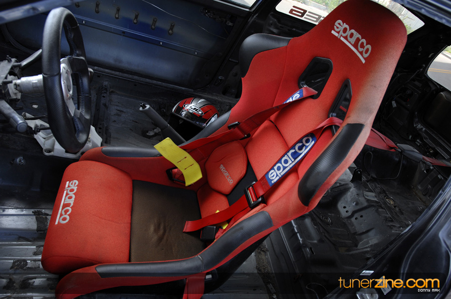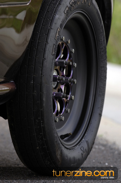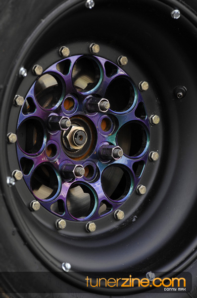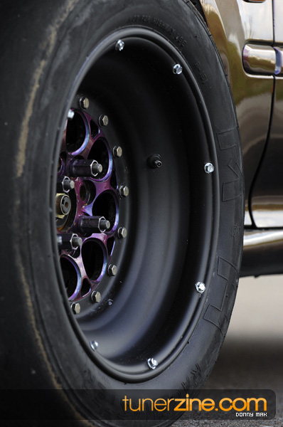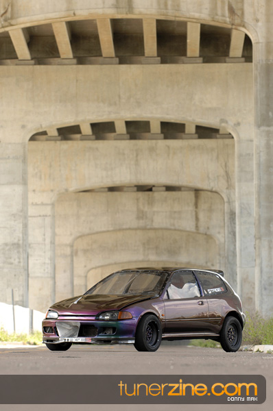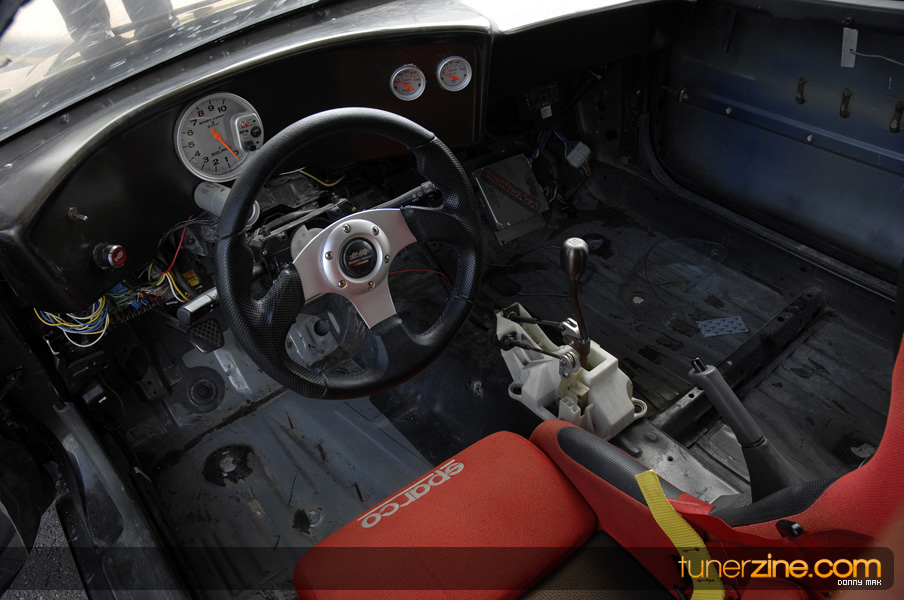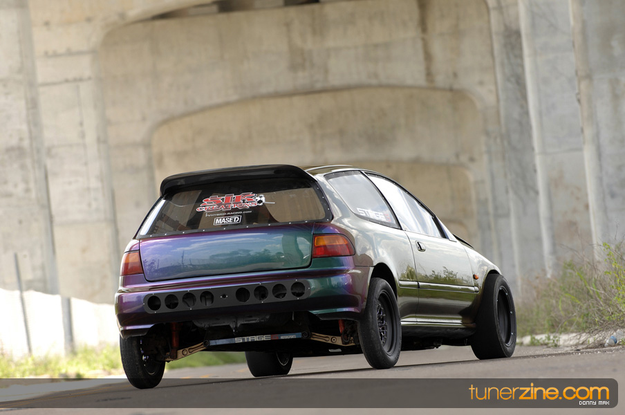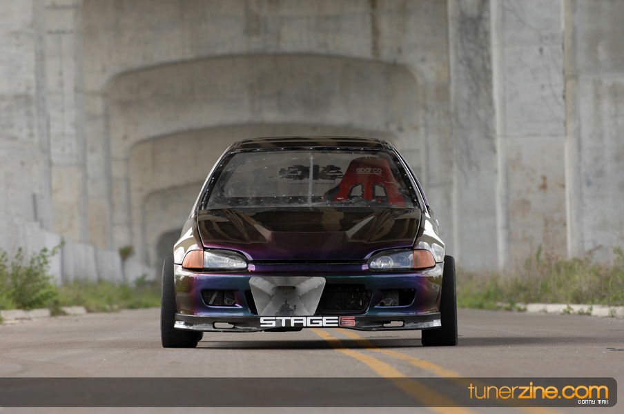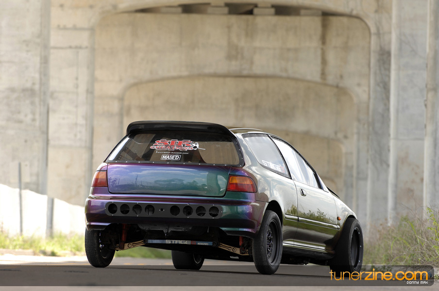 Suspension wise, the car aggressively deals with traction issues thanks to a set of Skunk2 Drag sleeveovers with KYB AGX struts. 23-inch slicks on 14-inch Welds are bolted on each corner sporting a similar paint scheme as its brethren Civic. Styling is consistent with the turbo EG with a Spoon Sports-style carbon fiber spoiler, custom blue/green Chameleon paint and all the windows replaced with lexan. The interior is simple with a set of gauges and a Sparco seat.