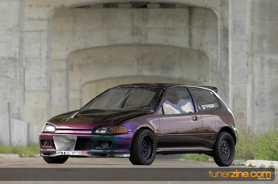Suspension wise, the car aggressively deals with traction issues thanks to a set of Skunk2 Drag sleeveovers with KYB AGX struts. 23-inch slicks on 14-inch Welds are bolted on each corner sporting a similar paint scheme as its brethren Civic. Styling is consistent with the turbo EG with a Spoon Sports-style carbon fiber spoiler, custom blue/green Chameleon paint and all the windows replaced with lexan. The interior is simple with a set of gauges and a Sparco seat.
