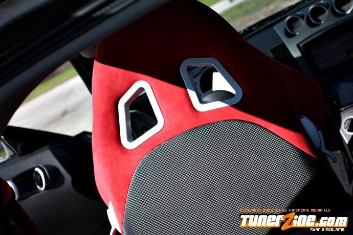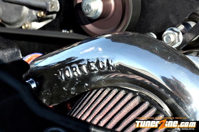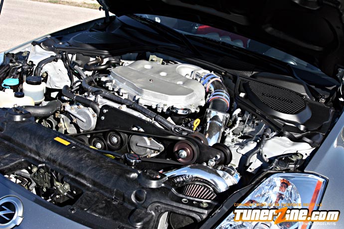 Peeking underneath that Seibon hood is a polished Vortech supercharger kit. Equipped with a full front mount intercooler and blow off valve, this Vortech supercharger kit is complete for 374rwhp and 307 lb-ft of torque. Efficiently feeding more air into the VQ motor is a Crawford Z plenum with a full Tanabe exhaust system to expel the cycled fumes.