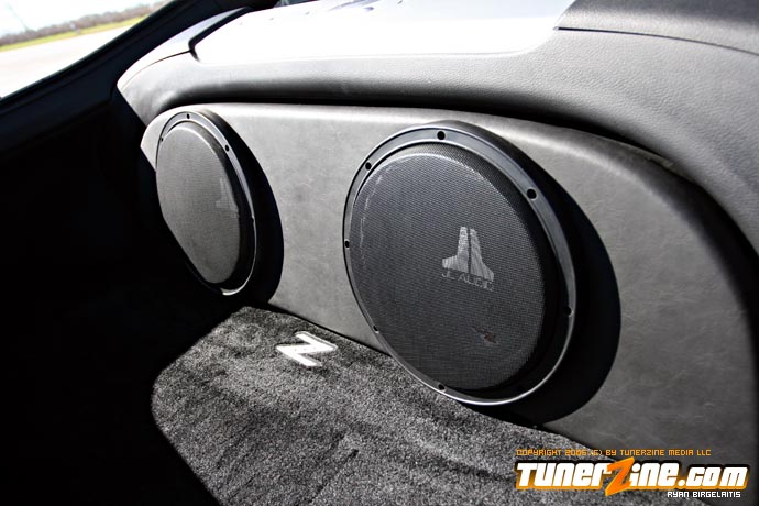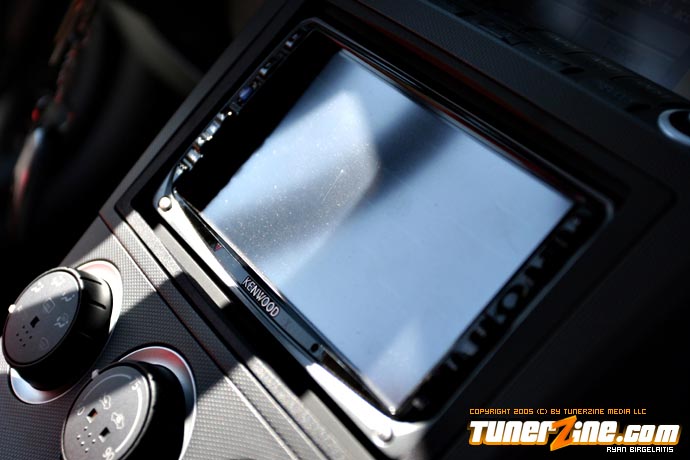 What lies inside for the daily driver of this extremely fun-to-drive 350Z? The stock leather seats were scraped for Sparco Milano units. From the center console is a Kenwood DXX7015 head unit that helps power the bright Focal Utopia components in the front and the coaxials in the rear. Providing some extra bass to the entire package are two 10″ JL Audio W3V2 subwoofers in a custom fiberglass enclosure. A custom amp rack was also built for two JL Audio amplifiers that help power the subwoofers and the high end Focal speakers. The 350Z has a finishing touch of entertainment with a Sony PS2 that should be equipped with Gran Turismo 4 in the near future.
