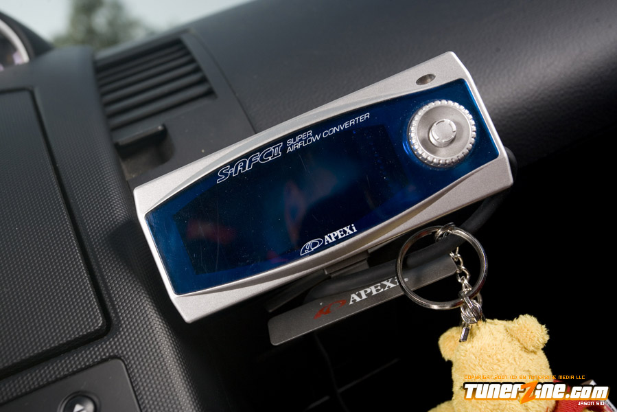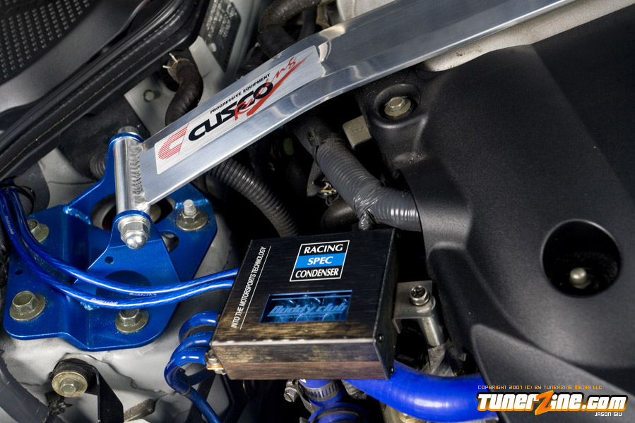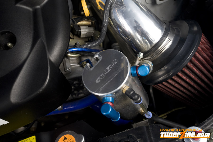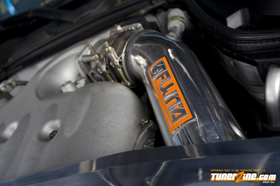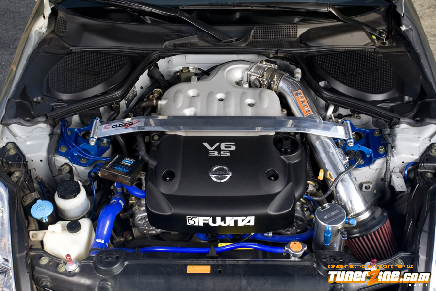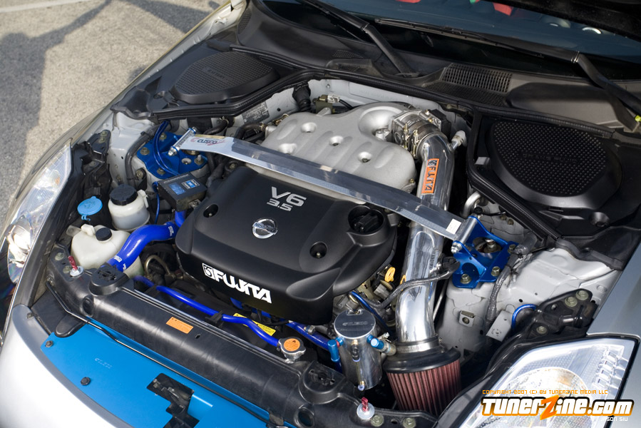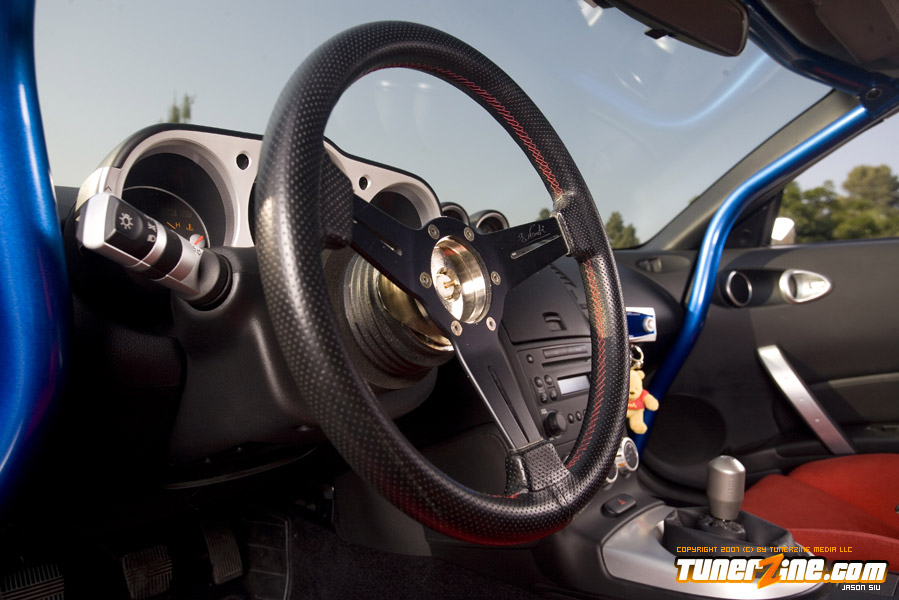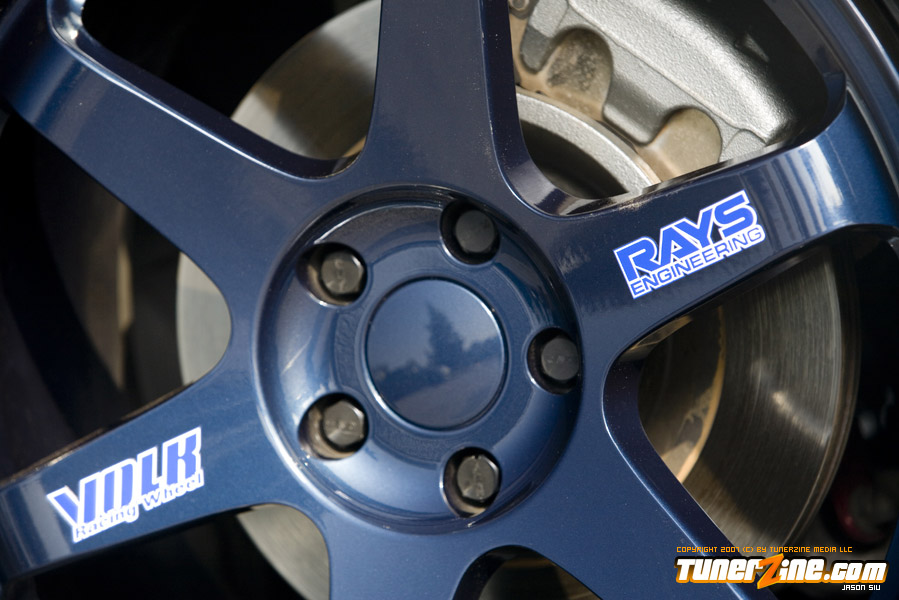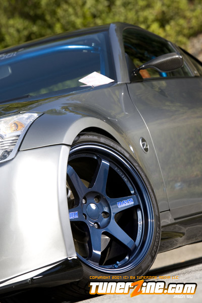 The car gets its menacing stance thanks to a set of A’PEXi’s N1 coilovers. These give Quan the adjustability he needs to ride in style on the street and to lower it for all the shows he contends at. Once the suspension was installed and the car was to the ground, Quan decided to bolt some new wheels onto his 350Z. After several different sets of wheels, Quan finally decided on an aggressive set of 19-inch Volk Racing TE-37 wheels. These lightweight TE-37 wheels aren’t your standard ones from Volk Racing however; they came in a custom Mag Blue finish, quite possibly the only set in the States! Up front is a 19×9.5 with 245/35/19 Dunlop Sport Max tires while the rear is now equipped with a wider 19×10.5 with 275/35/19 Dunlop tires. It’s without a doubt in anyone’s mind that these wheels really make the car. Finishing off the suspension modifications is a set of Battle Version control arms, Cusco front upper strut bar and a pair of front and rear lower tie bars from GT Spec.