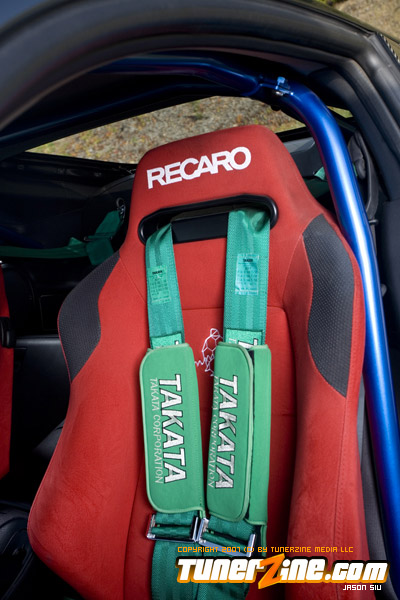 We then got the chance to open up the doors to Quan’s 350Z machine and climb inside the cockpit. The stock 350Z interior is geared towards any spirited driver, so we knew the upgrades wouldn’t be plentiful, but tastefully done. We quickly noticed the Cusco 6-point roll cage that helps stiffen up the chassis while a pair of Tommy Kaira Edition Recaro seats in their traditional red finish greeted driver and passenger. Takata 4-point harnesses with gel pads keep Quan and his passenger comfortable while the stock steering wheel has been replaced with a Nardi Classic 330mm unit. The stock shift knob was also tossed out for a Nismo GT style piece. The interior modifications are just the perfect amount to make Quan’s daily drive even more fun and comfortable.