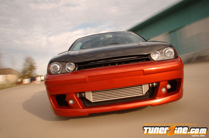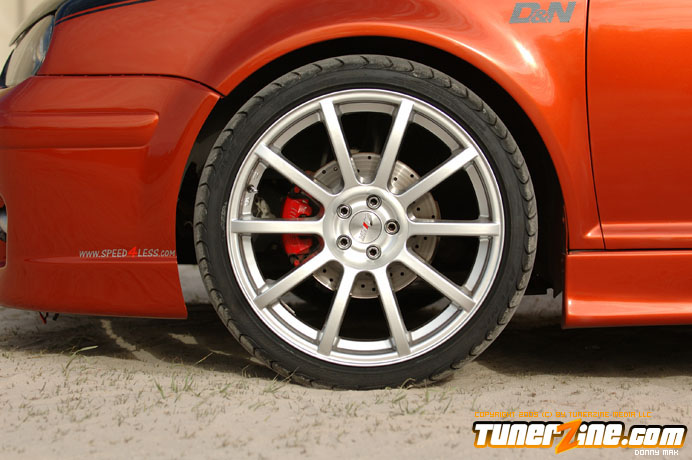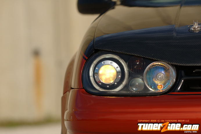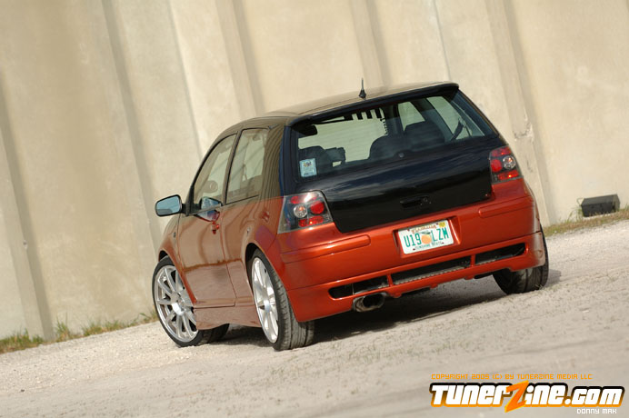 Back out to the exterior and the eye-catching two tone paint job: black and blazing copper makes for a wicked blend on this VW. With shaved side moldings and a shaved hatch, the car was perfectly smooth for the paint to be laid on. Helping give the Golf a whole new look in life is a full European Rieger R-RX body kit. The stock hood was scraped for a matching Rieger Boser carbon fiber hood. Only other carbon component seen on this Golf is out in the rear with a Eurojet carbon fiber rear spoiler.