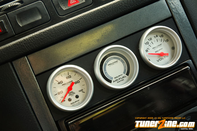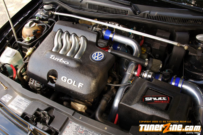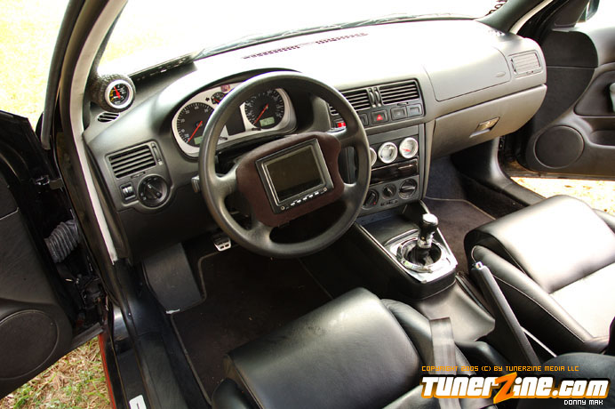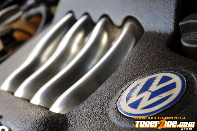 Starting off with the motor, the entire long block received an overhauling with the block bored out to 83mm and slugged with 8.75:1 compression Wiseco pistons. The head received a 3 angle and radial valve job and was reassembled to make way for the new custom turbo kit. Powering the newly built motor is a T3 50-trim Master Power turbo. From the turbo out is a 2.5″ downpipe and custom stainless steel exhaust system. Boost is handled with a 35mm TiAl wastegate with an open dump tube. Additional fuel is key with the boosted setup to achieve maximum horsepower so a Bosch Boost fuel pressure regulator along with 35lb injectors were thrown into the mix. Some turbo goodies from Forge play a huge role with their twin piston blow off valve and front mount intercooler. All the intake side piping was custom mandrel bent from polished aluminum piping. Handling the tuning side of the new package is a Neuspeed custom Turbo Chip and a Perfect Power STM6 piggy back management system. Controlling both fuel and timing, the STM6 system helps gives the Autometer gauges accurate readings. Raising the boost level is made easier with a Turbo XS boost controller. This VW is set for all heavy volumes of force induced air with the aid of a 3″ MAF housing. Getting the power to the ground is a VR6 clutch and flywheel combo.