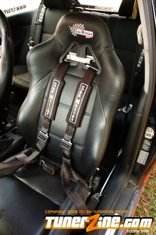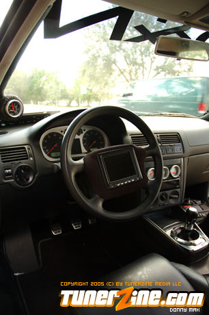 As mentioned before, nothing in the interior was skipped over either on this Golf package. A TV screen has been implemented into the steering wheel and reupholstered in suede. 4-point harnesses are draped over leather seats along with a center console trim painted. The Autometer boost gauge rest in a custom a-pillar mount and a custom aluminum digital camera mount shares the fun with everyone. Audio fills the entire cabin with two 12″ Blaupunkt subwoofers and a Sony X-Series cd player. Powered by a Crunch amplifier, the subwoofer and amplifier are all enclosed in a custom fiberglass enclosure.