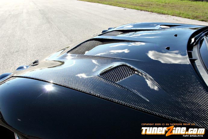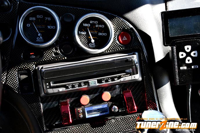 Taking our eyes off the entire exterior, we can take a seat inside the RX-7 and admire its abundance in carbon fiber components. A series of Autometer carbon fiber gauges are in the cockpit along with a MOMO Tornado steering wheel and GReddy weighted shift knob. Torasports helps accent all the carbon fiber with genuine interior dash and door pieces. The seats were custom wrapped in a carbon fiber material and GReddy four-point race harnesses drape majestically over each one. Several Pioneer audio components brighten up the interior of the 7, with an Alpine 12″ sub in a custom enclosure providing the bass.