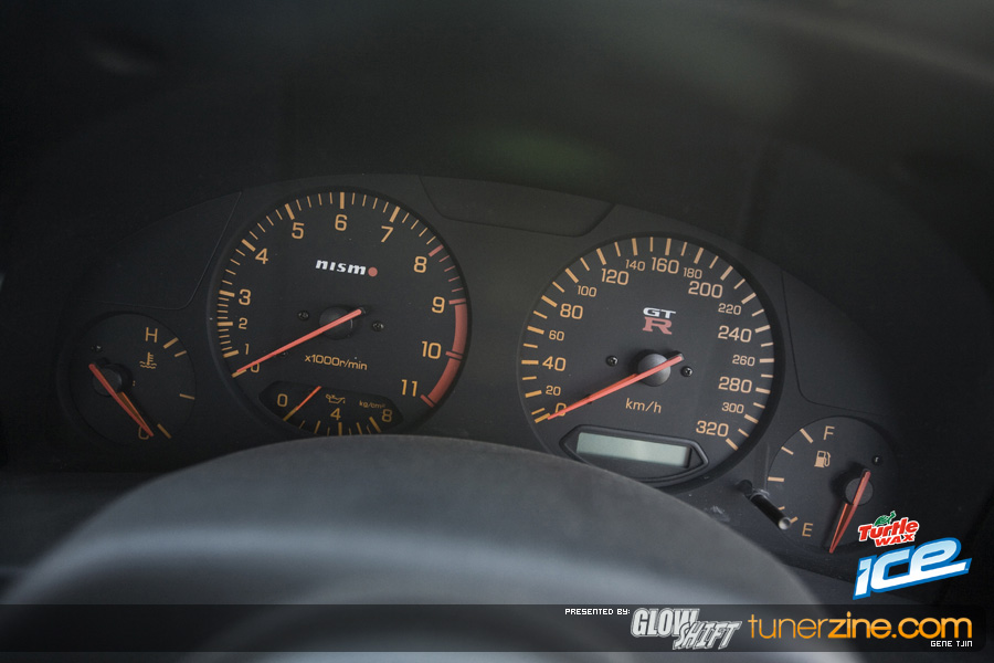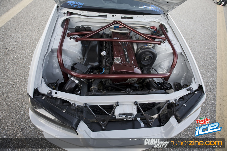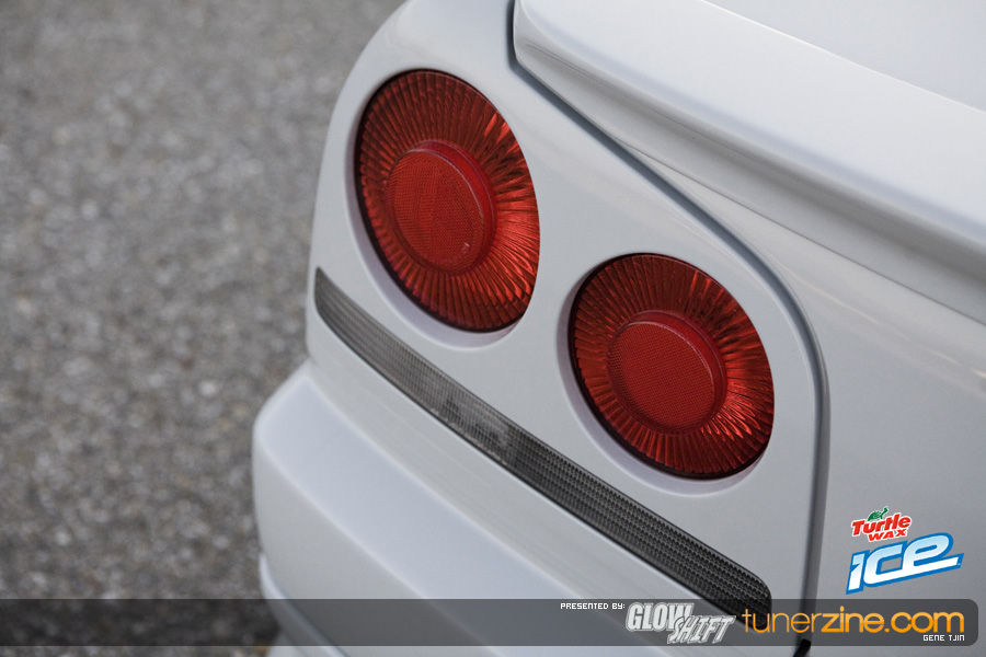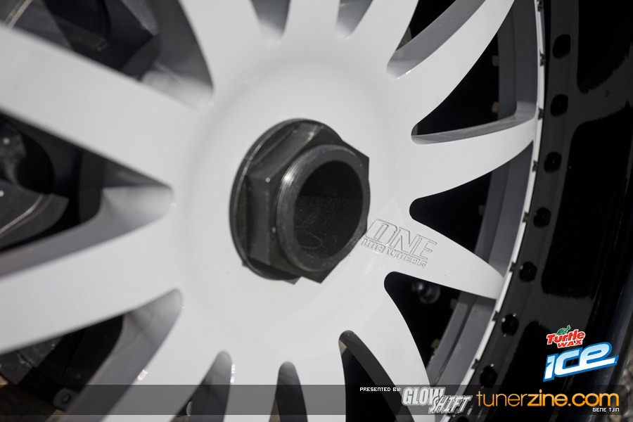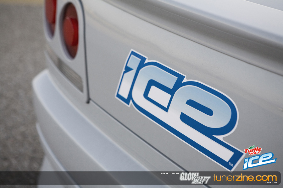 To start it off, the Tjin Edition / ICE Skyline R34 was completely repainted during the 2008 off season to a custom PPG Battle Ship Grey on the outside thanks to Martin Auto Color. The interior was also resprayed to match the new exterior Grey color while the Unique Fabrication roll cage remains Maroon to offset and contrast the car. Another huge change on the outside is the addition of One Lug Wheels’ unique rollers. The Skyline completes the race bred style with one-off 20×10-inch and 20×11-inch OLW-4 wheels. The centers have been color match painted while gloss black lips, black bolts and center locking nut makes everyone take a double look. These One Lug Wheels are certainly looking very interesting and we’re excited to see them out on the market and on more vehicles. Tjin Edition and the Turtle Wax / ICE team decided to wrap up these three-piece one lug wheels with Falken Tires. The front 20×10″ OLW-4 wheels are matched up to 255/35/20 Falkens, while the rear 20×11″ are matched up to 275/35/20s.