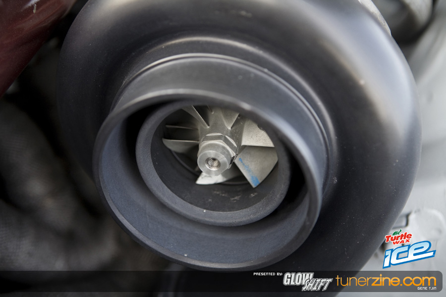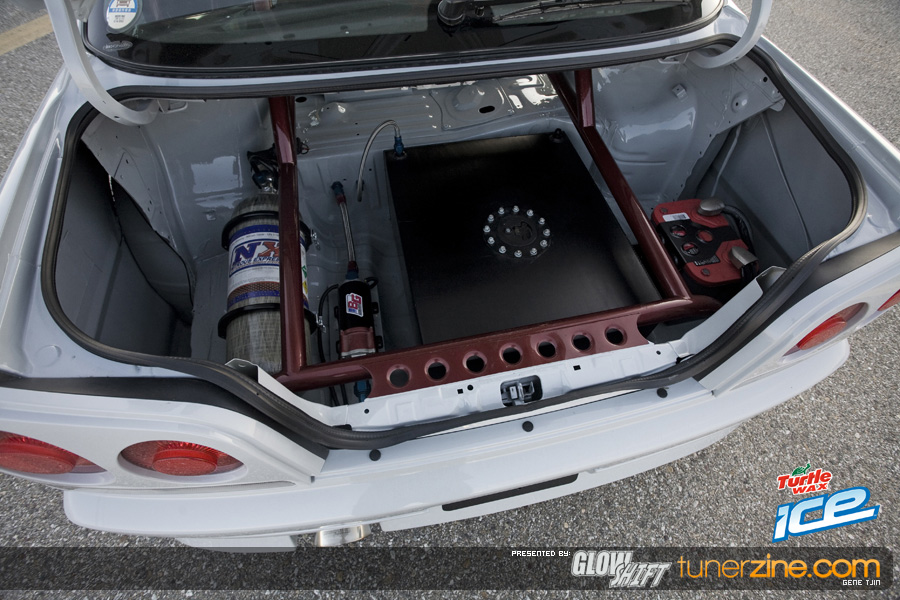 Back to the exterior, for those that haven’t kept tabs on this car the last few years, the entire body has been widened with a URAS 10-piece body kit. The front has been widened 20mm while the rear has been widened a massive 40mm to easily fit the 11-inch rear wheels. Plenty of shaving work went into the car as well, with the front and rear emblems, door handles, gas door and third brake light all gone from the car giving it a nice and smooth finish. The front bumper was also customized to accommodate the massive Bell Intercoolers front mount intercooler. Magic Touch hidden door poppers gives the team access into the cabin.