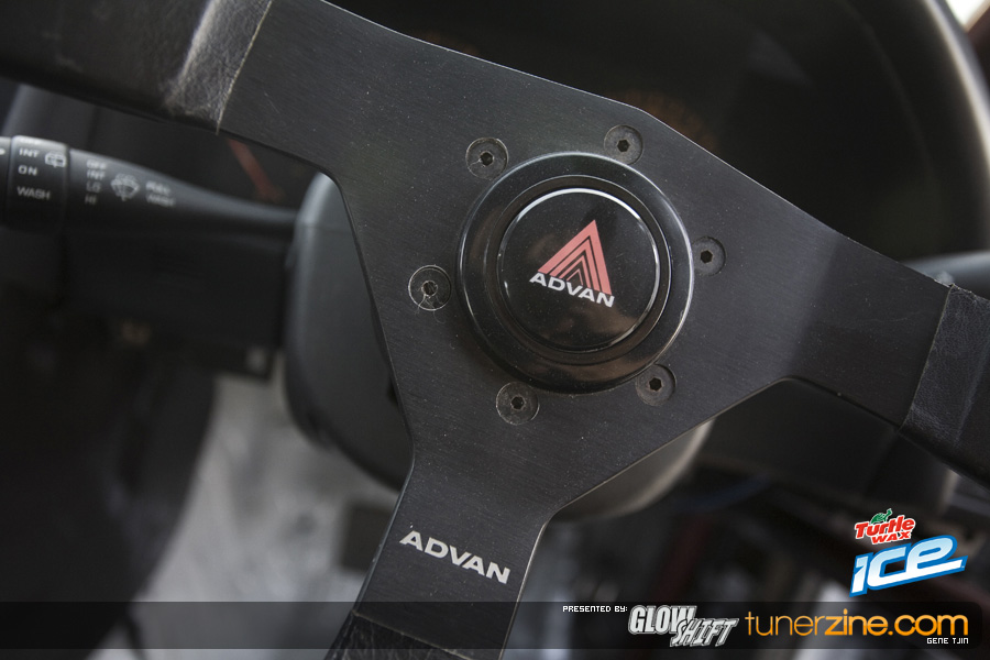 Under the hood that’s held up with custom TEIN hood struts is the coveted Nissan RB26DET 2.6l turbocharged motor. Freshly rebuilt, the RB26 has been balanced and blue printed and custom port and polished heads. NISMO gaskets replace virtually every gasket on the powertrain while a NISMO water pump and custom catch cans complement the engine. A custom fuel injection system fully equipped with 1000cc injectors supplies the fuel that’s needed for the massive GT42R turbo from Garrett. BDL Industries played a big role with a custom 100mm throttle body and cam gears. On the exhaust side is a Unique Fabrication turbo manifold that leads out to an ID Tuning 4-inch downpipe and through a custom 4-inch cat-back exhaust from Magnaflow. On the intake side the masterminds at Unique Fabrication came up with a custom intake manifold. For cooling along with the massive Bell Intercoolers front mount intercooler is Vibrant 4-inch intercooler piping and PWR radiator. A TiAL blow off valve and wastegate handles the rest of the turbo kit accessories. The engine bay has been overhauled with powdercoated black intercooler piping, turbo and engine accessories. The Skyline GT-R valve cover has been color matched as well as the one-off strut bar. Last but not least, this RB26DET fires up beautifully thanks to a custom FAST engine management stand alone system.