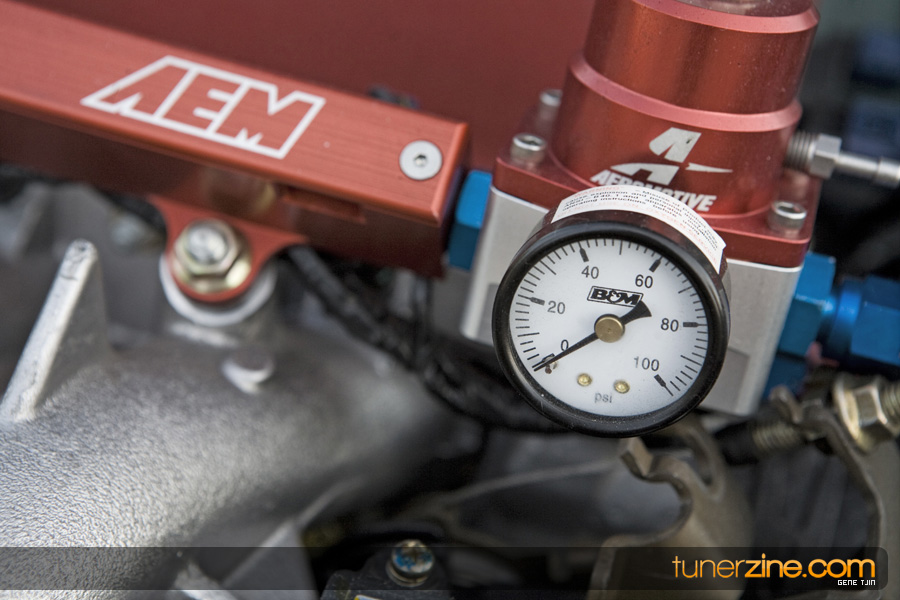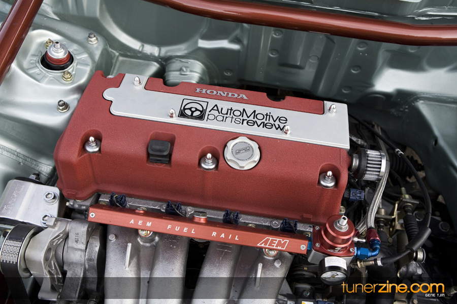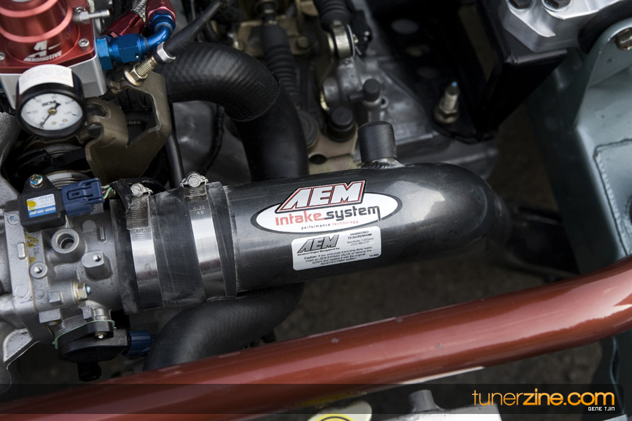 First on was a complete set of Skunk2 suspension components – coilovers, control arms, camber kits, tie bars – you name it, its got it. Then went on the Wilwood big brake upgrade up front, while the rear received upgraded rotors and Project mU brake pads. After that, the K-Series engine with a full wire tuck courtesy of Plan B Motorsports. Bolt-ons for the K-Series came from R-Crew Racing and Skunk2: race header and full exhaust. Fuel delivery was handled with Aeromotive and AEM components with custom fittings and lines snaking all the way to the rear fuel cell.