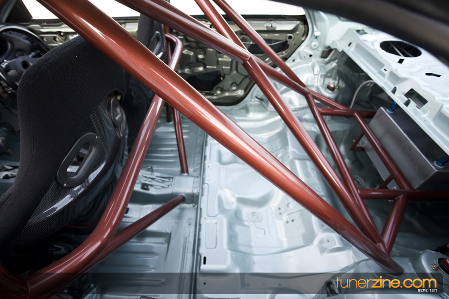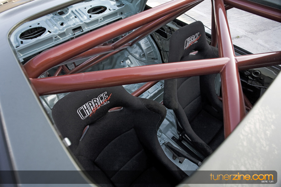 Then came the show aspect of the vehicle. As things started coming together, Jason started working within the industry in attempts to having the finished vehicle showcased at SEMA 2006. It seemed far out there for any manufacturer to take on a 12 year old car for a SEMA car, but Jason really thought he’d be able to push the envelope once the project was complete. Everything possible was shaved off the vehicle from inside the interior to its door handles and moldings. They also went to town in the engine bay, removing the stock master cylinder and brake booster and shaving up every hole imaginable. The cage also found its way into the bay, making it extra unique to the scene.