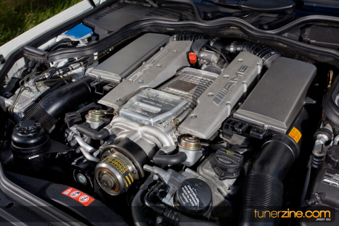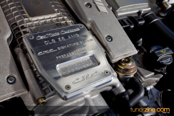 A first glance at the engine bay reveals that it means business. The custom Carnutz plaque hides a plethora of EvoSport Evolution power goods. EvoSport’s Evolution 1 and Evolution 2 power packages have been thrown onto Mike’s CLS55 bringing horsepower from a tame cruiser to a real street bruiser. The Evolution 1 power package comprises of a series of lightened pullies, and ECU software. The Evolution 2 power package is what makes this CLS55 breathe freely: “shorty” performance headers along with 8mm spark plug wires and more aggressive ECU tuning. Their cooling package along with their 80mm throttle body upgrade gives a ton of extra flow for this supercharged V8 beast.